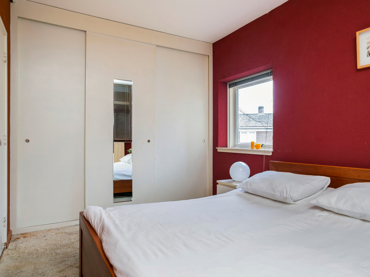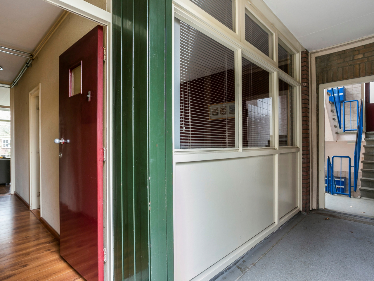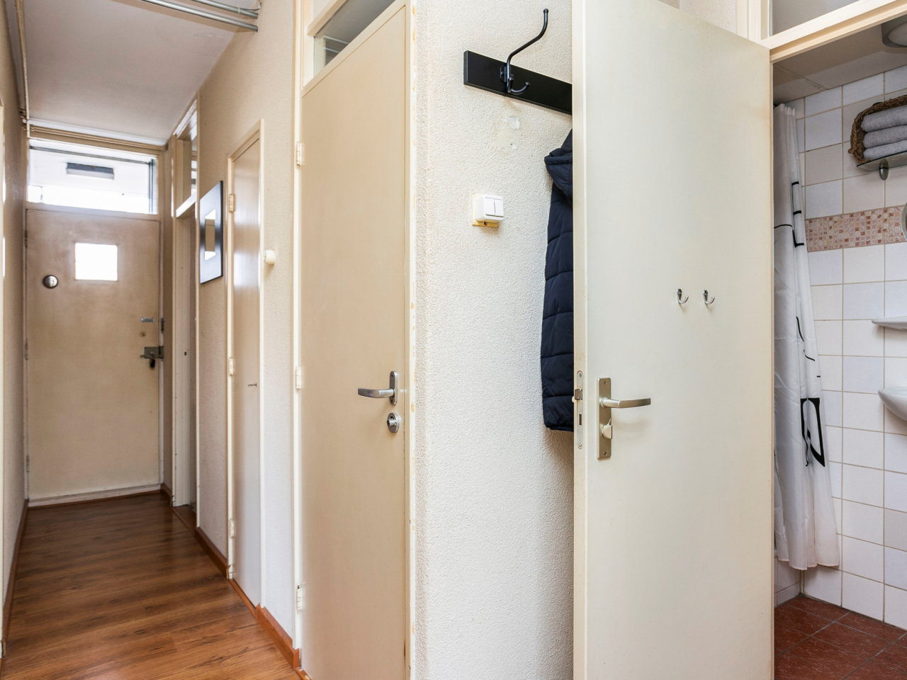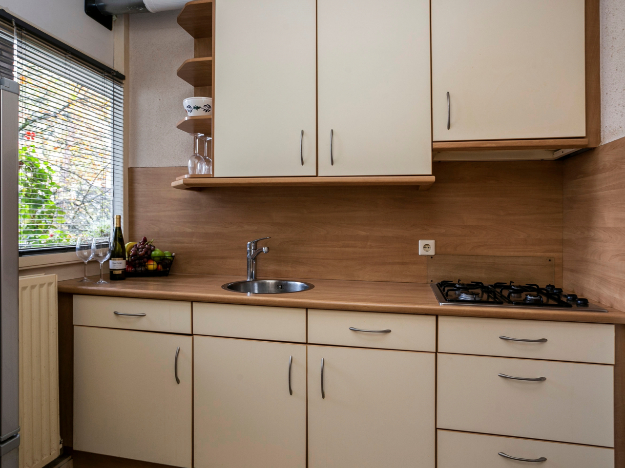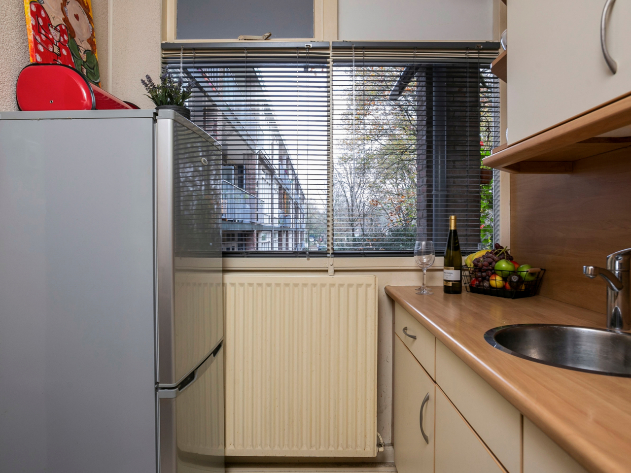De dichte keuken met lichte kleurstelling ligt aan de galerijkant en is voorzien van een gaskookplaat, losse koelkast en diverse opbergkasten. Nis met daarin de CV-ketel (Remeha, 2020) en de aansluiting voor de wasmachine. Ruime slaapkamer met kastenwand aan de galerijkant.