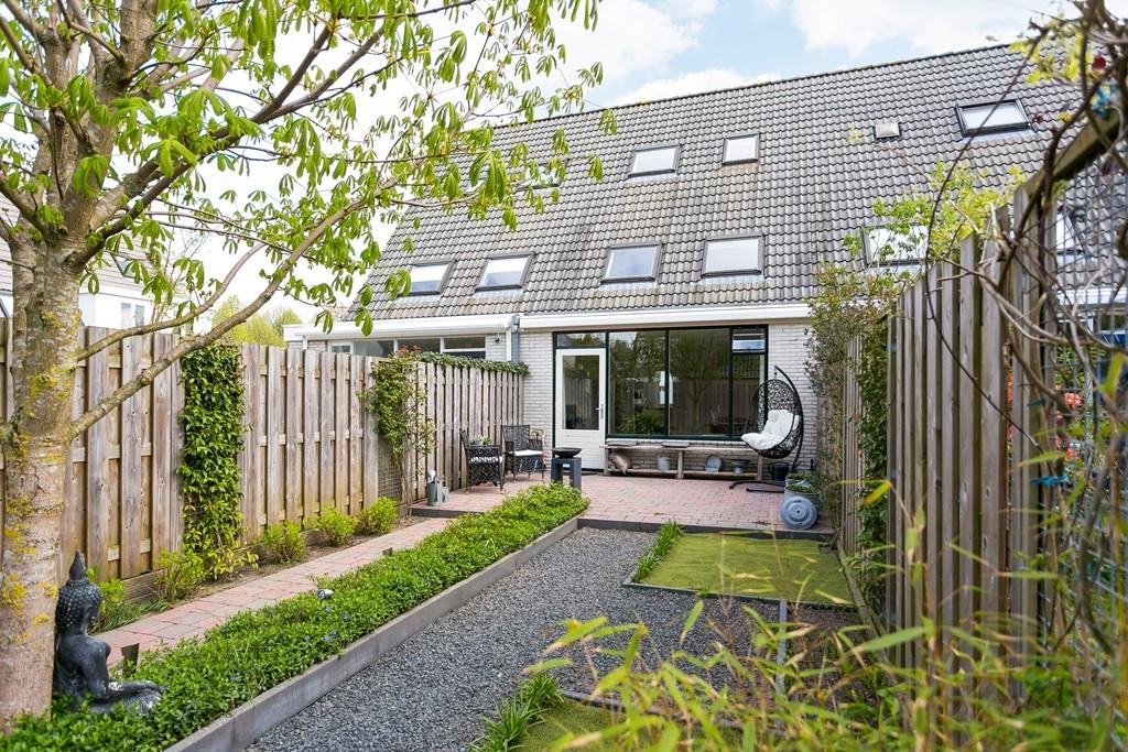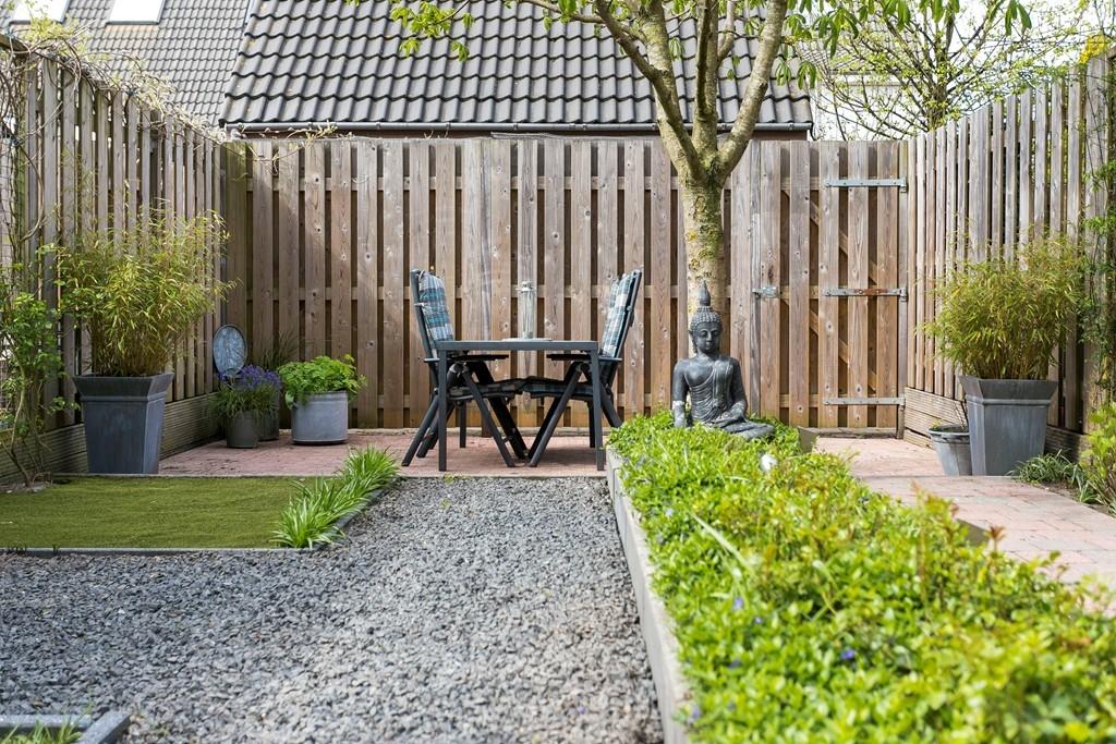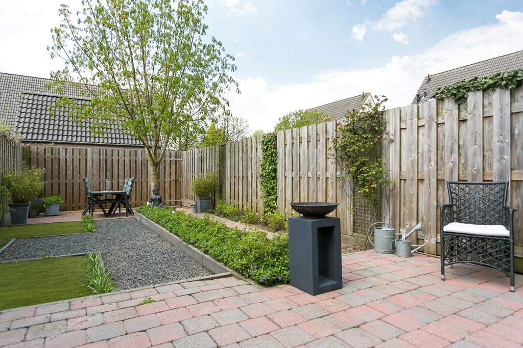 Fraai aangelegde onderhoudsarme tuin op het westen met achterom.
