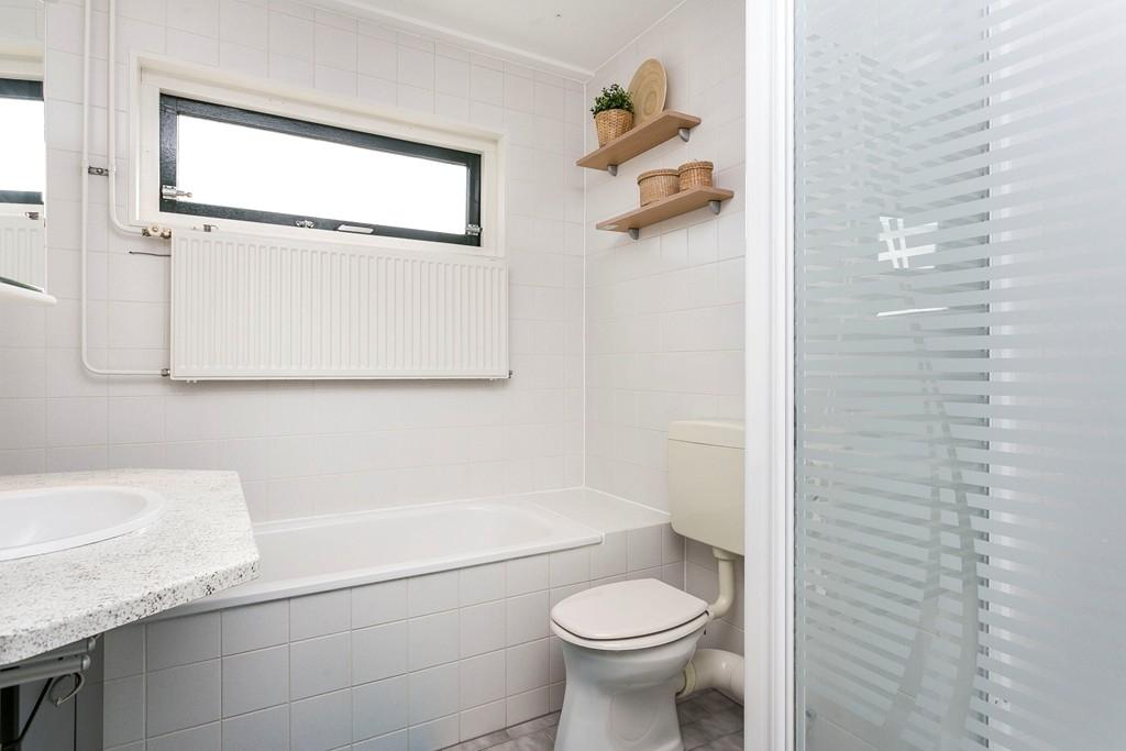 Overloop, drie ruime slaapkamers waarvan 1 voorzien van een vaste kast en allen met laminaatvloeren. De badkamer is voorzien van een bad, douchecabine, 2e toilet en een wastafelmeubel.