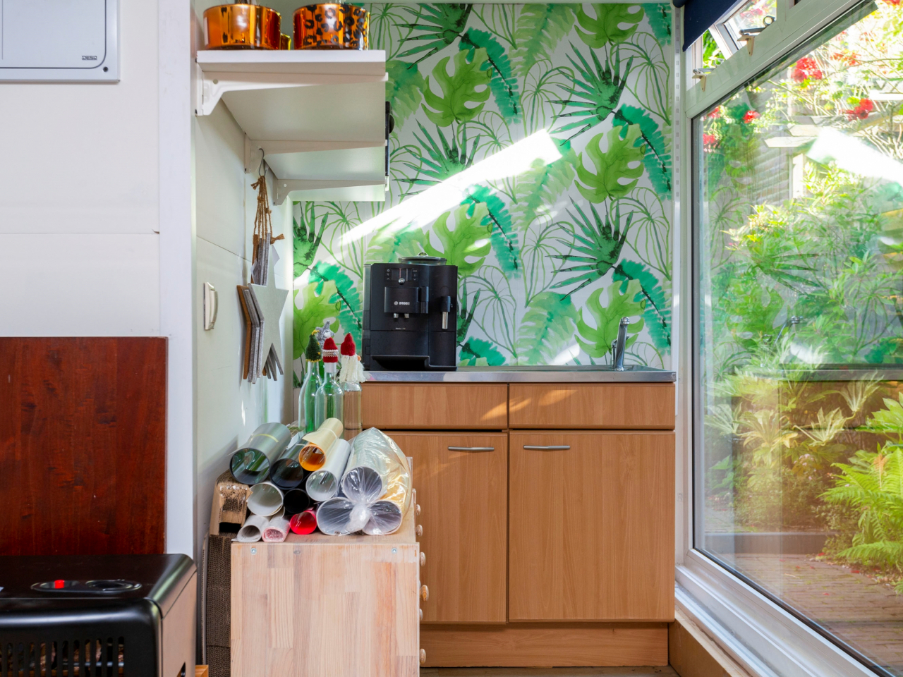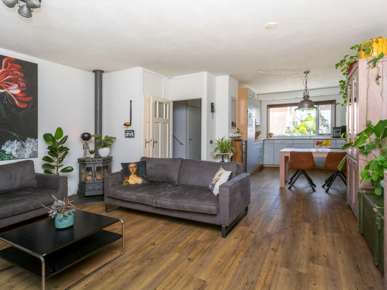 Ruime woonkamer voorzien van PVC-vloer met comfortabele vloerverwarming, handige trapkast, een deur en eveneens openslaande deuren naar achtertuin. De woonkamer is daarnaast nog voorzien van een gezellige werkende houtkachel, welke jaarlijks wordt gereinigd en onderhouden. Vanuit het zitgedeelte heeft u uitzicht over de bijzonder fraaie tuin. Er is voorts een open keuken met L-vormige keukenopstelling voorzien van een 4-zones inductie-kookplaat, afzuigkap, koelkast, vaatwasser, voldoende opbergkasten en als bonus een fijn vrij uitzicht.