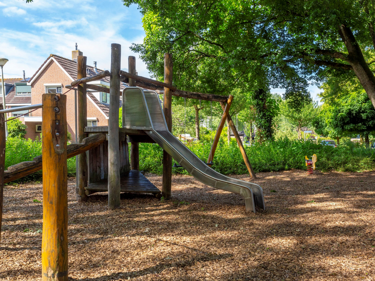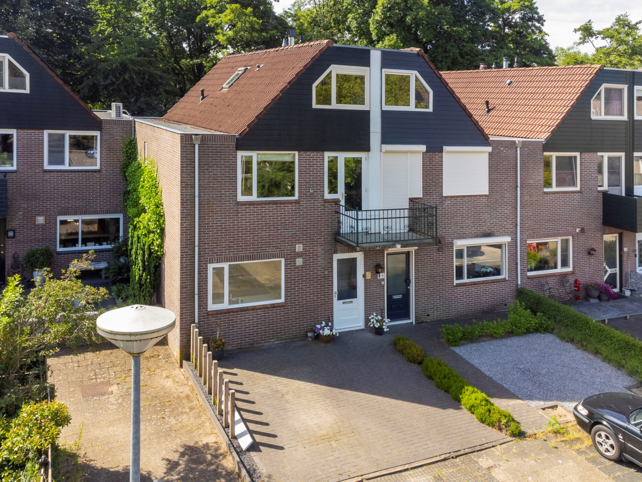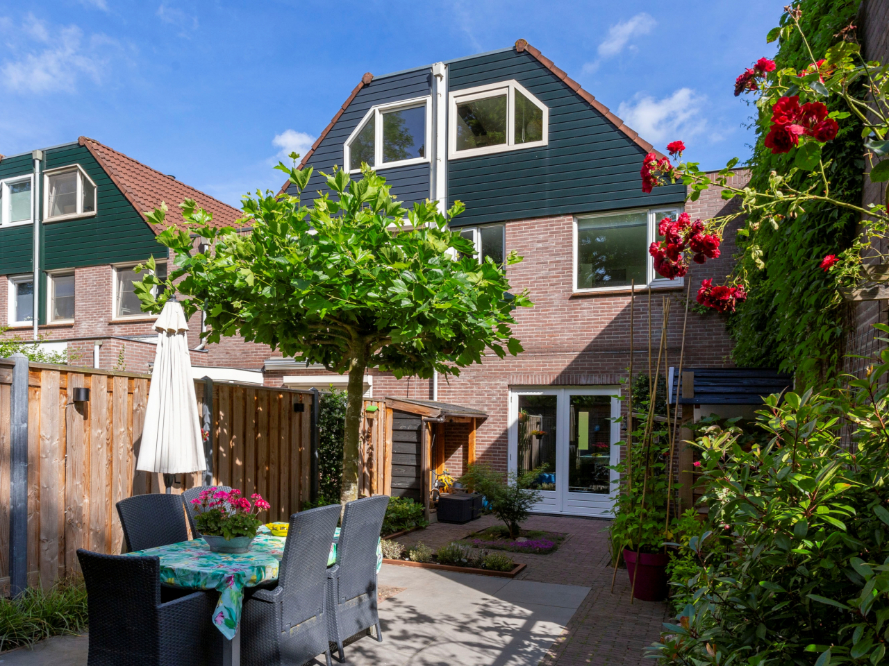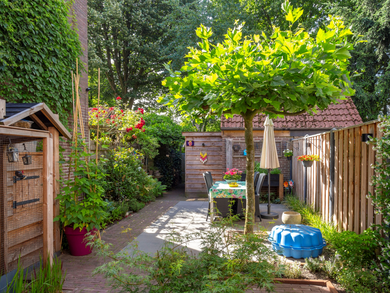 Prachtig aangelegde en vrij gelegen achtertuin met een combinatie van klinkers en grote tegels, borders met veel planten en bloemen en een parasolboom voor extra schaduw in de zomermaanden. Echt een geweldige tuin om te genieten van de mooie dagen! Via de achterom komt u bij een mooie groenstrook waar zich iets verderop een kleine speeltuin bevindt. De woning ligt ook op loopafstand van het Veldhuizerbos.