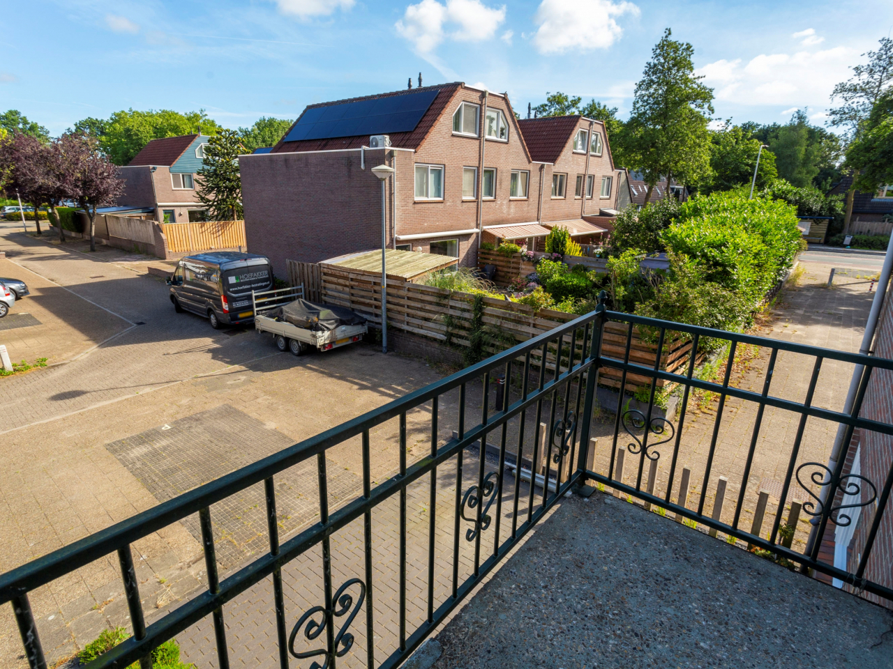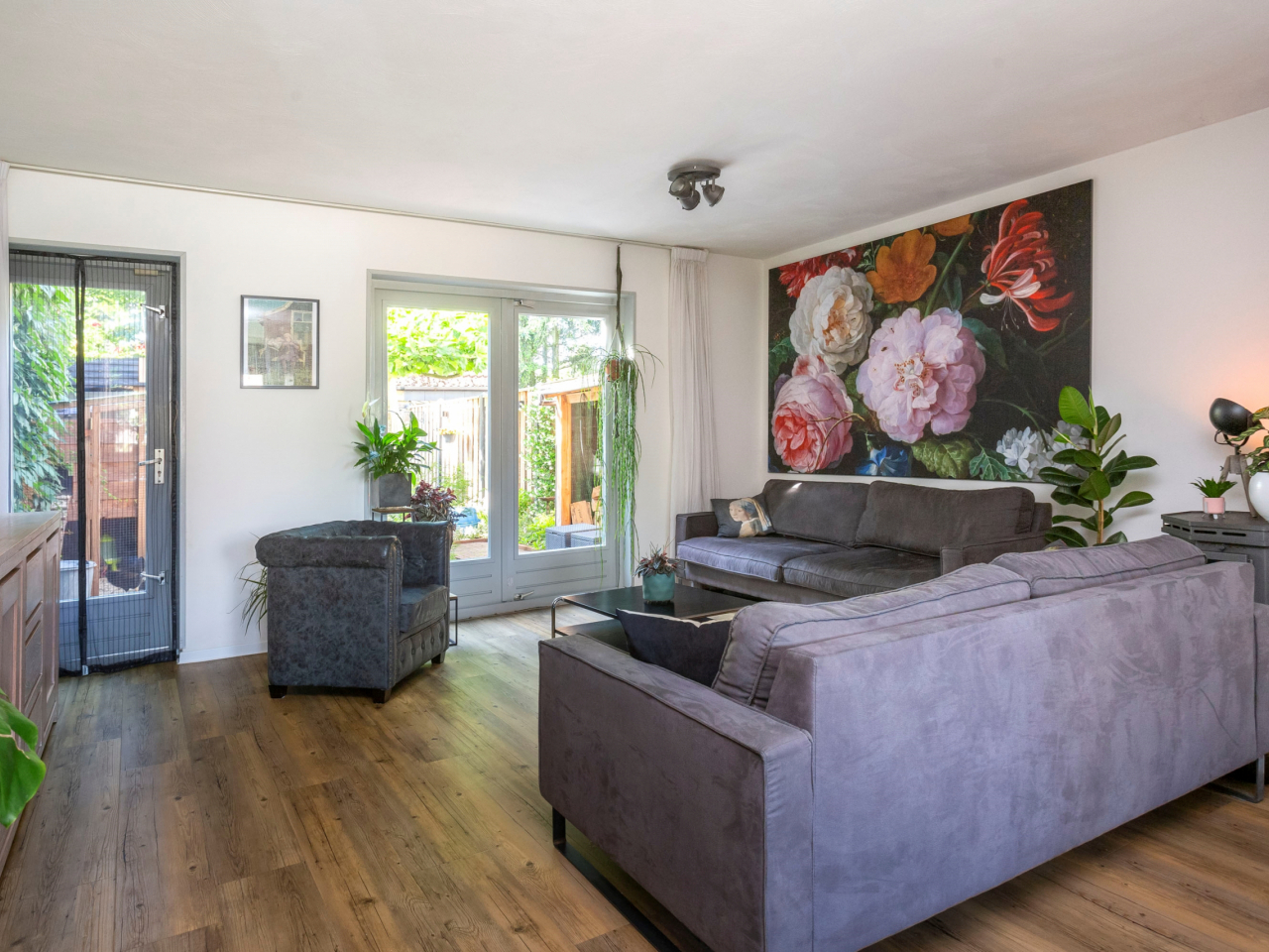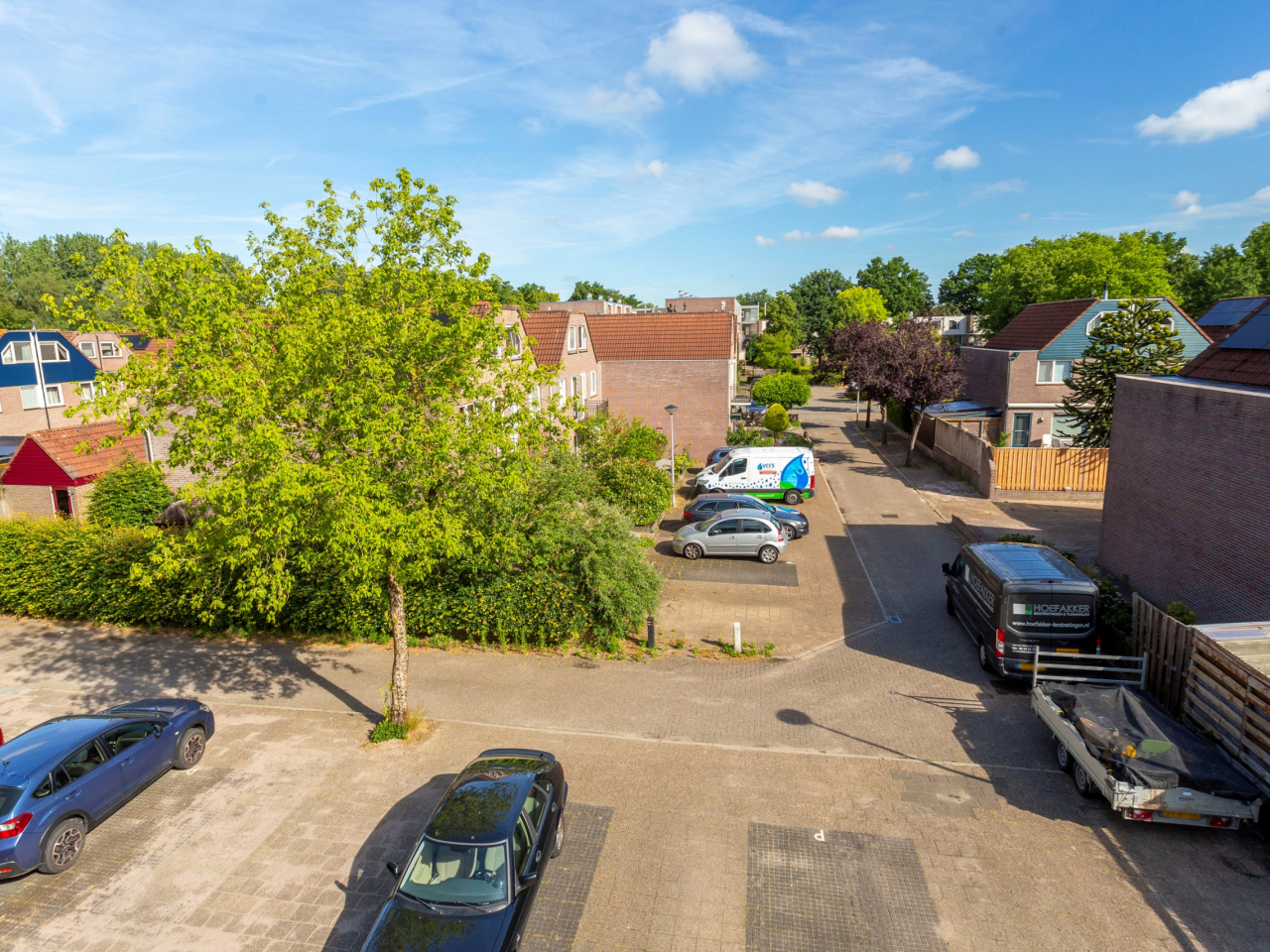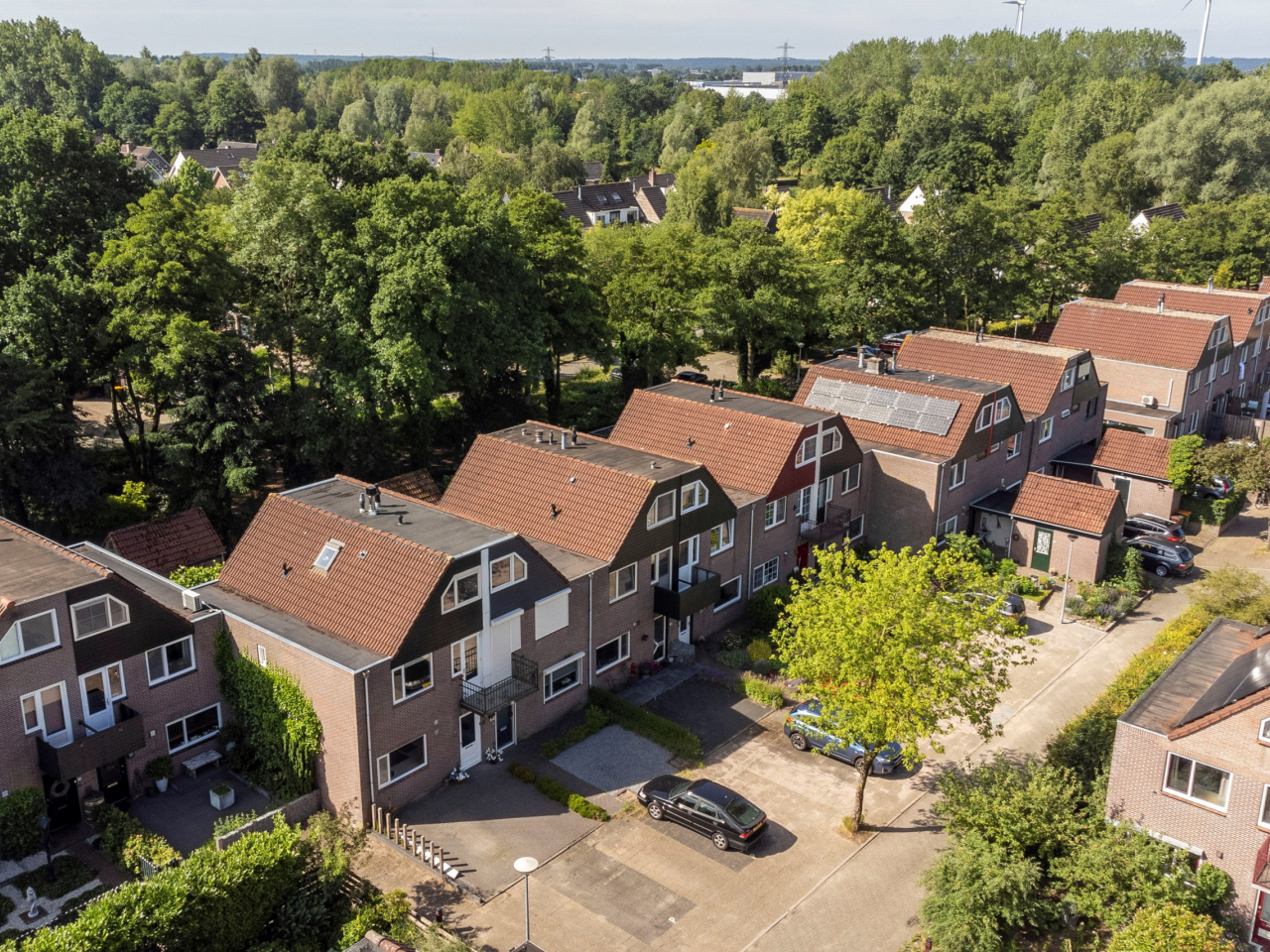 Prachtig aangelegde en vrij gelegen achtertuin met een combinatie van klinkers en grote tegels, borders met veel planten en bloemen en een parasolboom voor extra schaduw in de zomermaanden. Echt een geweldige tuin om te genieten van de mooie dagen! Via de achterom komt u bij een mooie groenstrook waar zich iets verderop een kleine speeltuin bevindt. De woning ligt ook op loopafstand van het Veldhuizerbos.