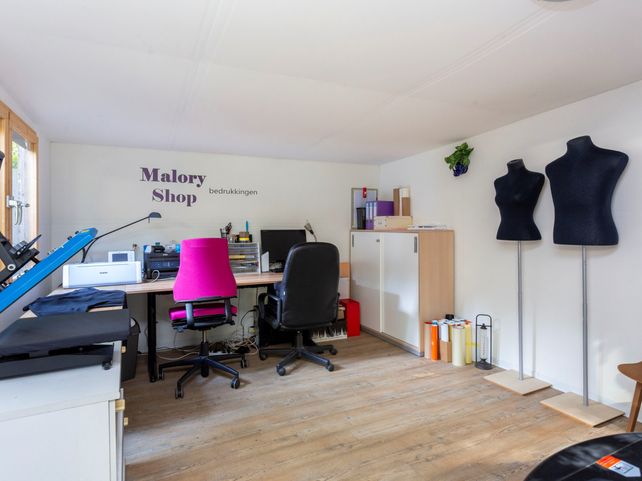 In de achtertuin is een met pannen gedekte stenen berging gelegen, alsmede een geïsoleerde houten schuur die momenteel in gebruik is als kantoor. Dit ruime kantoor met elektra, stromend water, internet-aansluiting en een klein keukenblok is de ideale plek voor een hobbyruimte of werkplek.