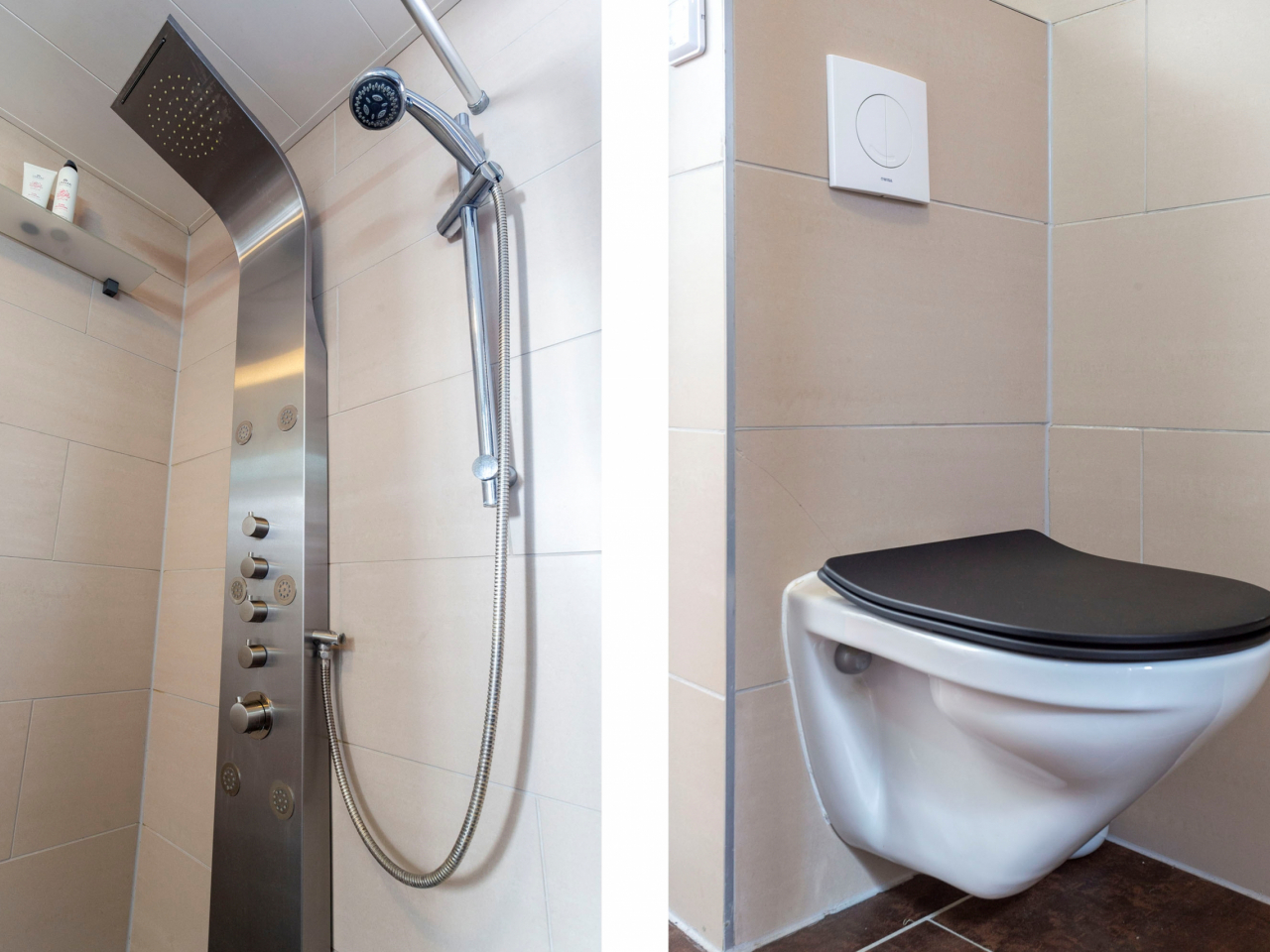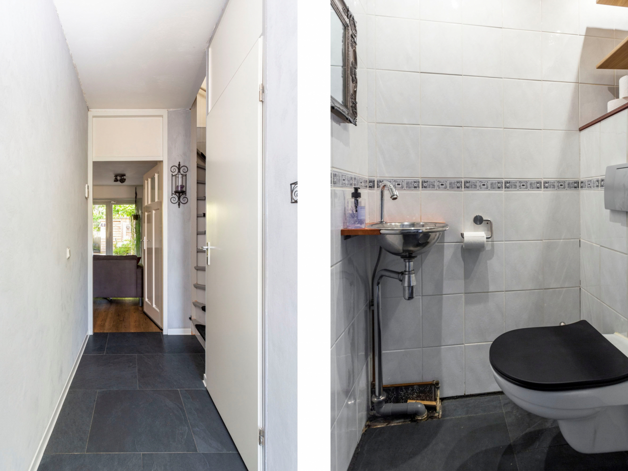 Entree, hal met tegelvloer, trapopgang, in 2021 vernieuwde meterkast (8 groepen/2 aardlekschakelaars), volledig betegelde toiletruimte met hangend toilet, fonteintje en een grote nis.