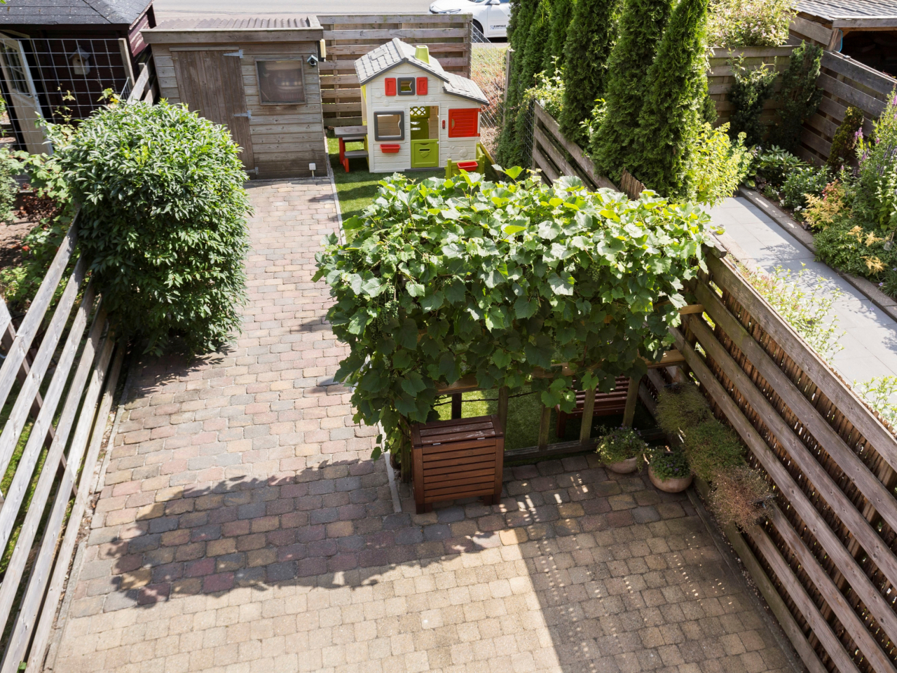 7. Fraai aangelegde achtertuin met bestrating en kunstgras en een extra houten berging voor