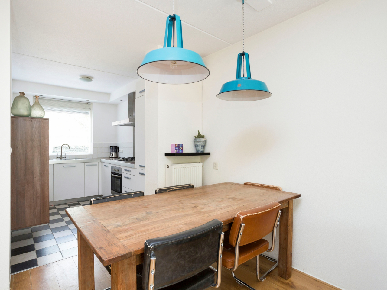 Entree, hal met meterkast (8 groepen + aardlekschakelaars) en een toiletruimte voorzien van een toilet en een fonteintje. Royale, goed in te delen doorzon- woonkamer met toegang tot de tuin en handige trapkast. De woonkamer is voorzien van een mooie eiken houten vloer. Open keuken met een moderne hoekopstelling met hout-look werkbladen en voorzien van een 5-pits gaskookplaat, afzuigkap, magnetron, oven, koel/vriescombinatie en een vaatwasser.