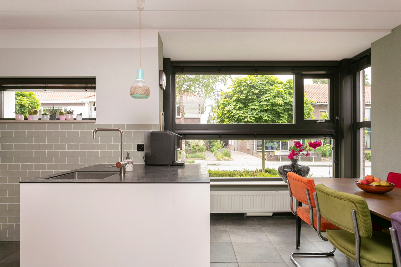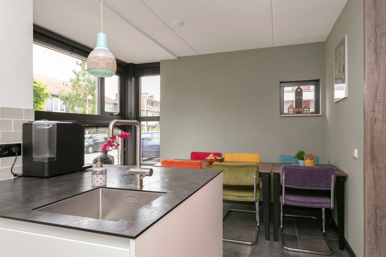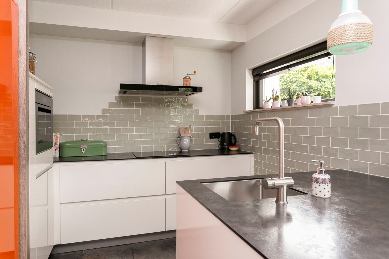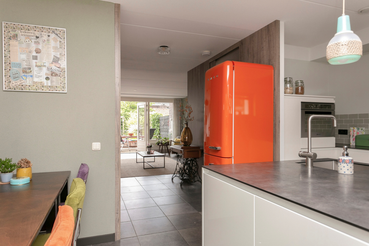 Via de hal met toilet en fonteintje en een garderobe-nis komt u via een schuifdeur in de woonkamer uit. Deze heeft een handige trapkast, een moderne plavuizen vloer en openslaande deuren naar de achtertuin. De woonkeuken ligt aan de voorzijde van de woning, is voorzien van een eiland en diverse inbouwapparatuur zoals een inductiekookplaat, afzuigkap, combi-oven, vaatwasser, een opvallende oranje Smeg koel/vriescombinatie en veel kastruimte met o.a. een apothekerskast. Er is hier tevens voldoende ruimte voor een eettafel.