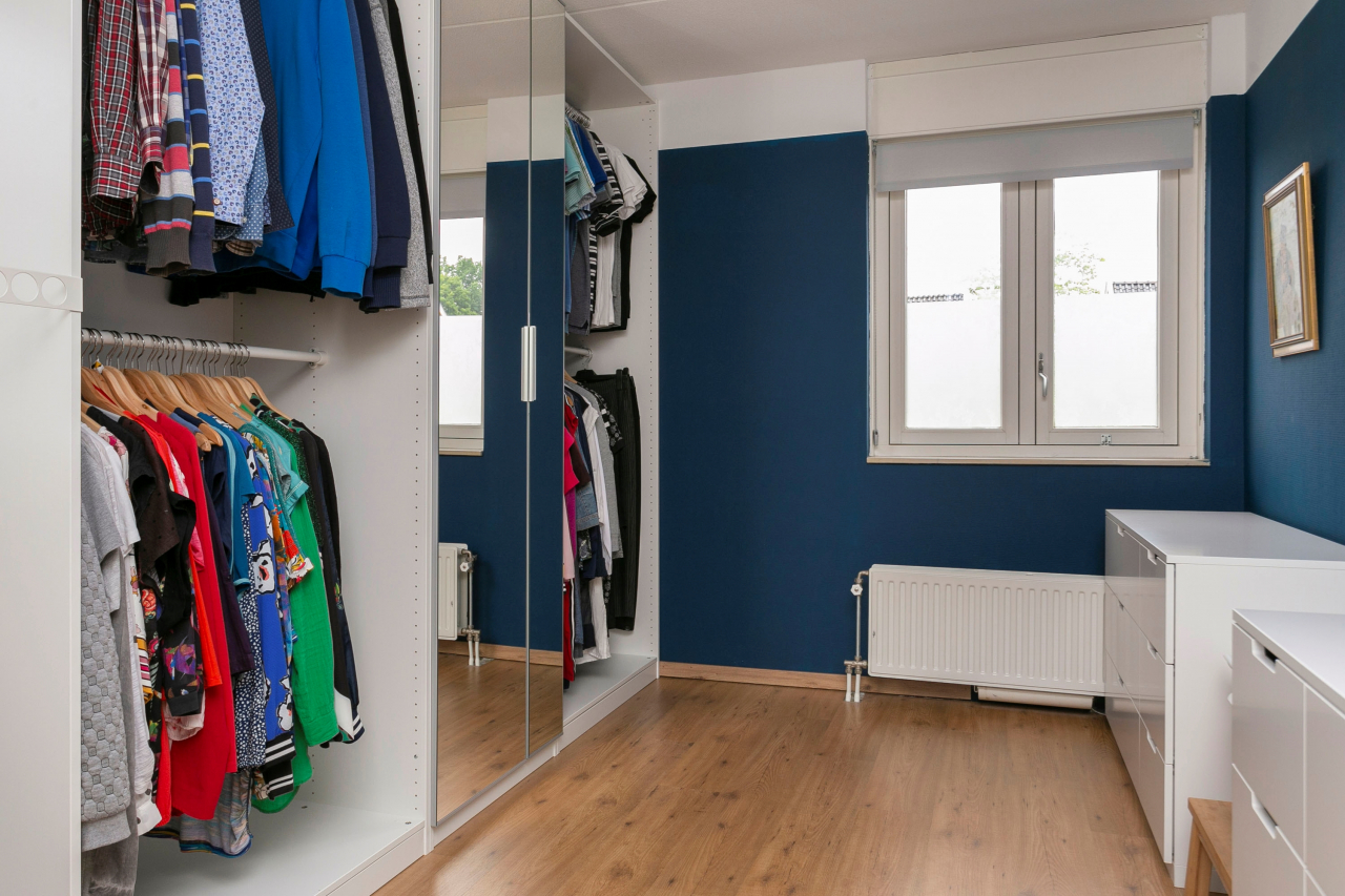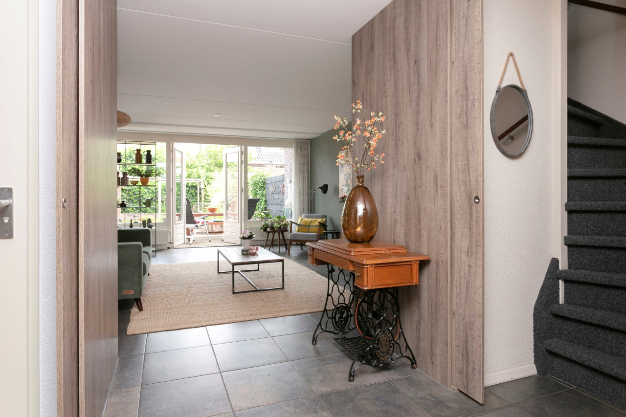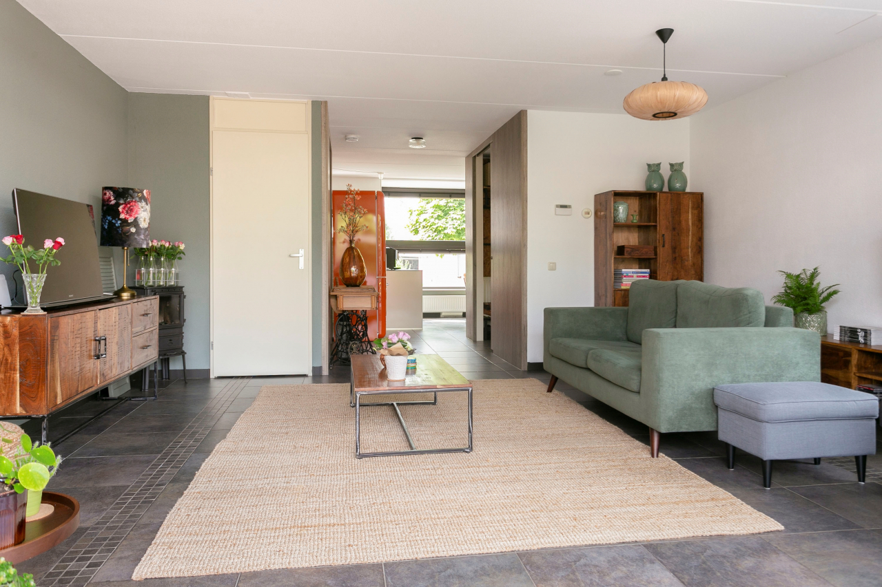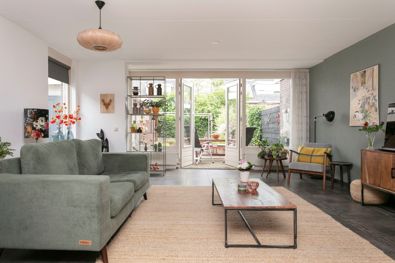 Via de hal met toilet en fonteintje en een garderobe-nis komt u via een schuifdeur in de woonkamer uit. Deze heeft een handige trapkast, een moderne plavuizen vloer en openslaande deuren naar de achtertuin. De woonkeuken ligt aan de voorzijde van de woning, is voorzien van een eiland en diverse inbouwapparatuur zoals een inductiekookplaat, afzuigkap, combi-oven, vaatwasser, een opvallende oranje Smeg koel/vriescombinatie en veel kastruimte met o.a. een apothekerskast. Er is hier tevens voldoende ruimte voor een eettafel.