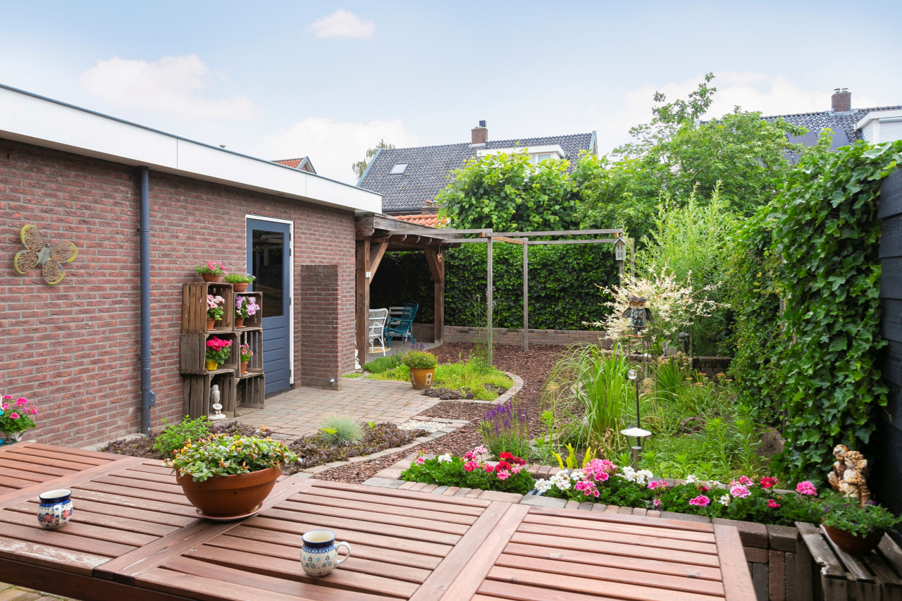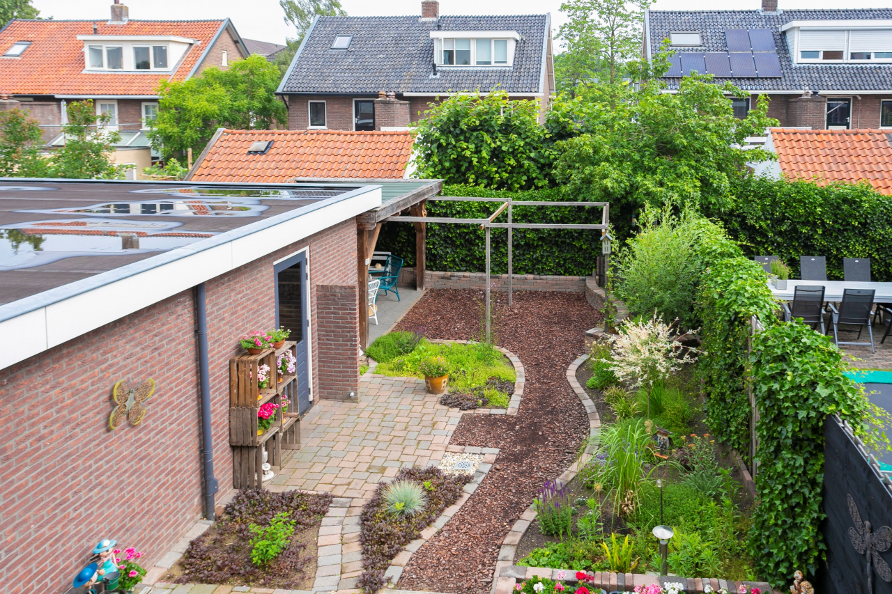 De 'groene' achtertuin met een sfeervolle veranda is aangelegd met zowel terras als borders met vaste beplanting en u kunt hier genieten van veel privacy. Extra grote stenen garage van 24 m2.