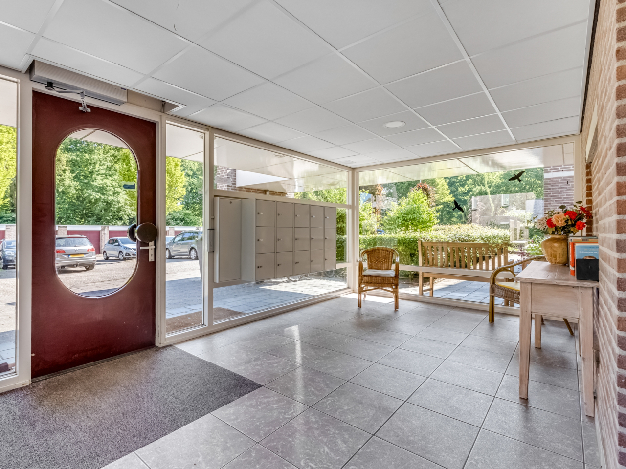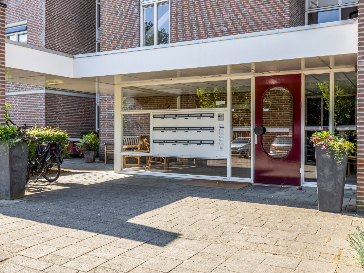 Overdekte entree met beltableau, hal met brievenbussen, trappenhuis, lift en deur naar de privé bergingen.