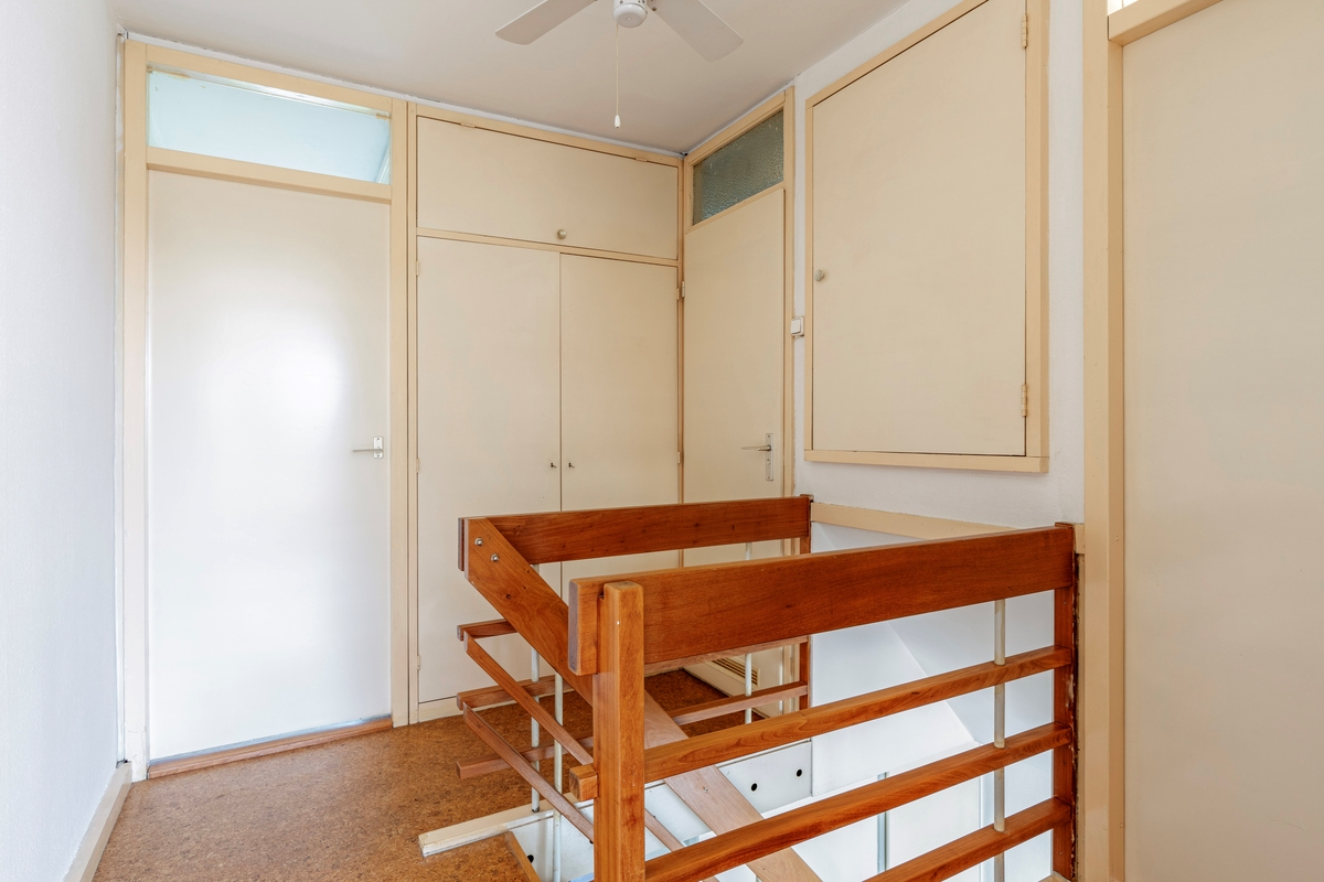 Overloop met CV ketel (Vaillant - 2010), vaste kast en toegang tot 3 slaapkamers en een complete badkamer. De ruime ouderslaapkamer met vaste kast is gelegen aan de voorzijde. De andere twee slaapkamers zijn aan de achterzijde gelegen en hebben recht opgetrokken muren, waarvan één slaapkamer met een eigen wastafel en beide met een vaste kast. De badkamer is voorzien van een wastafel, een bad/douche combinatie en een 2e toilet.