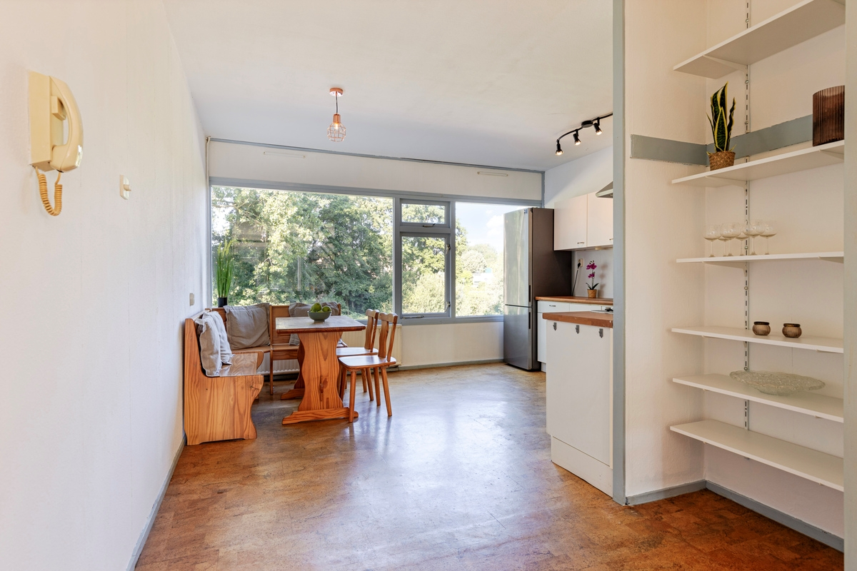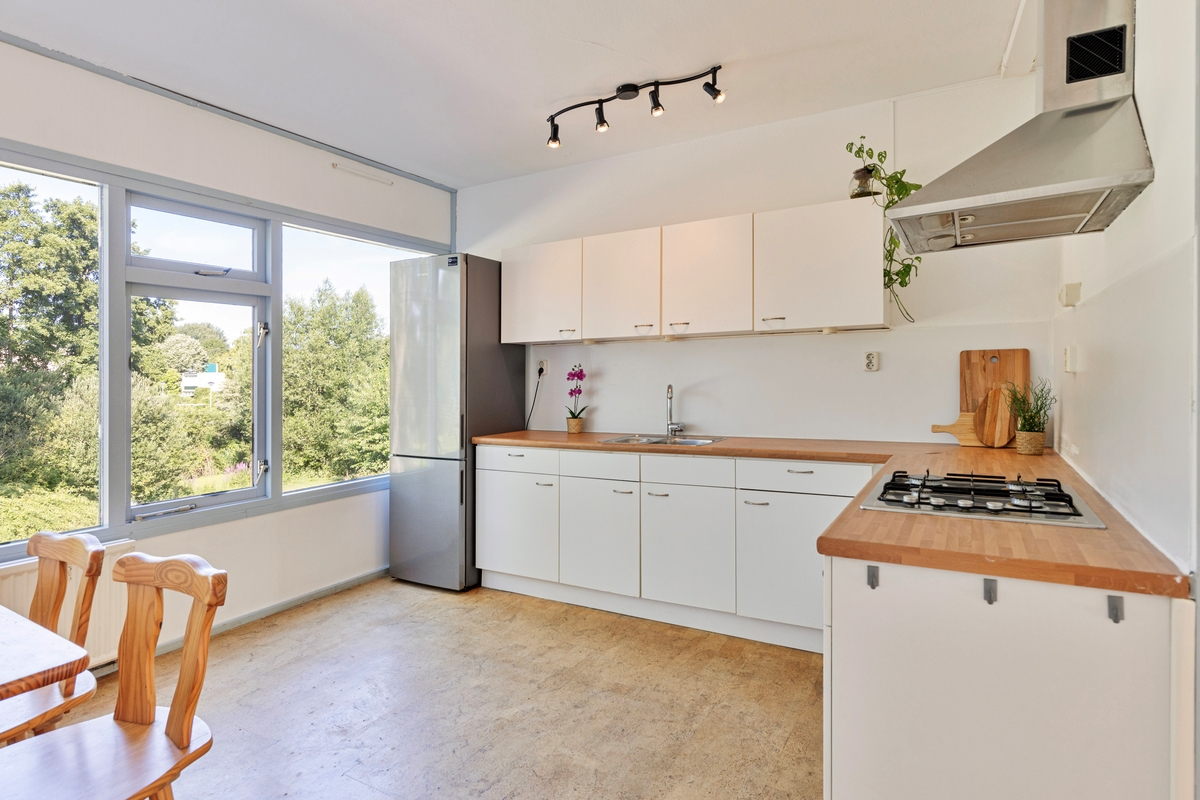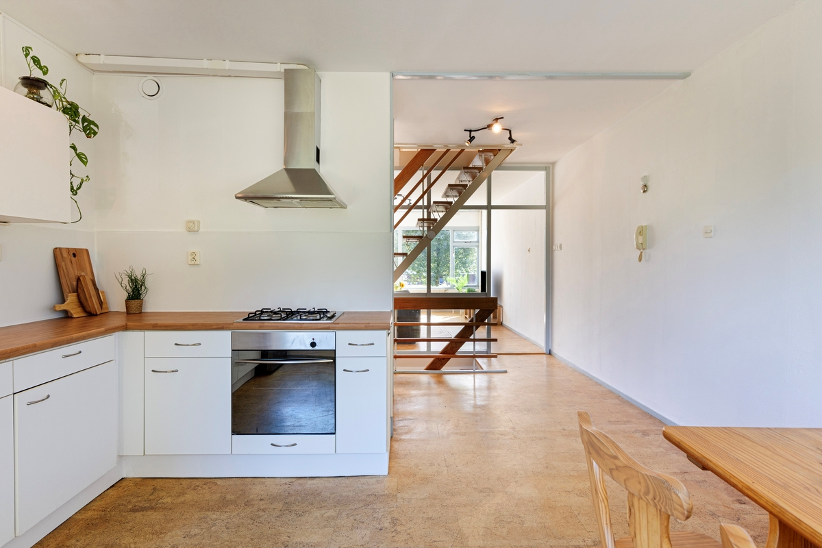 Overloop met intercom-installatie, toilet met fonteintje en mechanische ventilatie. Lichte woonkamer aan de achterzijde van de woning met een vrij uitzicht op o.a. de achtergelegen speeltuin. De ruime eetkeuken is aan de voorzijde gelegen en voorzien van een L-vormige keuken opstelling met 1½ spoelbak, 4 pits gaskookplaat, afzuigkap, oven en ruimte voor een losse koel/vries combinatie en voldoende opbergruimte. De keuken heeft een hout-look werkblad.