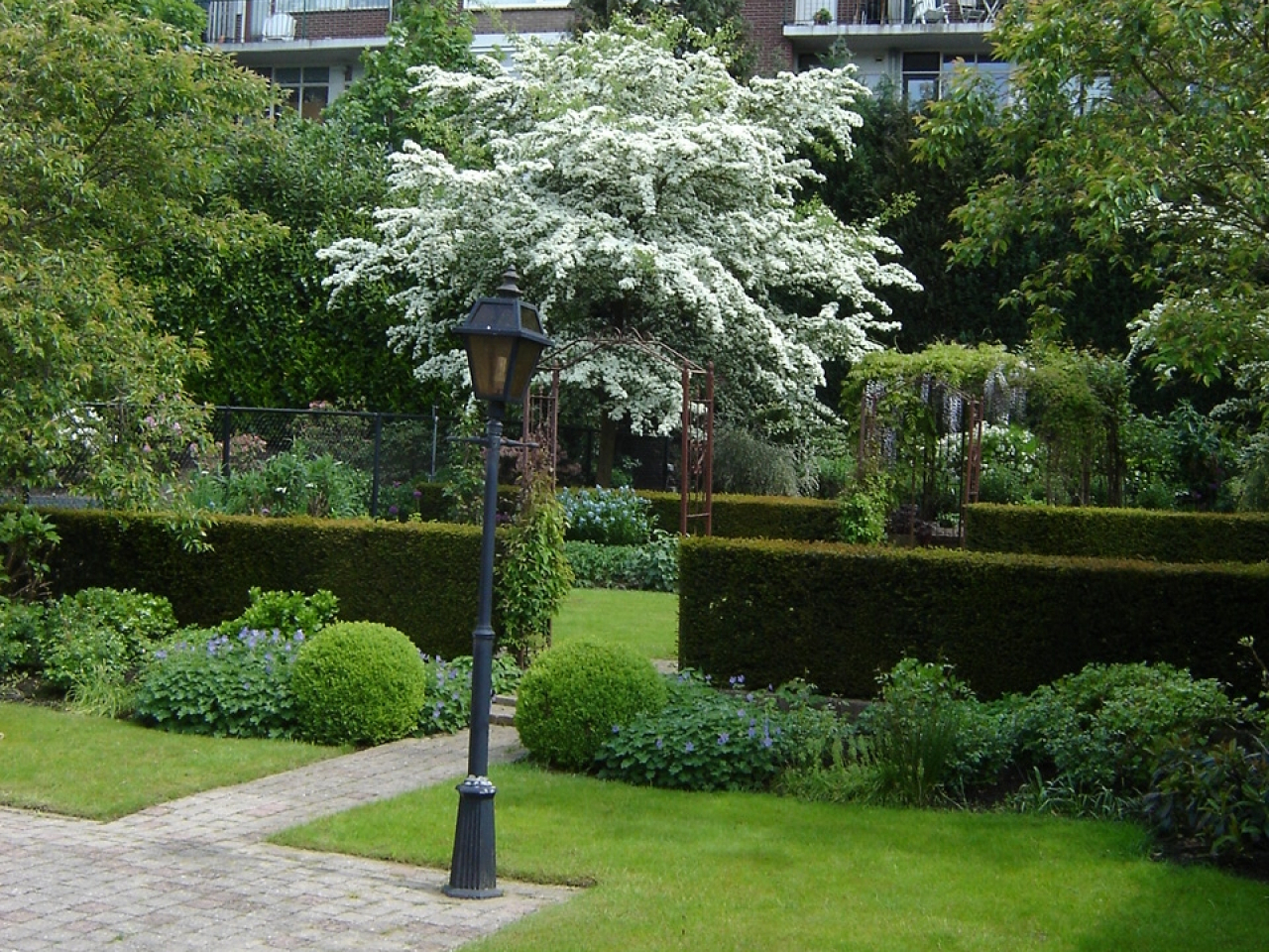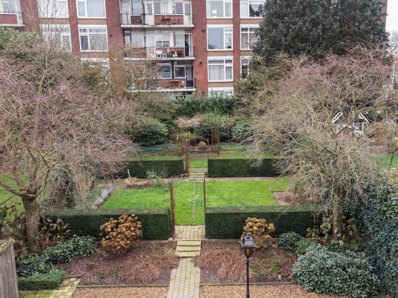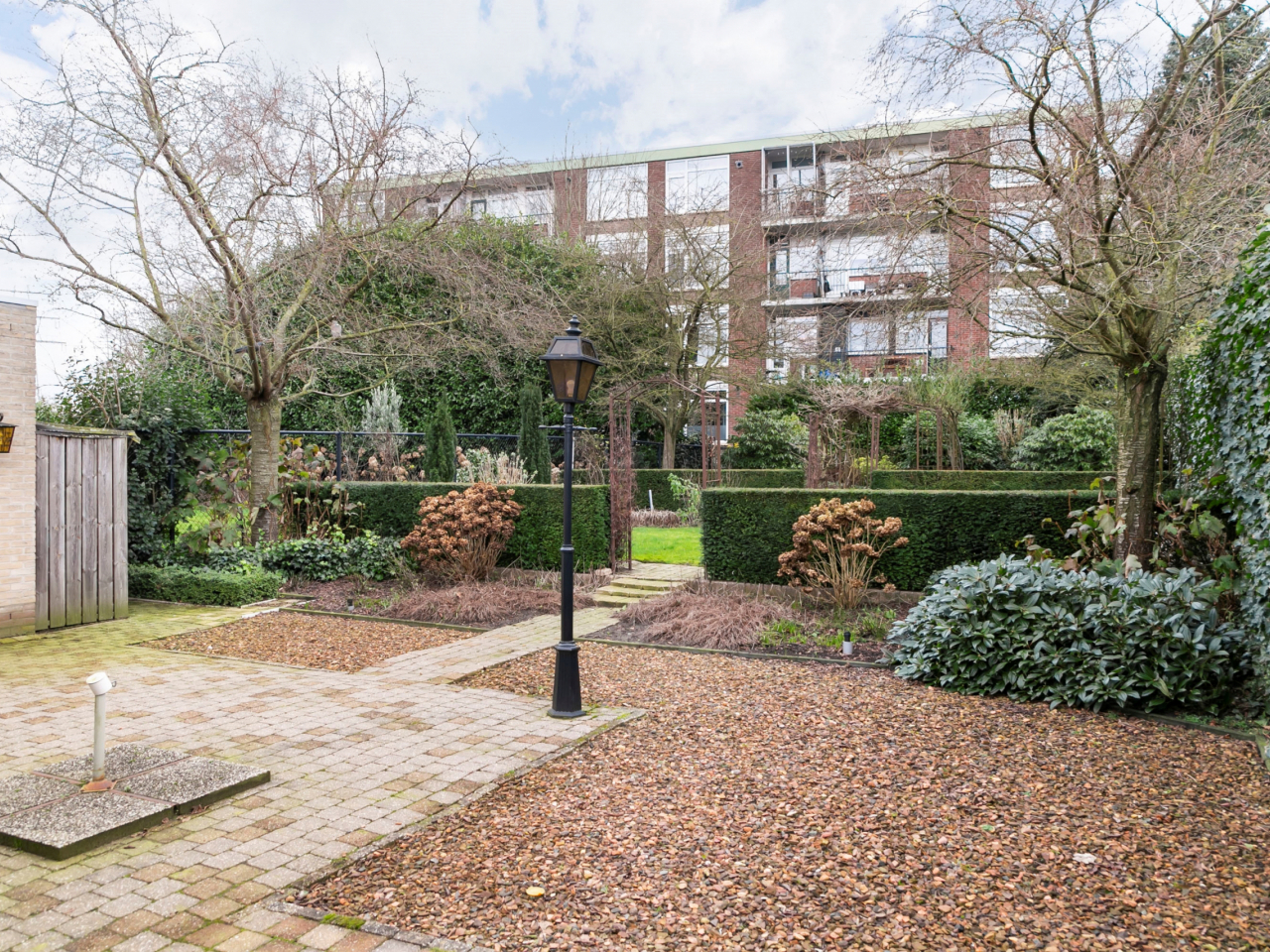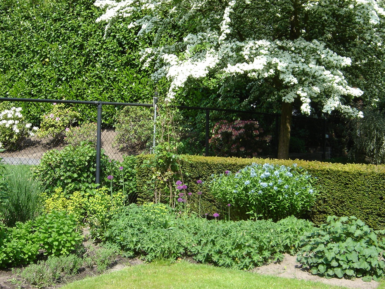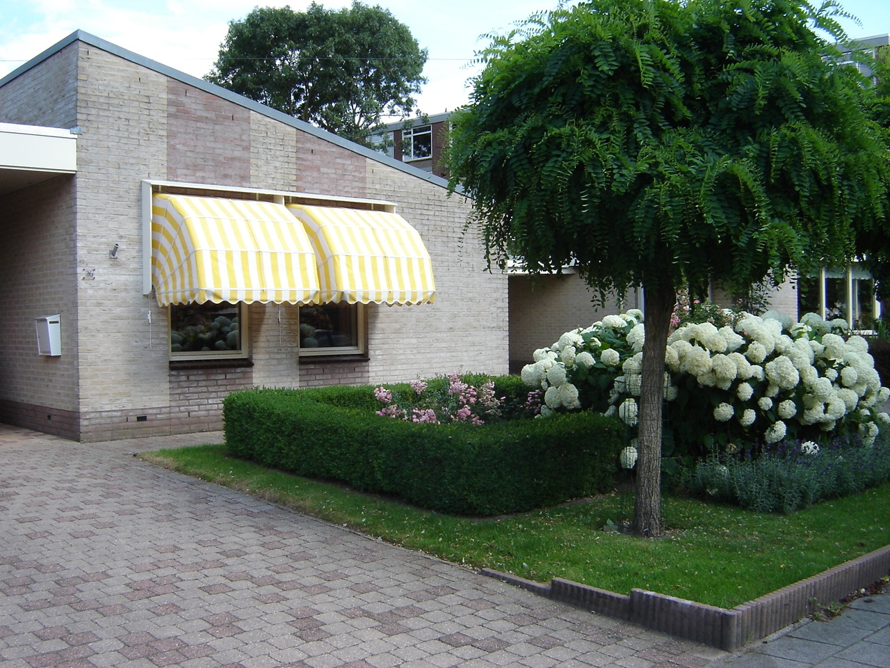 De achtertuin heeft de allure van een stadspark met diverse terrassen, sfeervolle heggen, plantenperken met blauwe regen en prachtige meidoorns en prunussen. In de voortuin staan hortensia’s, rozen en lavendel. De tuin beschikt over een automatisch beregeningssysteem. Vanuit de tuin is een tweede aangebouwde stenen berging met openslaande deuren bereikbaar. In de patio aan de zijkant van de woning heeft u veel privacy. Deze tuin ligt op het zuiden en er is hier een groot zonnescherm aanwezig. Om u een goede indruk te geven van deze prachtige tuin hebben wij eveneens foto’s uit de zomermaanden aan de presentatie toegevoegd.