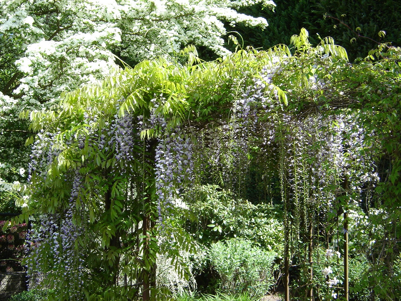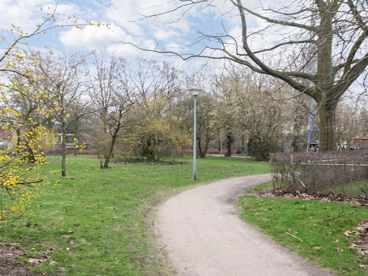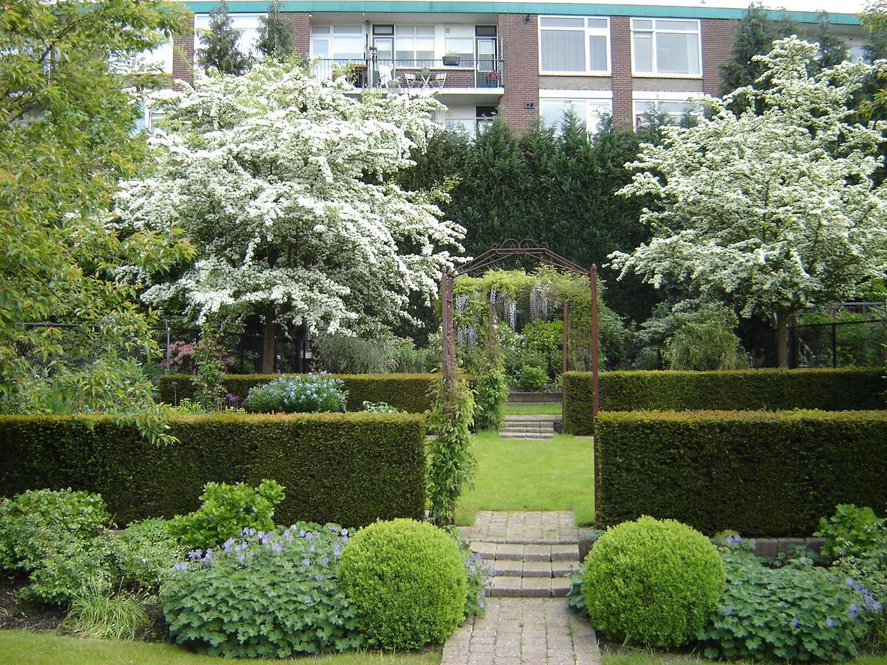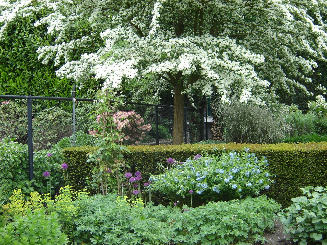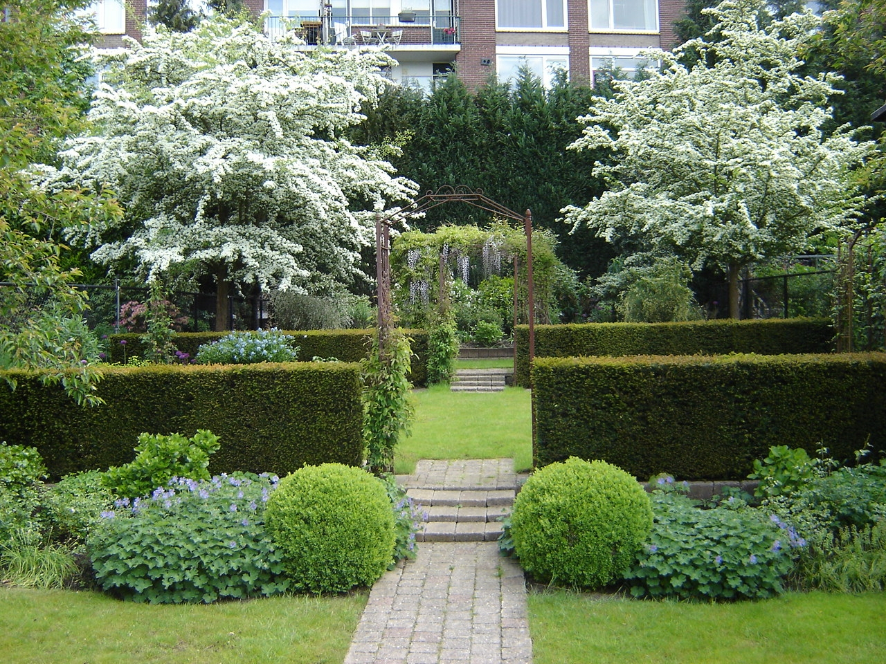 De achtertuin heeft de allure van een stadspark met diverse terrassen, sfeervolle heggen, plantenperken met blauwe regen en prachtige meidoorns en prunussen. In de voortuin staan hortensia’s, rozen en lavendel. De tuin beschikt over een automatisch beregeningssysteem. Vanuit de tuin is een tweede aangebouwde stenen berging met openslaande deuren bereikbaar. In de patio aan de zijkant van de woning heeft u veel privacy. Deze tuin ligt op het zuiden en er is hier een groot zonnescherm aanwezig. Om u een goede indruk te geven van deze prachtige tuin hebben wij eveneens foto’s uit de zomermaanden aan de presentatie toegevoegd.