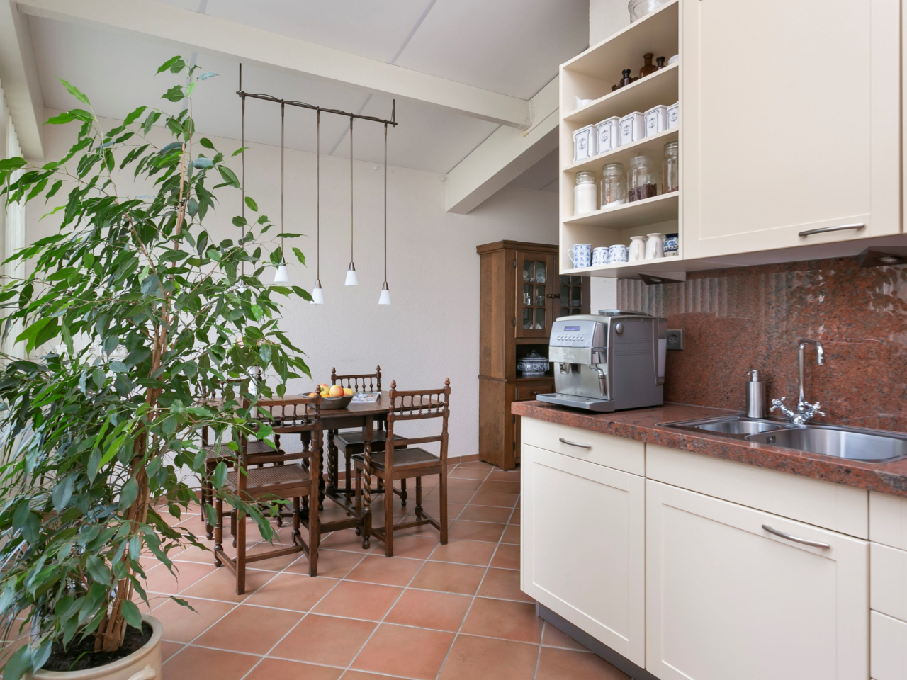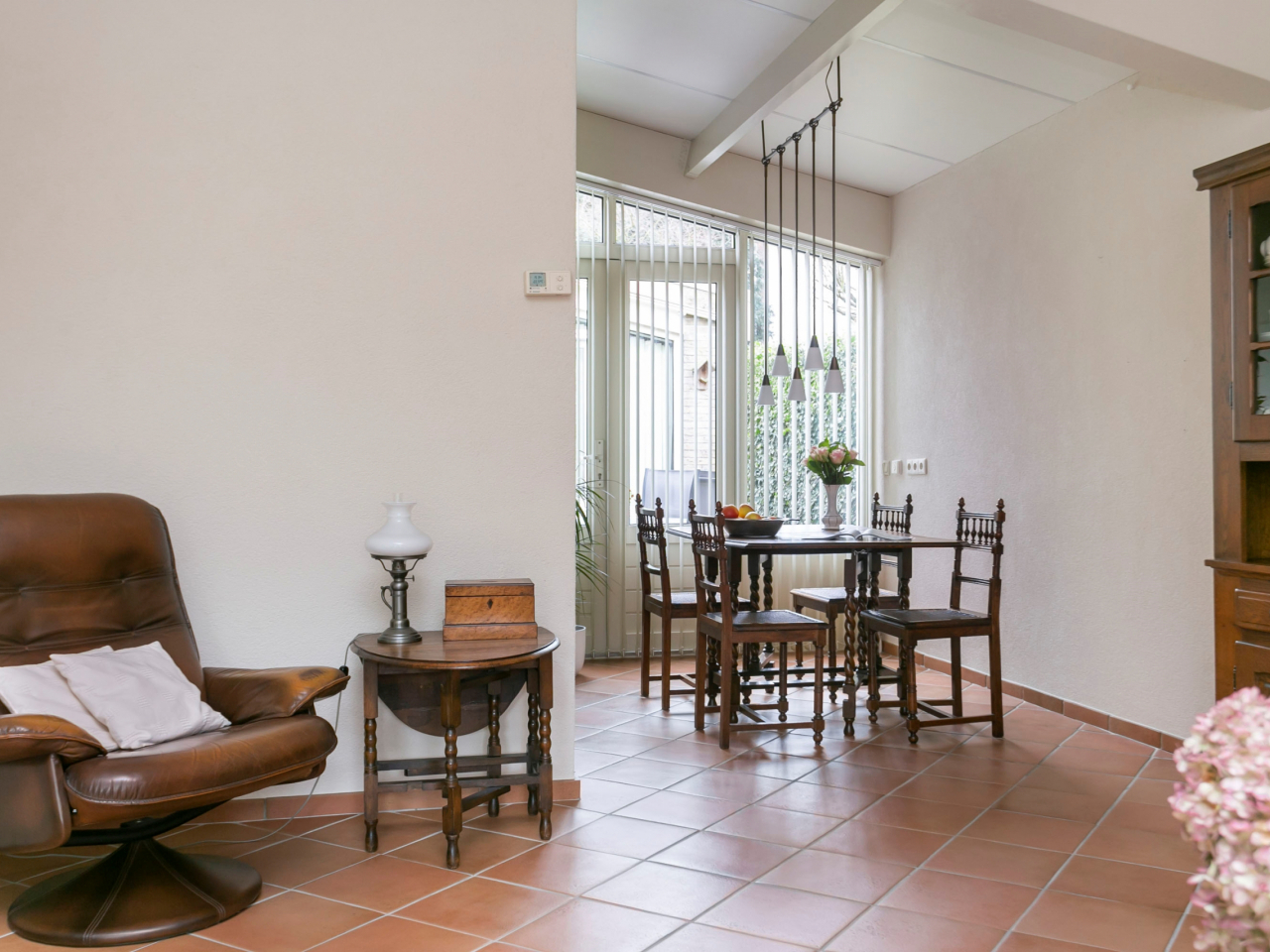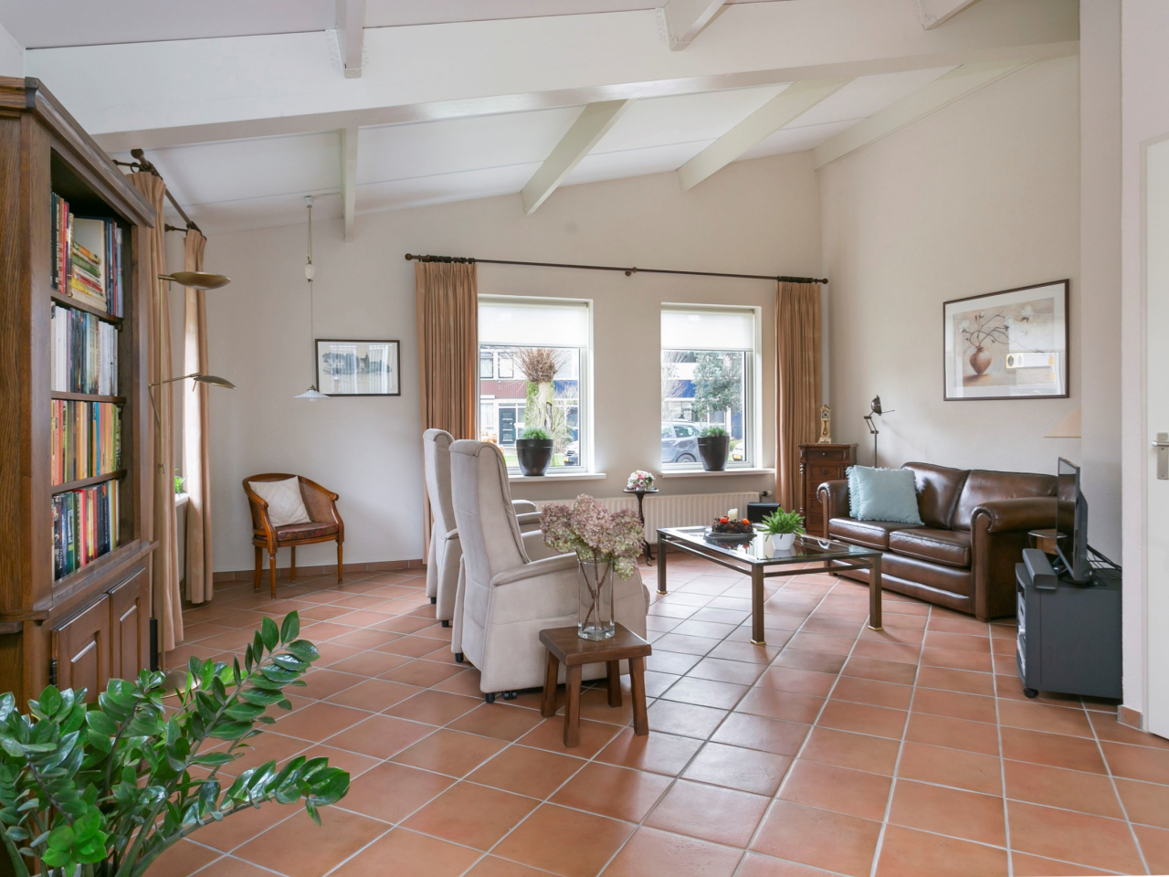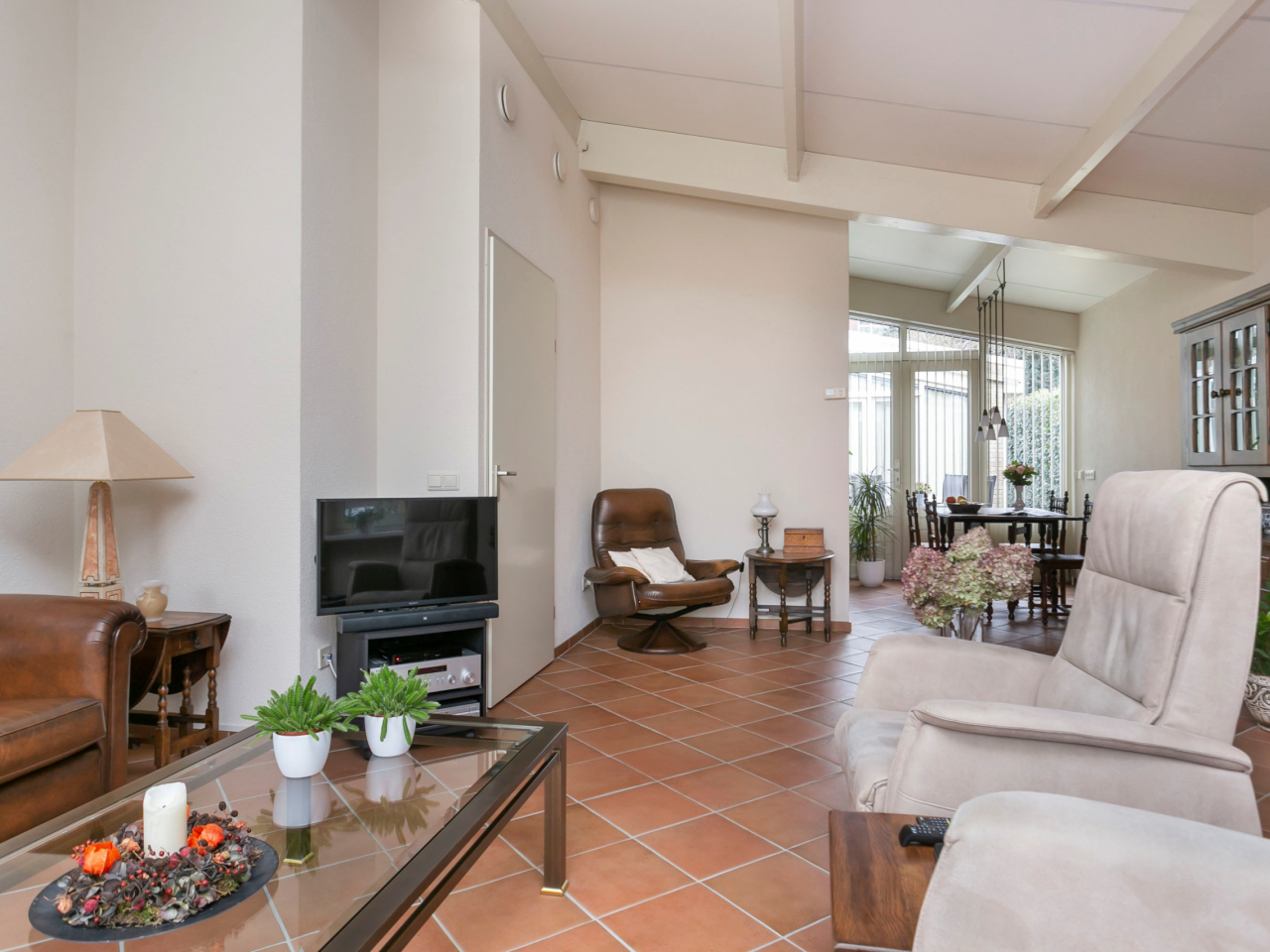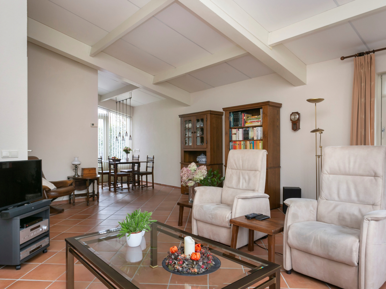 Overdekte entree en ruime hal met praktische garderobe. De woonkamer is verdeeld in een zithoek aan de voorzijde en een eethoek aan de achterzijde van de woning met een openslaande deuren naar de patio met groot zonnescherm (elektrisch bedienbaar met wind-zon voorziening). Aansluitend aan de eethoek bevindt zich de open keuken voorzien van een granieten werkblad, 1½ spoelbak, 4 pits gaskookplaat met een handige elektrische warmhoudplaat, afzuigkap, combi-magnetron, koelkast, vaatwasser en voldoende opbergkasten waaronder een pannen- carrousel. Tegenover de open keuken is nu een eettafel geplaatst zodat iedereen gezellig kan aanschuiven terwijl er gekookt wordt. De royale woonkamer en keuken hebben een fijne lichtinval en een hoog plafond wat een aangenaam ruimtelijk gevoel geeft.