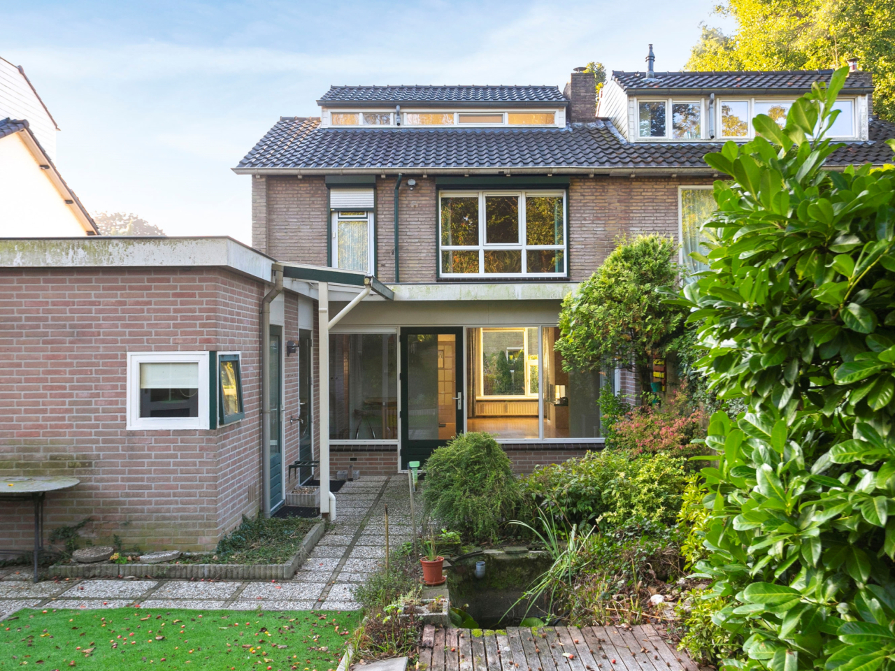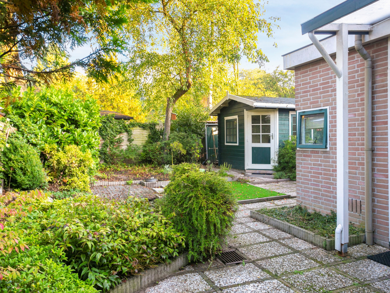 De groene achtertuin met onder andere een vijver en diverse terrassen is gelegen op het noordwesten en biedt veel privacy. Achterin de tuin is een houten tuinhuis aanwezig voor de tuinspullen. Op de oprit is voldoende parkeergelegenheid en aan de zijkant van de woning is nog een ruime berging aanwezig.