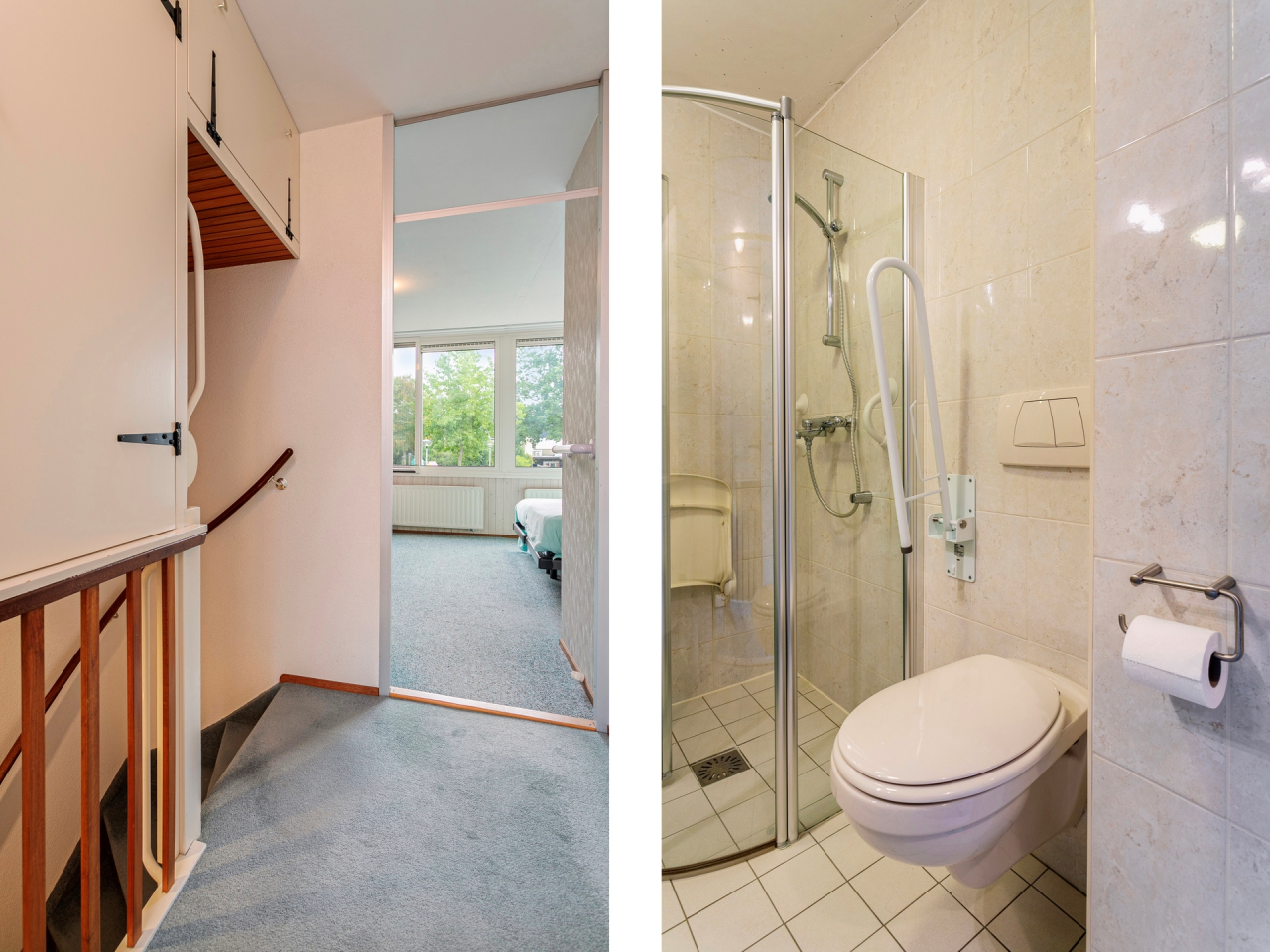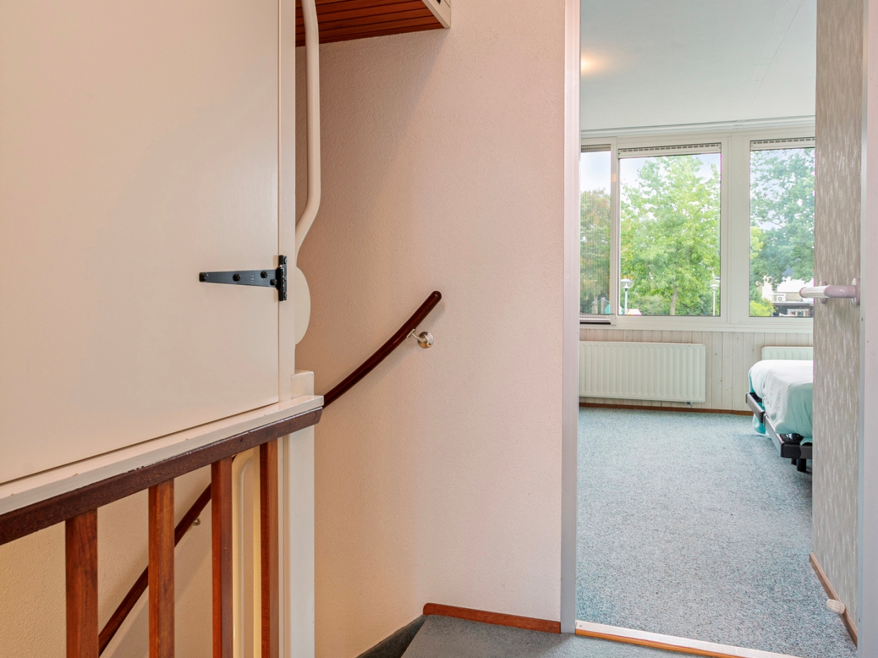 De trap geeft toegang tot de overloop, 2 slaapkamers, de badkamer en een vaste kast. De 2 ruime slaapkamers zijn voorzien van horren en hebben tapijt als vloerbedekking. In het verleden zijn er twee slaapkamers samengevoegd, maar dit valt op eenvoudige wijze weer terug te brengen naar 3 slaapkamers. De badkamer is v.v. een douchecabine, wastafelmeubel en een 2e toilet. De opstelplaats voor de C.V. ketel (Intergas, 2012) en aansluiting wasdroger bevinden zich in de vaste kast.