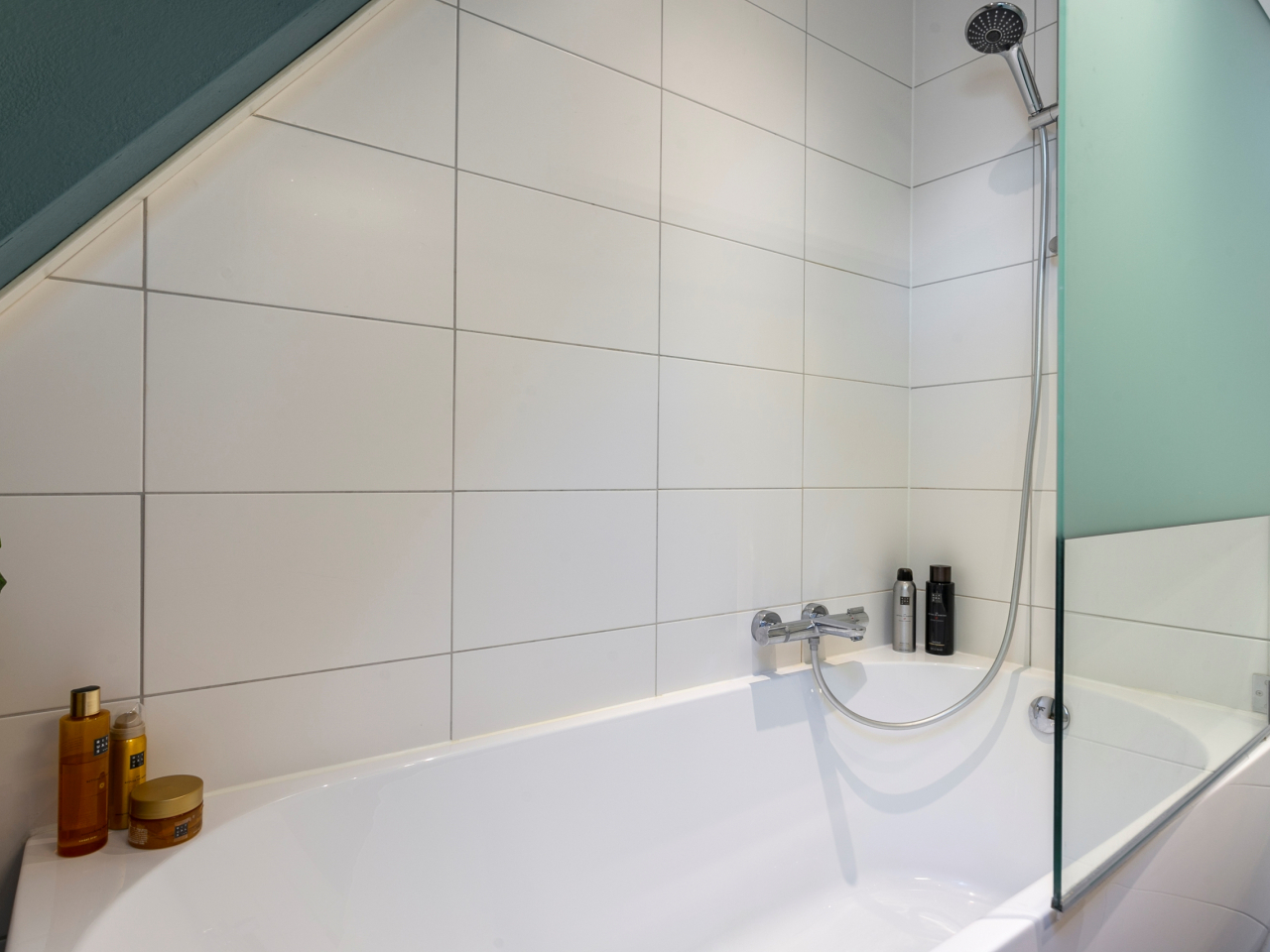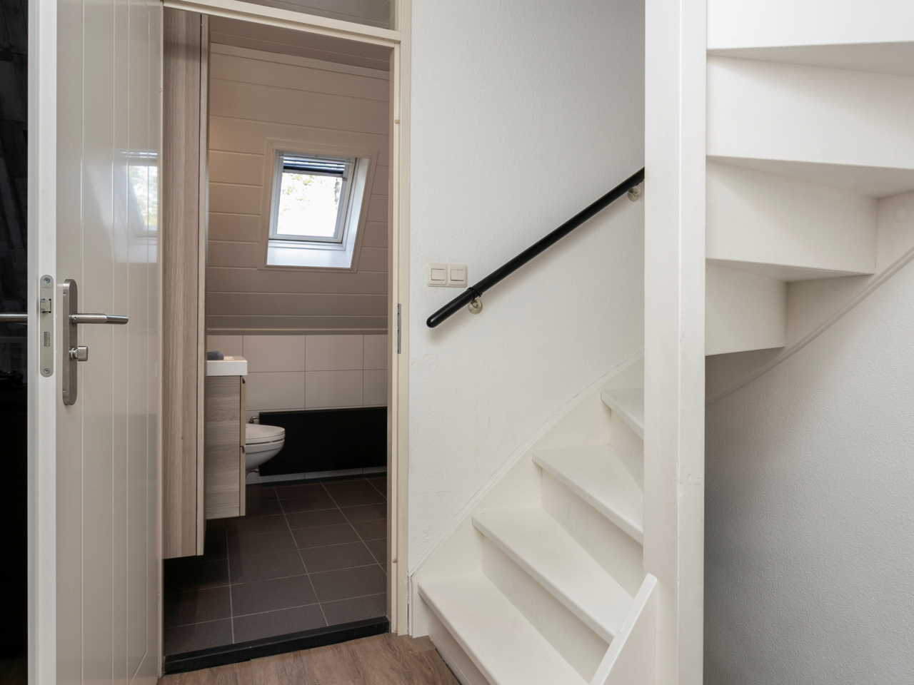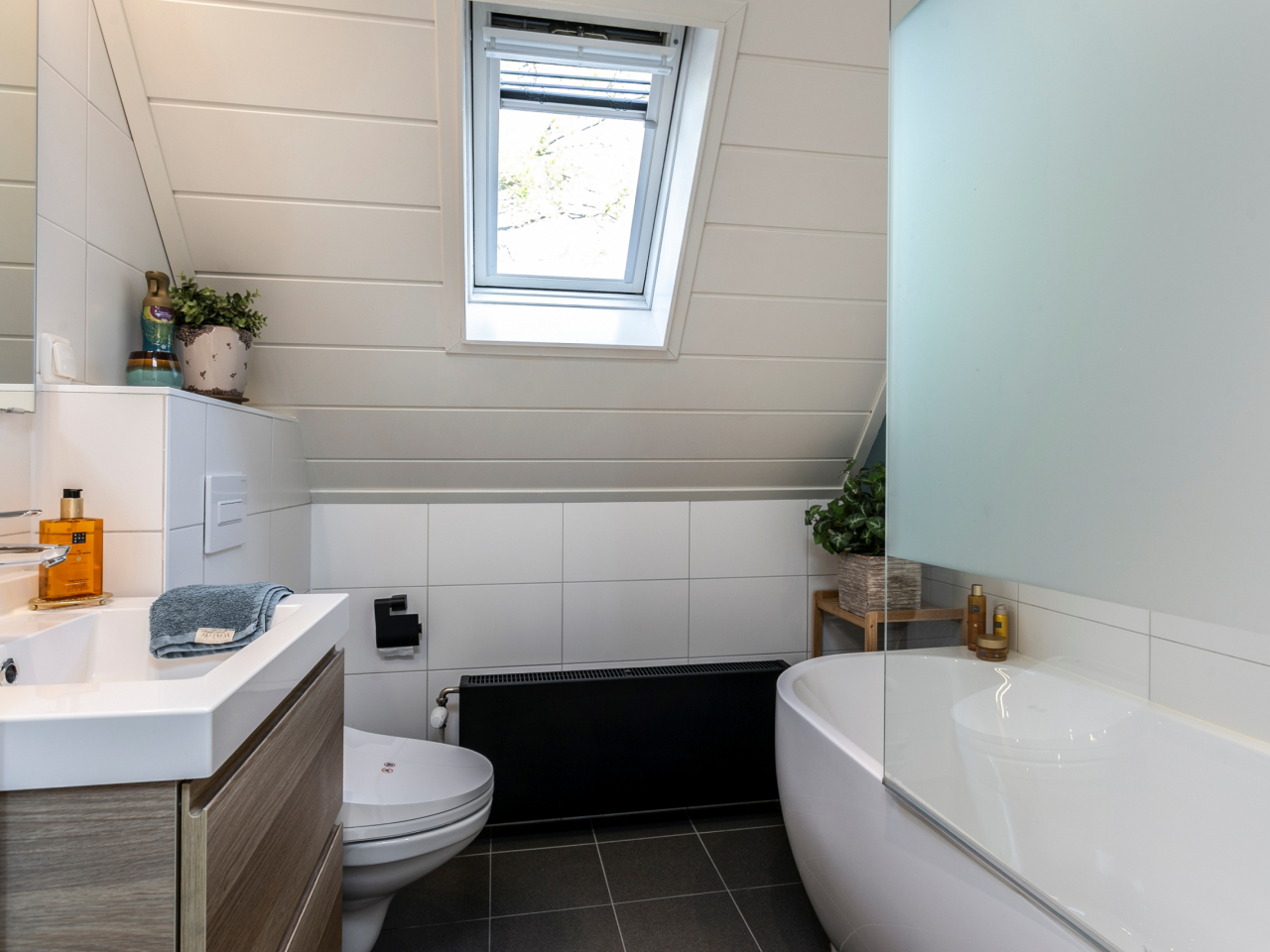 Moderne en lichte badkamer (2021) met dakraam voor natuurlijk daglicht en voorzien van een wastafelmeubel, douche/bad combinatie, tweede toilet, radiator en ventilatie.