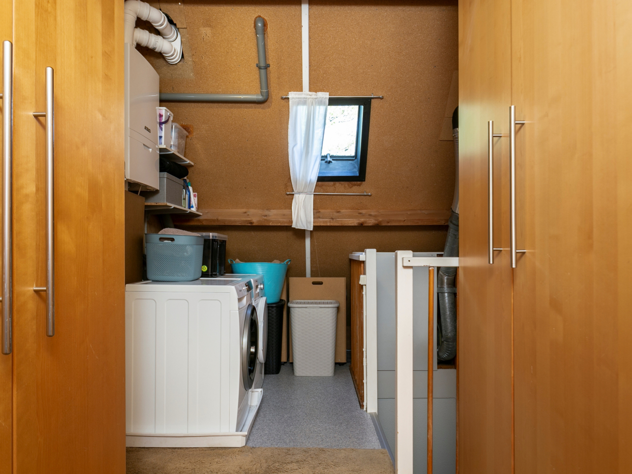 Overloop met dakraam, CV-ketel (Atag HR – 2021 – eigendom) en aansluitingen voor de was-apparatuur. De mechanische ventilatie (2021) is van Stork Comfofan en is v.v. afstandsbediening.