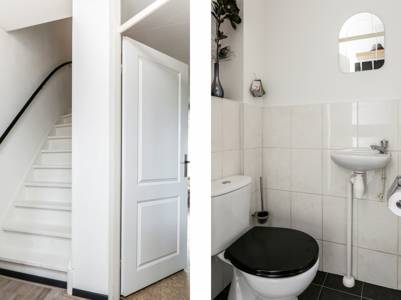 Ruime doorzon woonkamer met kurkvloer en een handige trapkast/voorraadkast. Moderne open keuken gelegen aan de achterzijde en voorzien van “metro” wandtegels, plavuizen, een 4 zone-keramische kookplaat, afzuigkap, koelkast, oven, vaatwasser en veel opbergruimte. Vanuit de woonkamer is een achterportaal bereikbaar met de trapopgang en een deur naar de achtertuin. Toiletruimte in een neutrale kleurstelling met fonteintje.
