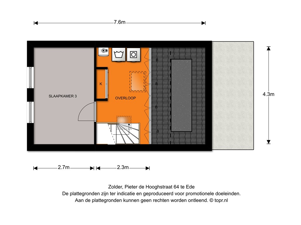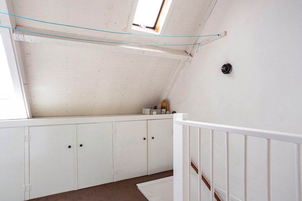 Voorzolder met CV-ketel (Remeha Tzerra uit 2018), aansluiting wasmachine en bergruimte. Hier bevindt zich tevens de ruime 3e slaapkamer.