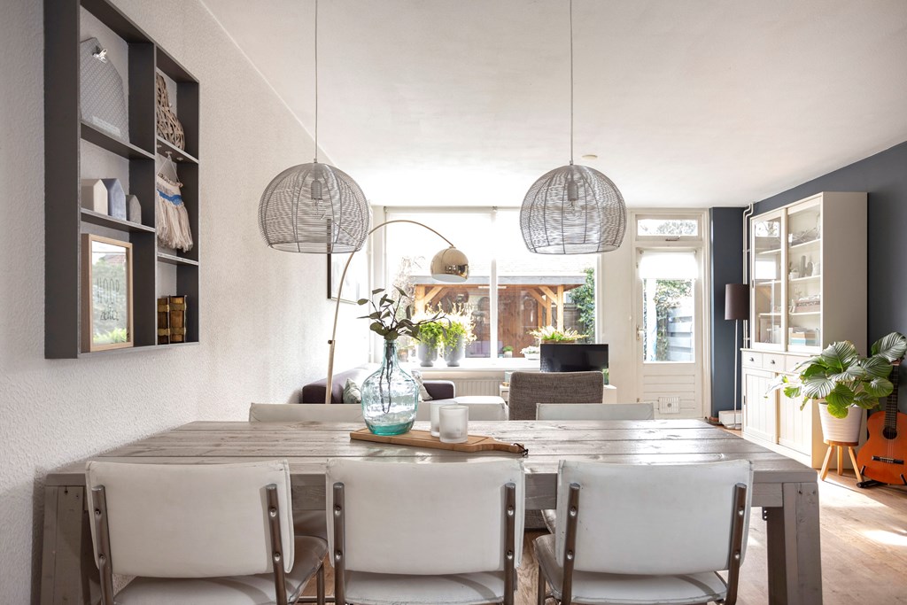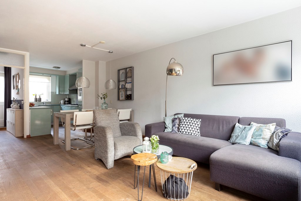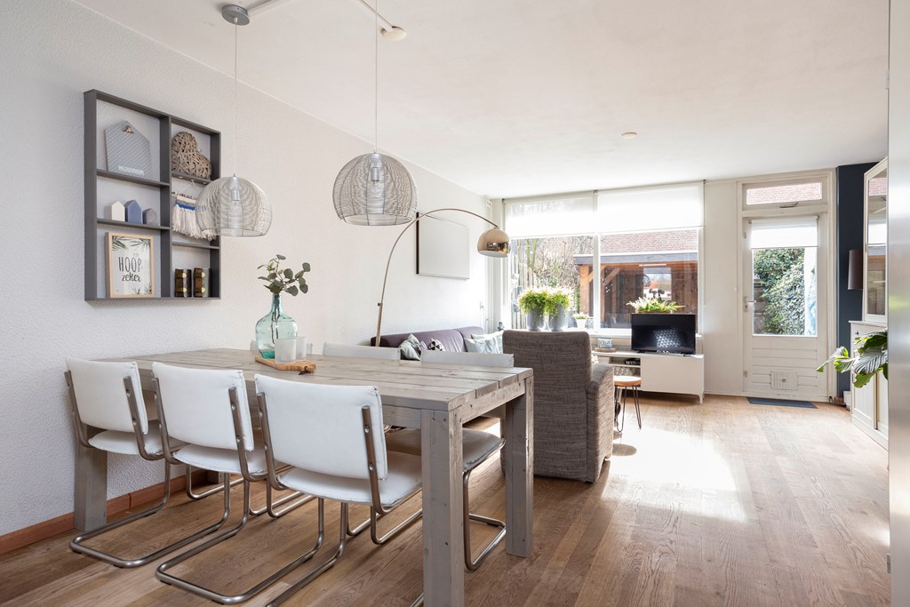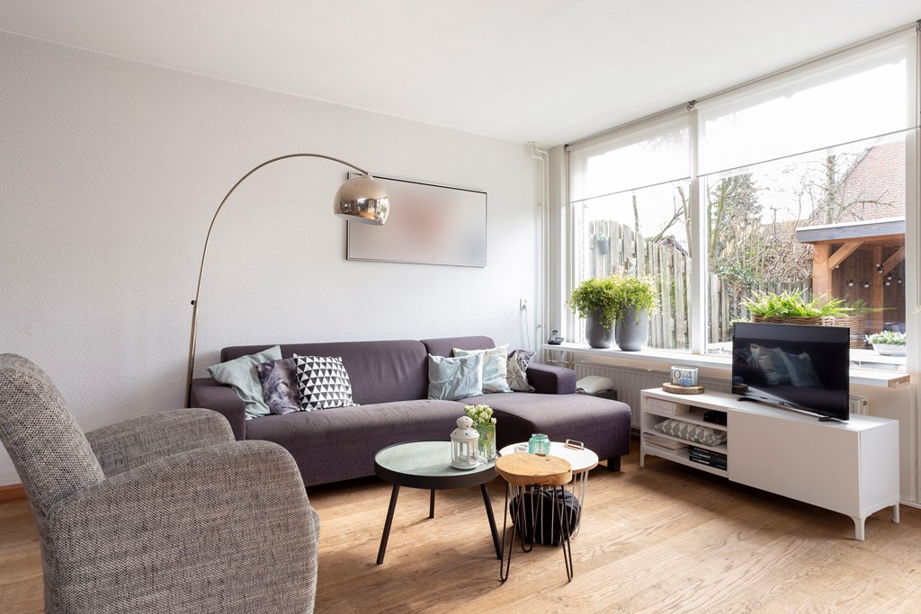Tuingerichte woonkamer met handige trapkast en deur naar de achtertuin.