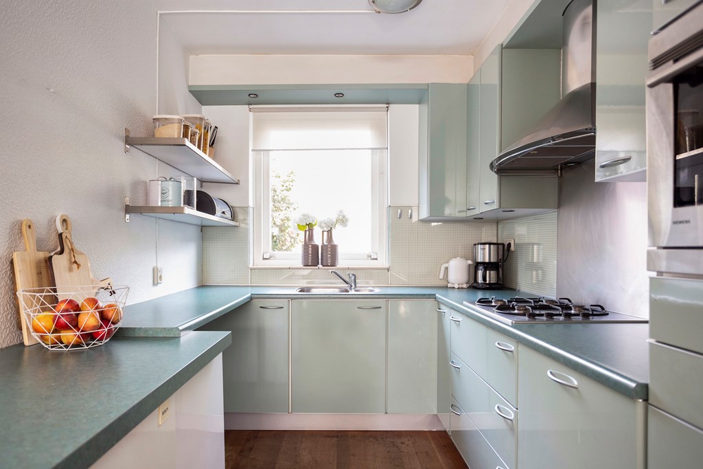 L-vormige open keuken met 4-pits gasplaat, afzuigkap, combi-oven, vaatwasser (2015), losse koelkast met vriezer en voldoende opbergkasten.