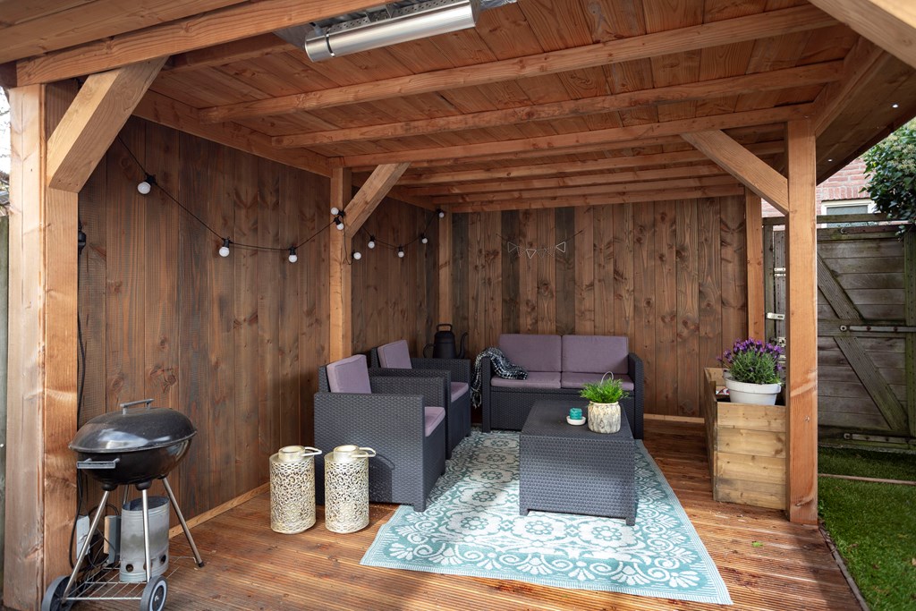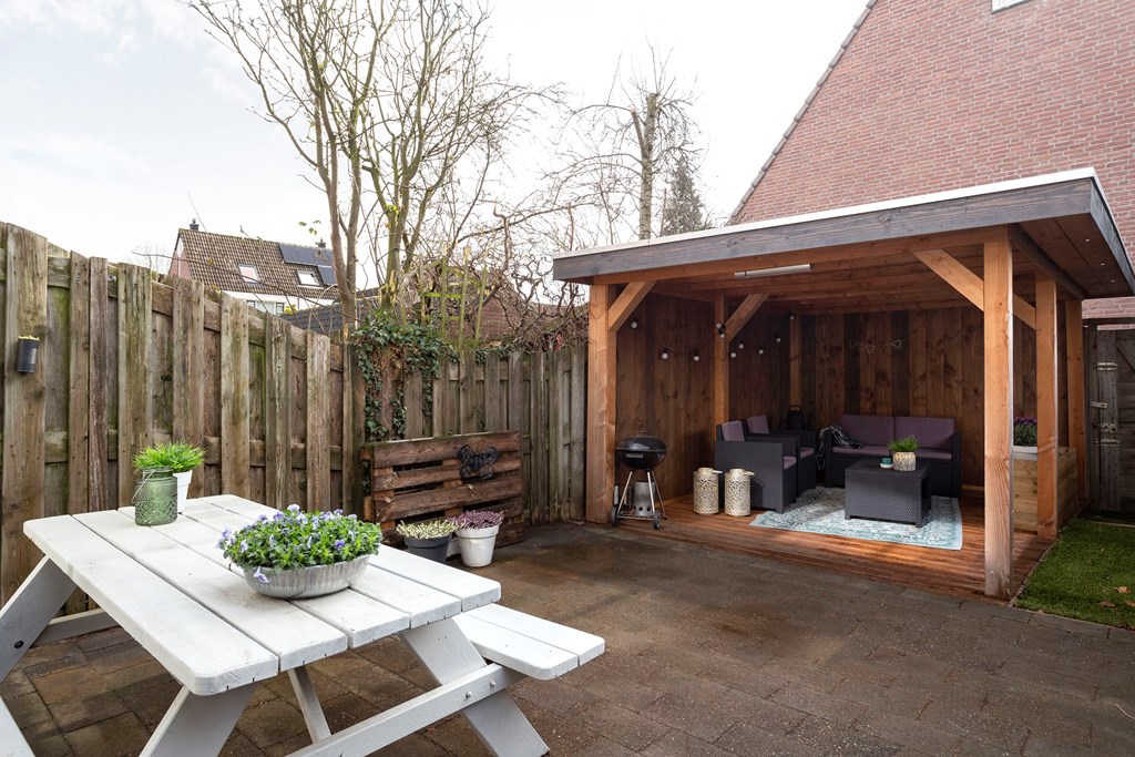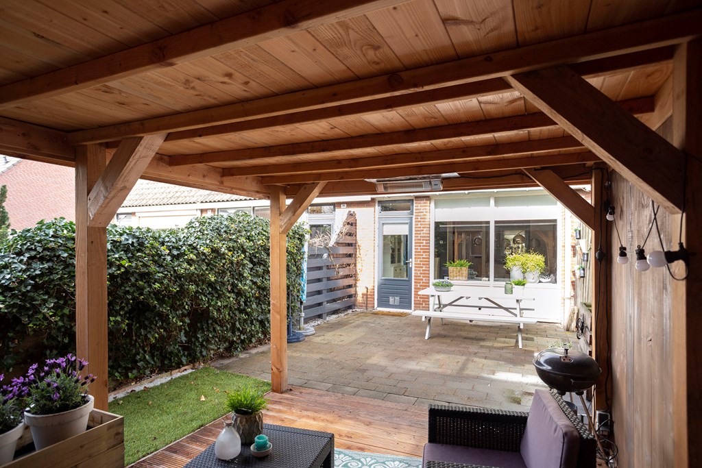 Achtertuin op het zuiden met achterom en veranda (2017) waar u zowel heerlijk in de zon als in de schaduw kunt vertoeven.