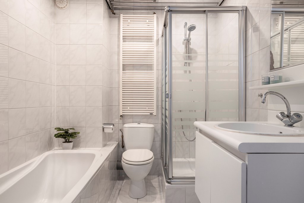Complete badkamer met wastafelmeubel, douche, bad en een 2e toilet.