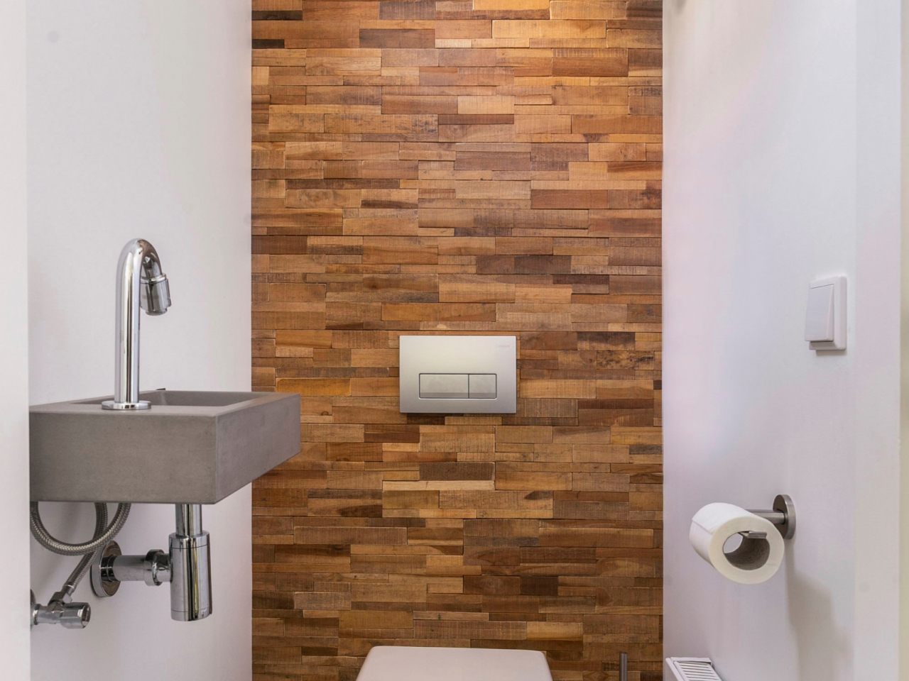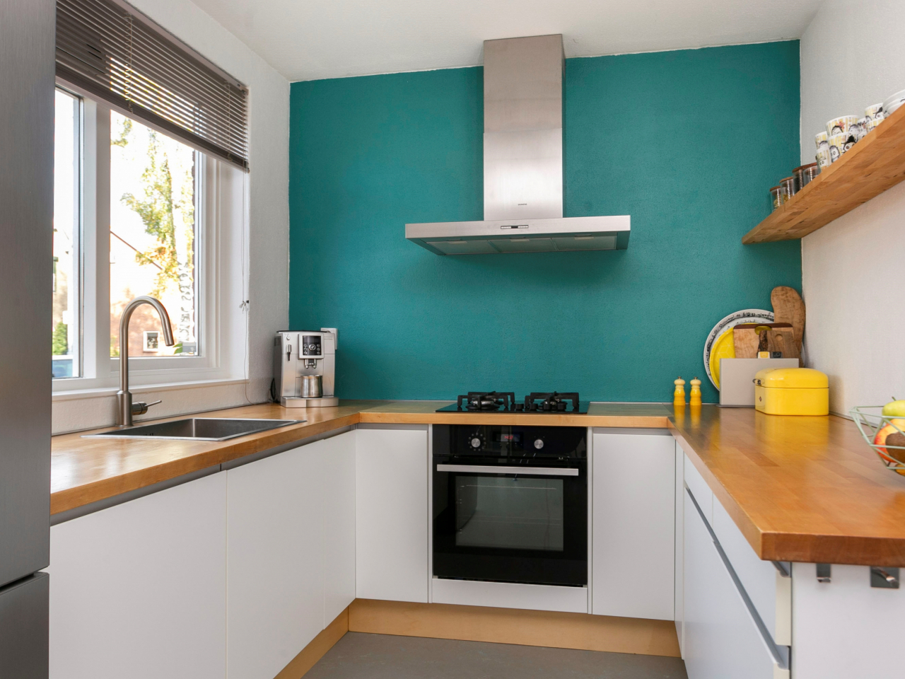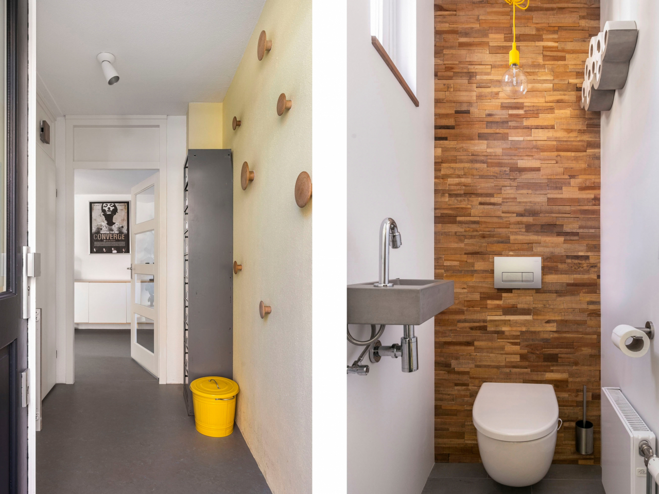 Entree, hal, sfeervolle toiletruimte met zwevend toilet en fonteintje, meterkast en trapopgang naar de eerste verdieping. Ruime tuingerichte woonkamer met houtkachel om gezellig na een boswandeling of op een avond met vrienden of familie te genieten van de warmte van deze sfeermaker. Door de grote raampartijen is de woonkamer ook lekker licht en de openslaande deuren bieden toegang tot de achtertuin. De halfopen eetkeuken is voorzien van een houten werkblad, 4 pits gaskookplaat, afzuigkap, oven, vaatwasser (AEG, recent vervangen) en losse koelkast (Bosch). Aansluitend aan de keuken is er voldoende ruimte voor een grote eettafel. Op de begane grond ligt een strakke marmoleumvloer.