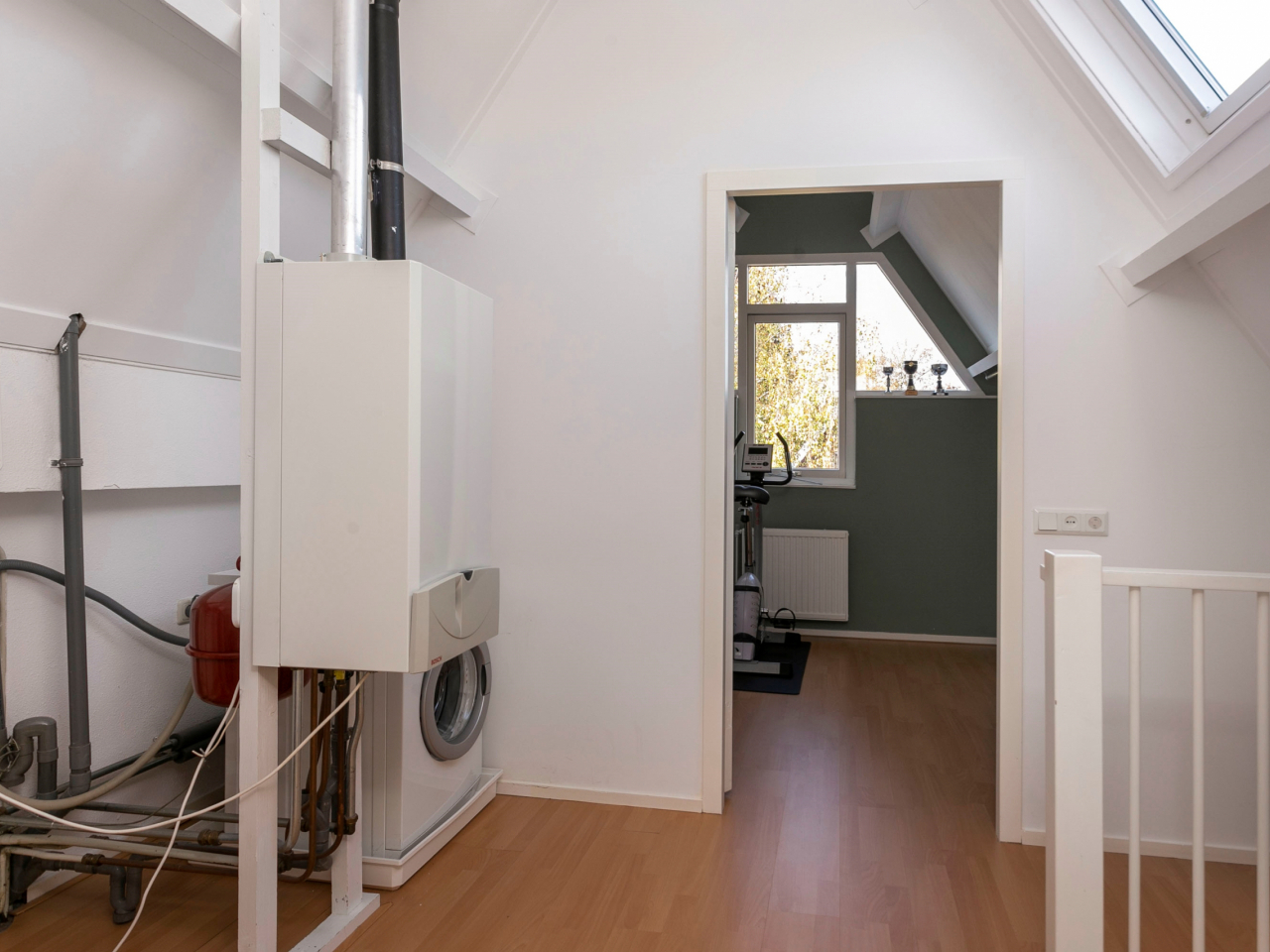 Via een vaste open trap bereikt u de overloop met een groot dakraam, de CV-ketel opstelling (Bosch).