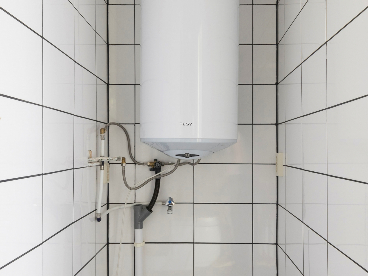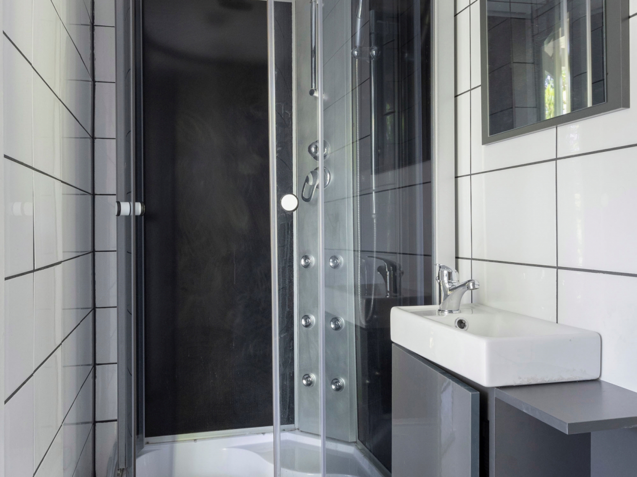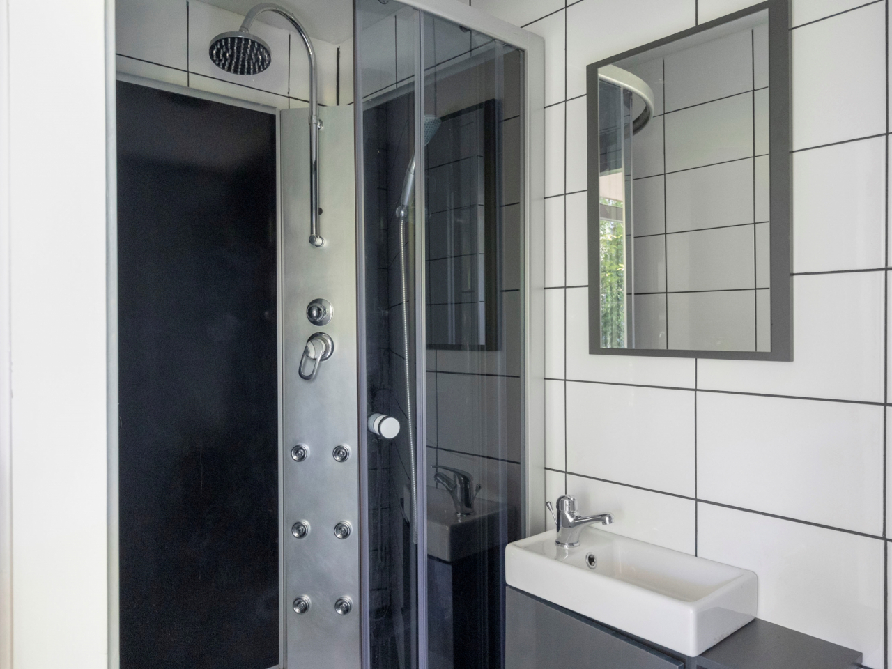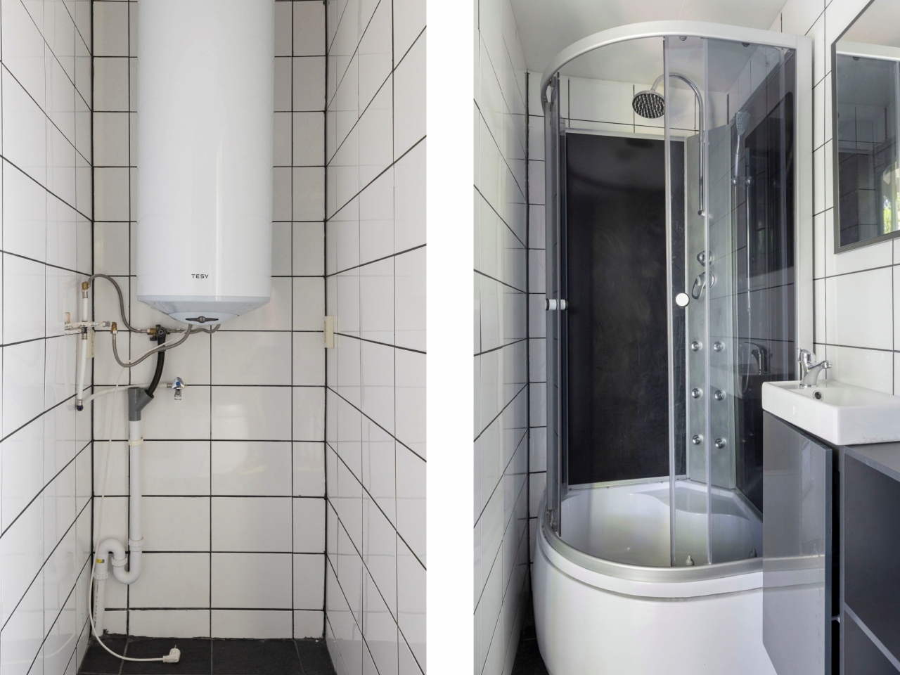 De volledige betegelde badkamer (in 2020 gerenoveerd) is eveneens via de keuken te bereiken en voorzien van een wastafelmeubel, douchecabine met jet stream, een boiler (inhoud van 160 liter - 1 jr oud) en de wasmachine aansluiting.