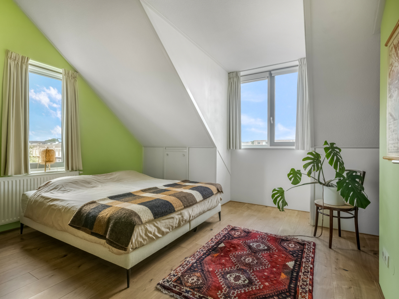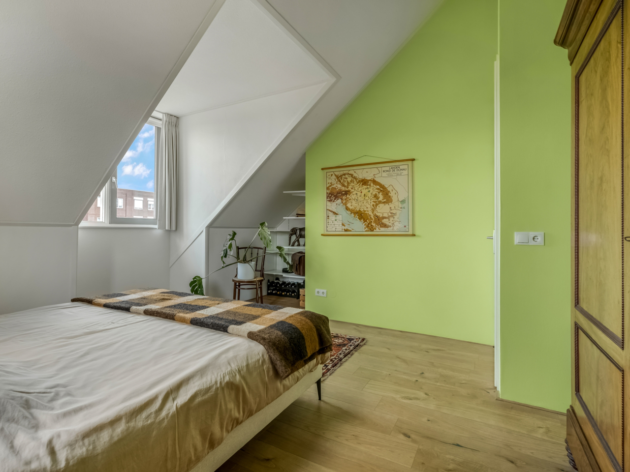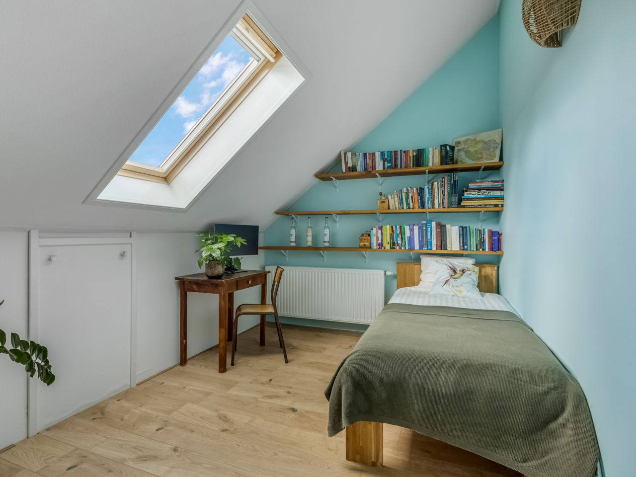 De hoofdslaapkamer is bijzonder royaal en heeft een prachtig hoge nok, een dakkapel, een raam in de zijgevel en extra bergruimte achter de knieschotten. De tweede slaapkamer, gelegen aan de achterzijde, is voorzien van een groot Velux dakraam en eveneens knieschotberging. Beide kamers zijn afgewerkt met een nette laminaatvloer.