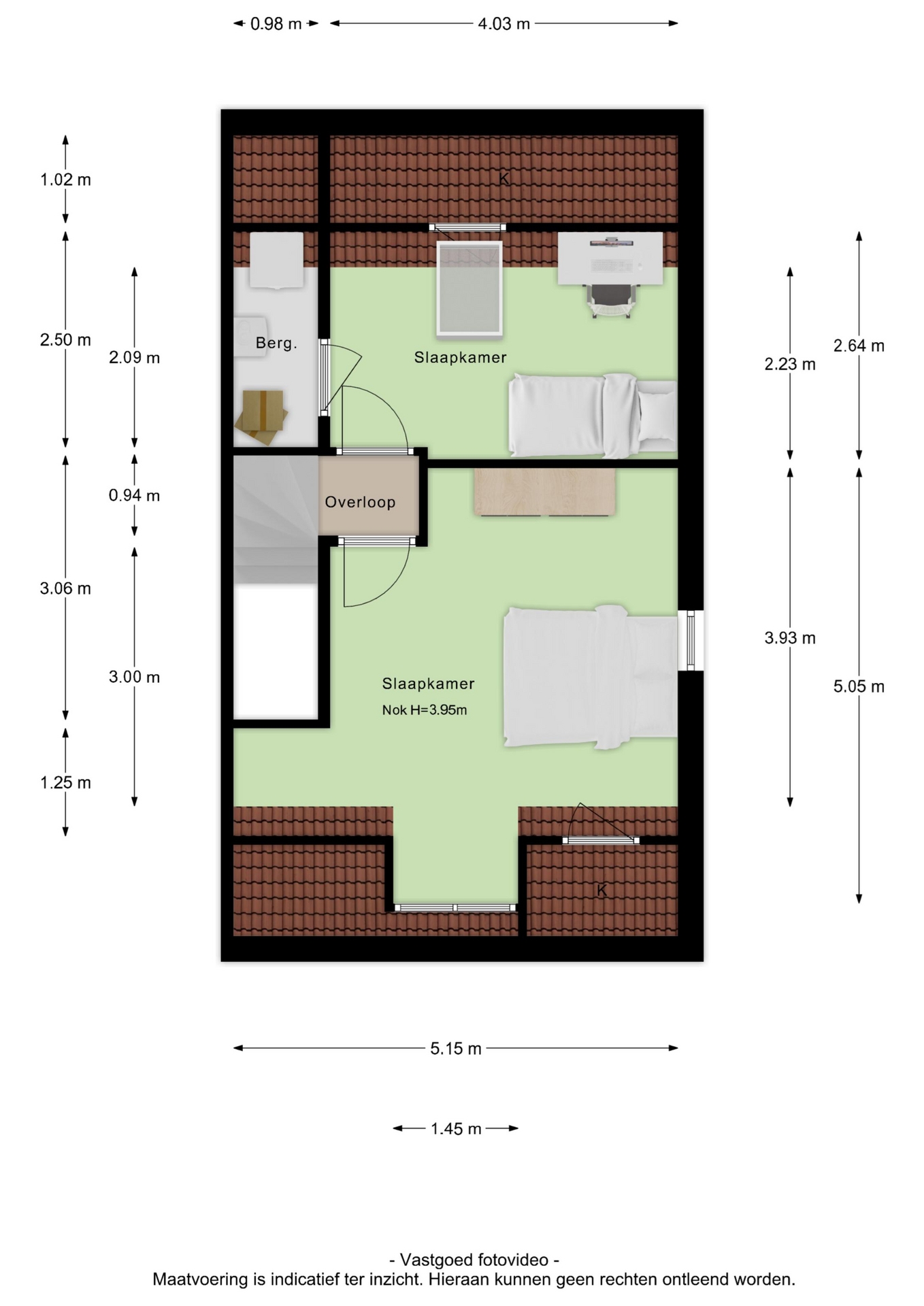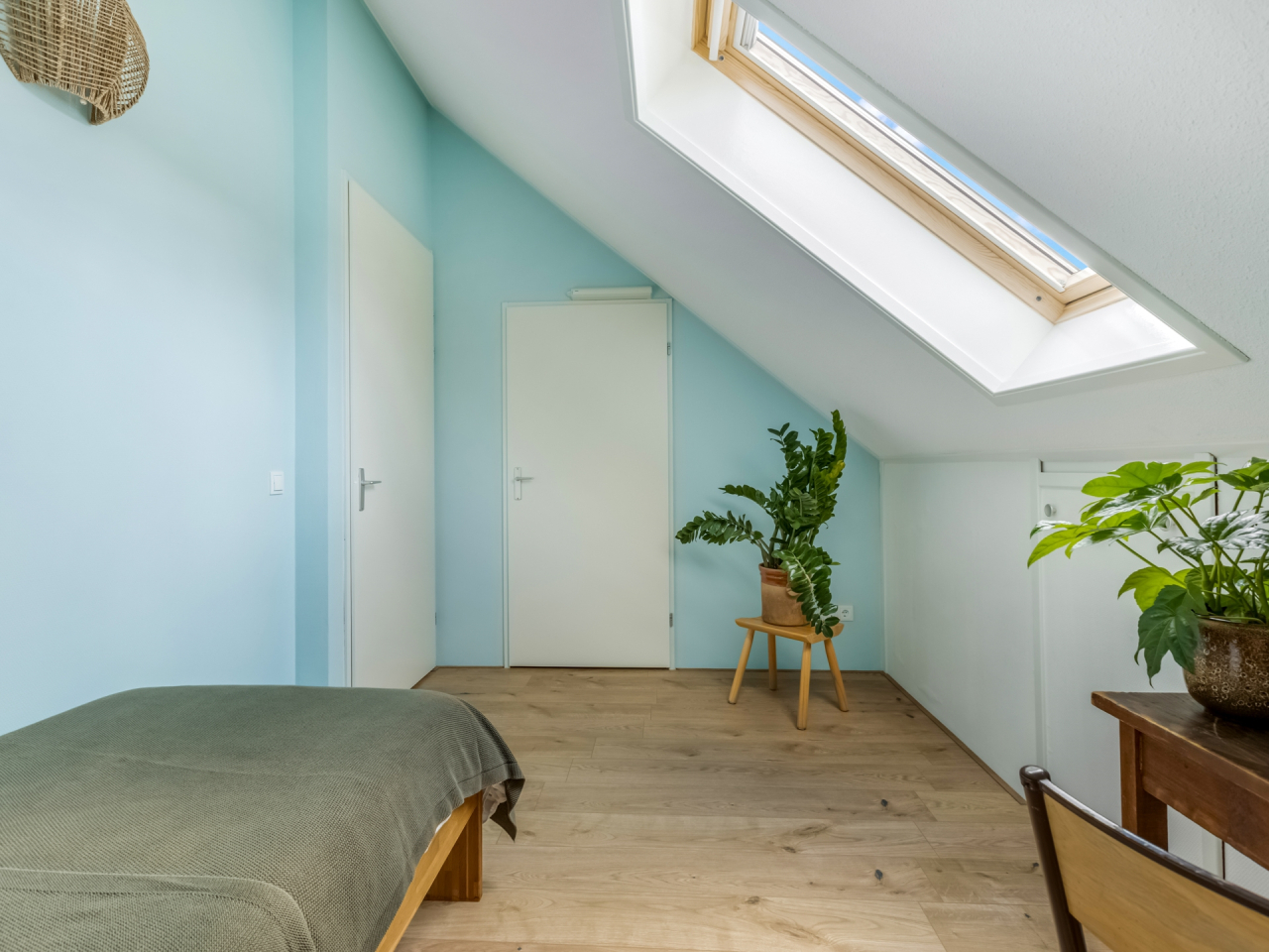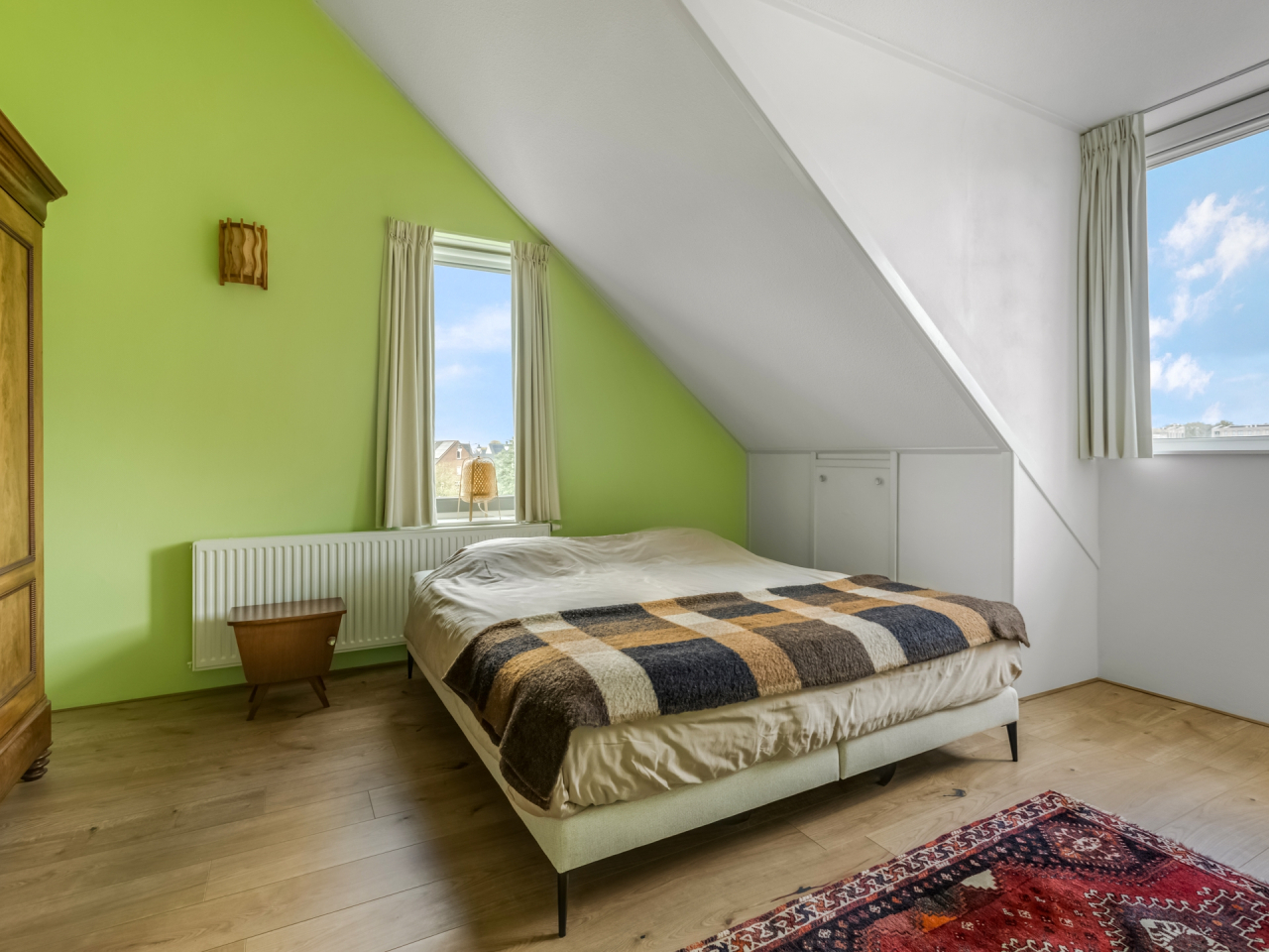 De hoofdslaapkamer is bijzonder royaal en heeft een prachtig hoge nok, een dakkapel, een raam in de zijgevel en extra bergruimte achter de knieschotten. De tweede slaapkamer, gelegen aan de achterzijde, is voorzien van een groot Velux dakraam en eveneens knieschotberging. Beide kamers zijn afgewerkt met een nette laminaatvloer.