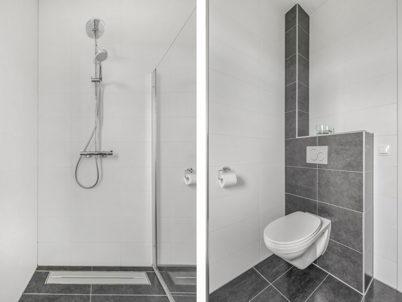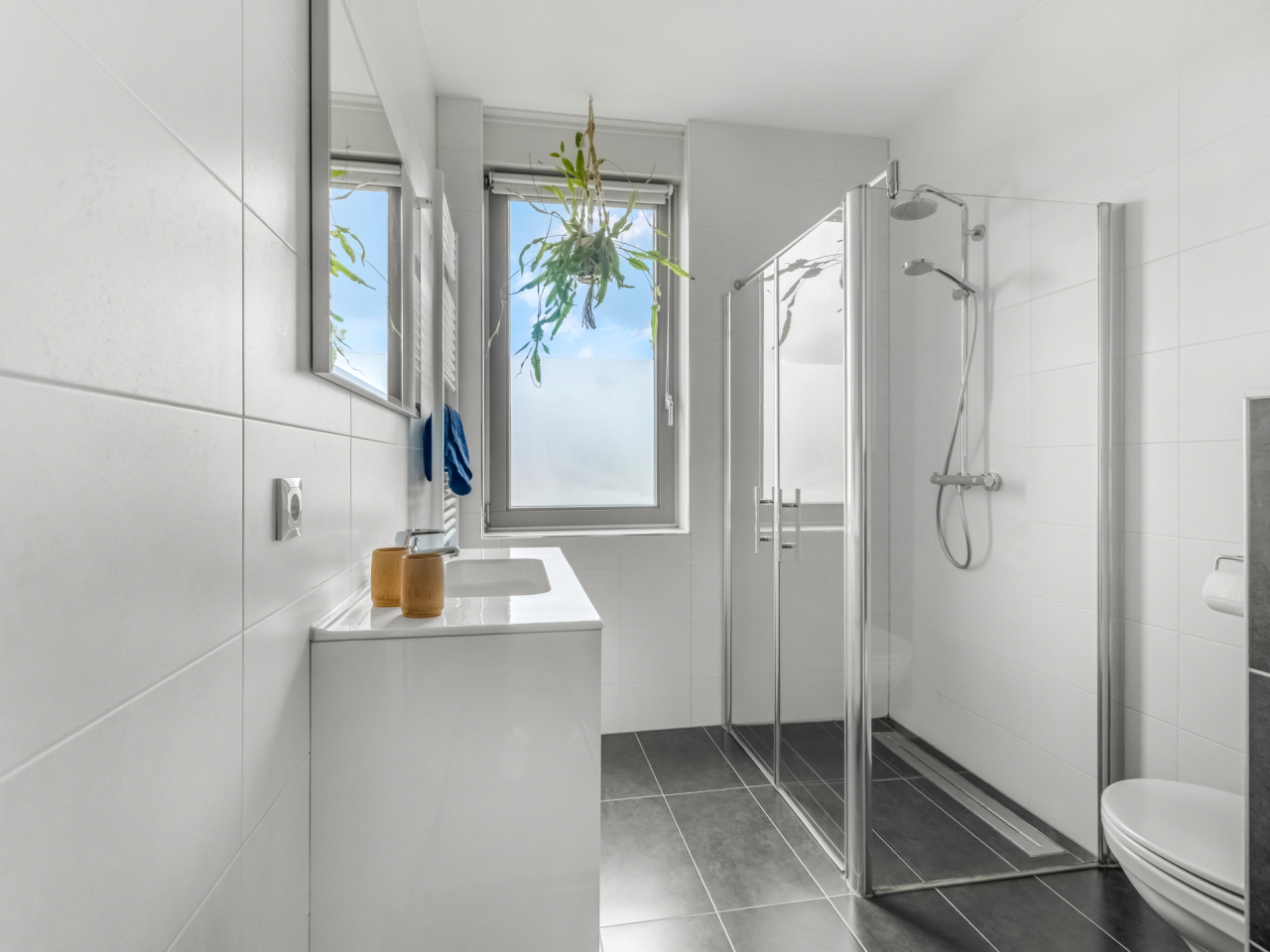 De badkamer is praktisch én stijlvol ingericht met een ruime douchecabine (hand- en regendouche), wastafelmeubel, zwevend toilet, handdoekradiator, mechanische ventilatie én een raam voor natuurlijk daglicht.