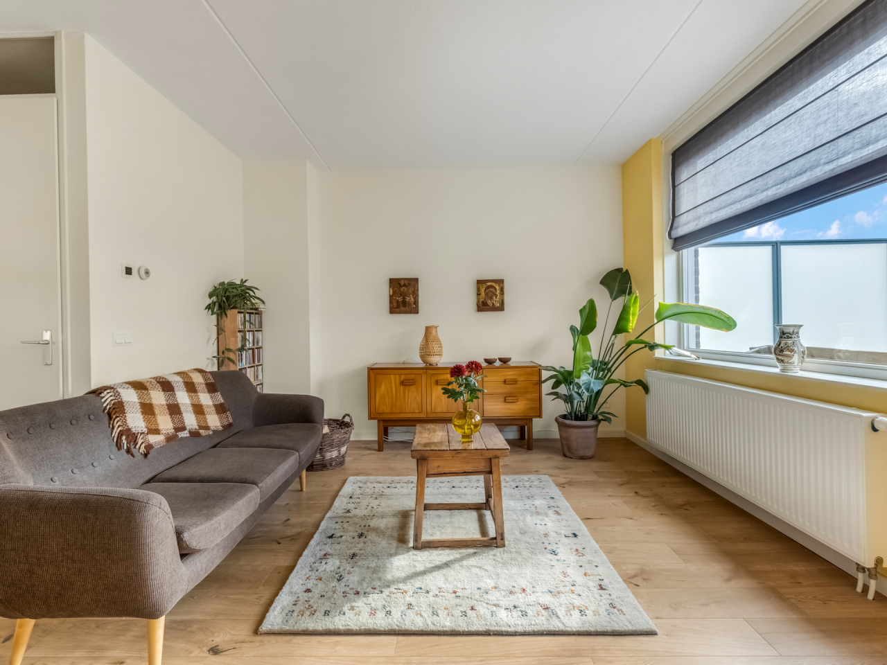 Ruime overloop met toegang tot de lichte en sfeervolle woonkamer, afgewerkt met een fraaie laminaatvloer. Dankzij de openslaande deur naar het dakterras en de grote ramen geniet je hier van een heerlijke lichtinval. Het zonnige dakterras (18 m²) is op het zuiden gelegen en voorzien van een elektrisch zonnescherm (2023) over de volle breedte — ideaal voor zowel zonaanbidders als schaduwliefhebbers. Het is een heerlijke plek om te ontspannen met een goed boek, vrienden te ontvangen of gewoon te genieten van de zon.