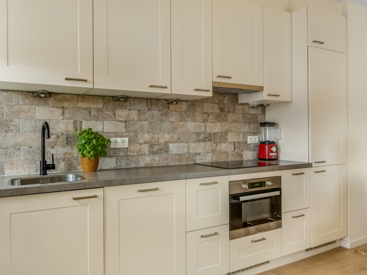 De open keuken in landelijke stijl is voorzien van alle gemakken: een inductiekookplaat, afzuigkap, combimagnetron, koel-vriescombinatie en volop opbergruimte.