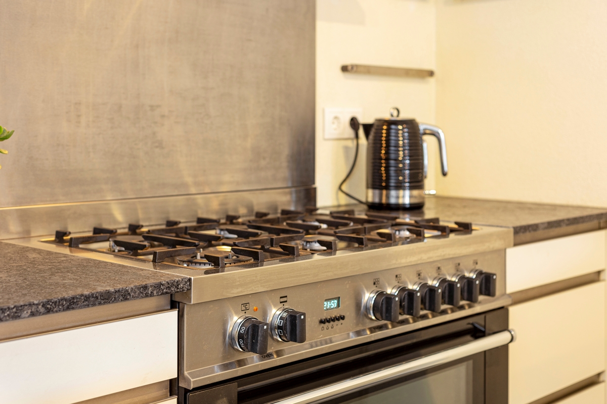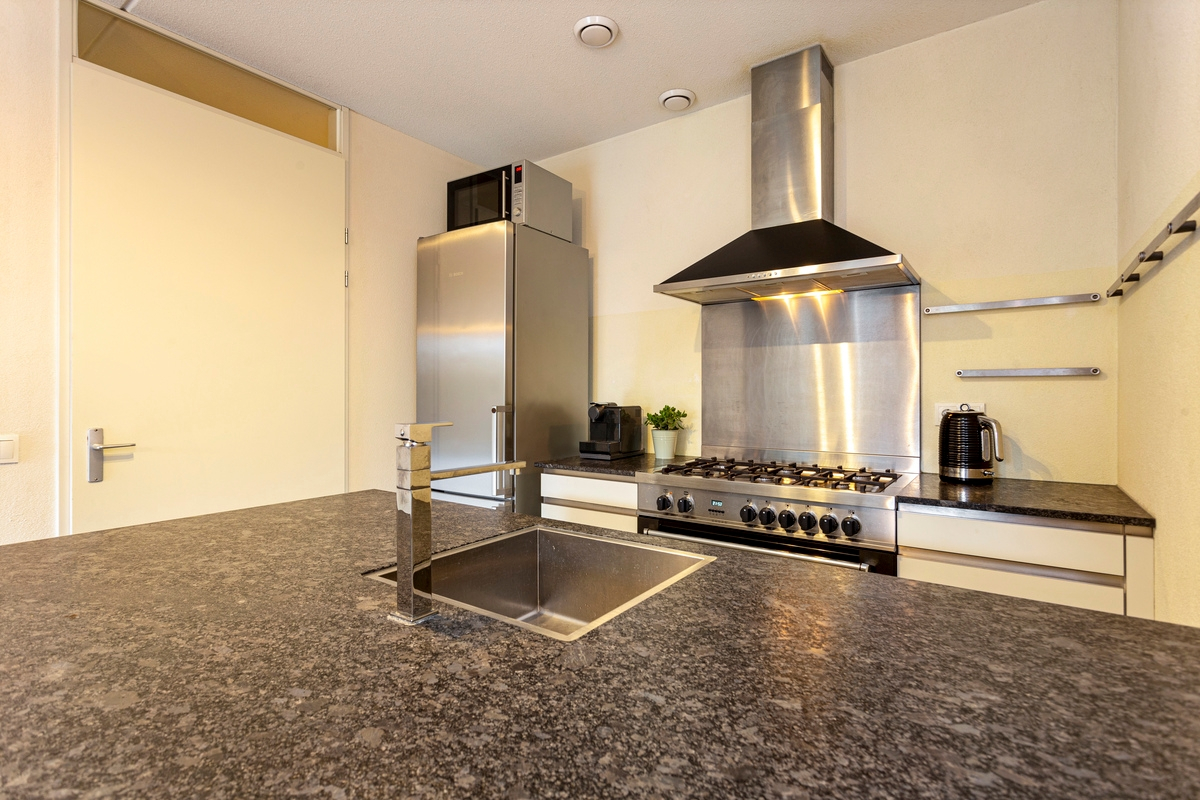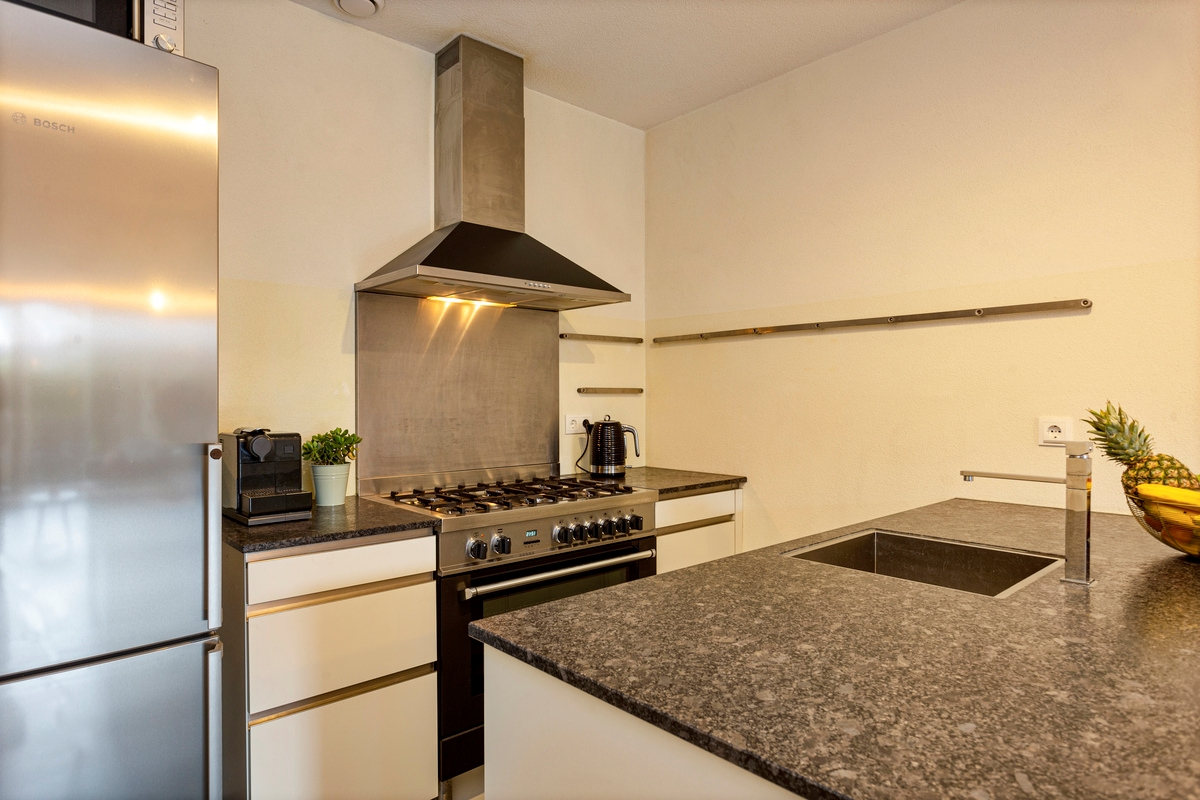 Lekker kokkerellen? De open keuken heeft alles wat u daarvoor nodig heeft. Deze is voorzien van een royaal werkblad, een breed fornuis met maar liefst 6 gaspitten en een grote oven, een afzuigkap, een losse koel/vries- combinatie (Bosch, ter overname), vaatwasser (Bosch) en voldoende opbergkasten met soft-close systeem. Aansluitend aan de keuken is de eethoek. Vanuit de lichte zithoek heeft u toegang tot de achtertuin en tot de tweede slaapkamer die voorzien is van een grote inbouwkast met schuifdeuren.
