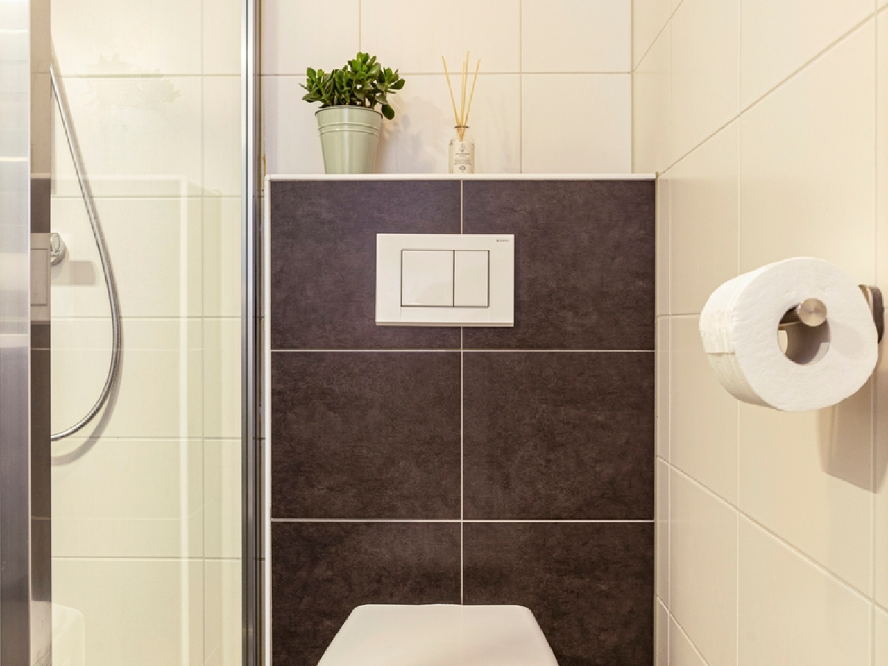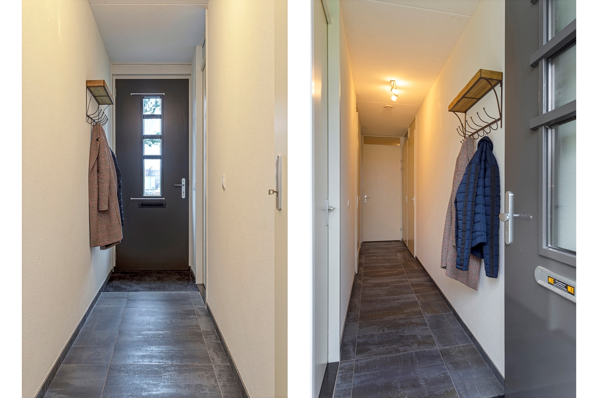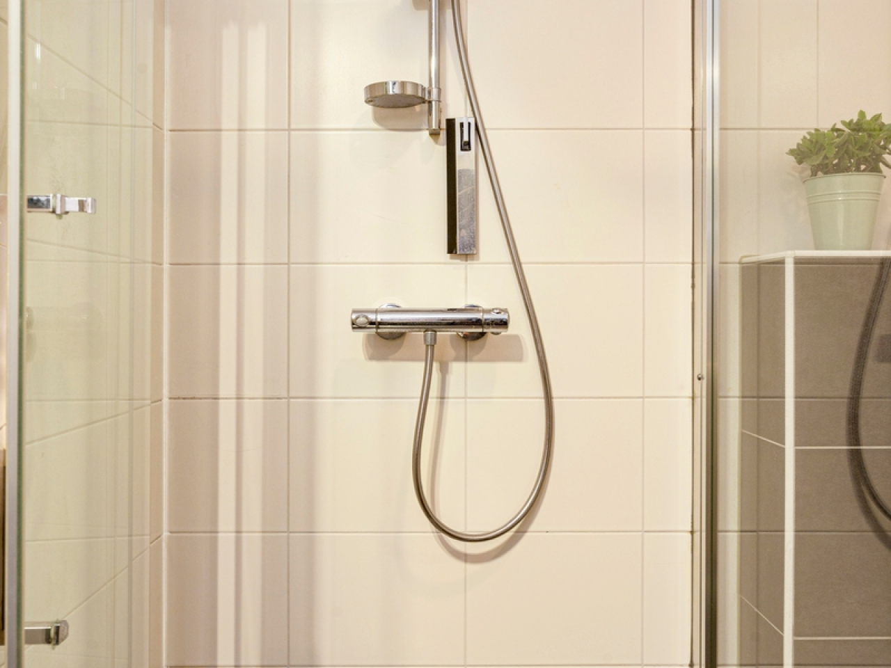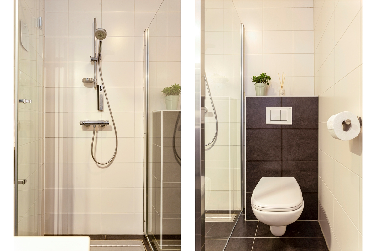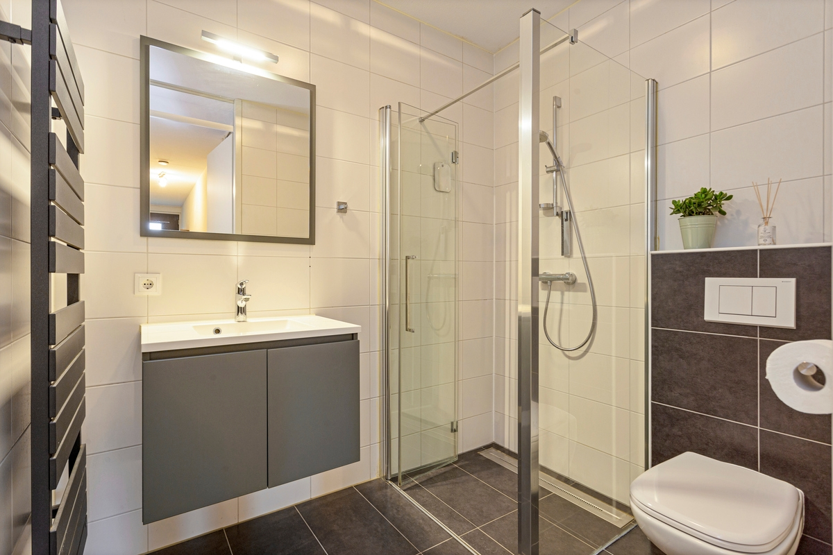 U komt het appartement binnen via een eigen entree van waaruit u de lange gang bereikt. Hier vindt u de moderne meterkast met voldoende groepen, een ruime trapkast met wasapparatuur aansluitingen, een technische ruimte met de CV-ketel (Intergas – 2013) en de ventilatie unit. De ruime ouderslaapkamer bevindt zich aan de koele noordkant van de woning. De moderne badkamer is volledig betegeld en voorzien van een wastafelmeubel, inloopdouche, hangend toilet, handdoekradiator en ventilatie. De woonkamer en keuken zijn voorzien van vloerverwarming.