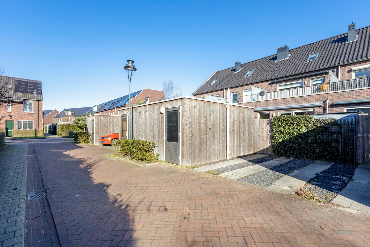 In de achtertuin bevindt zich een ruime vrijstaande houten berging voor fietsen en tuinspullen.