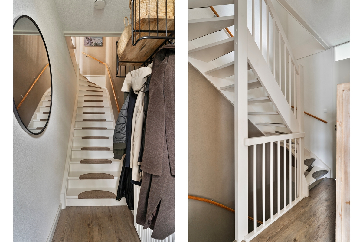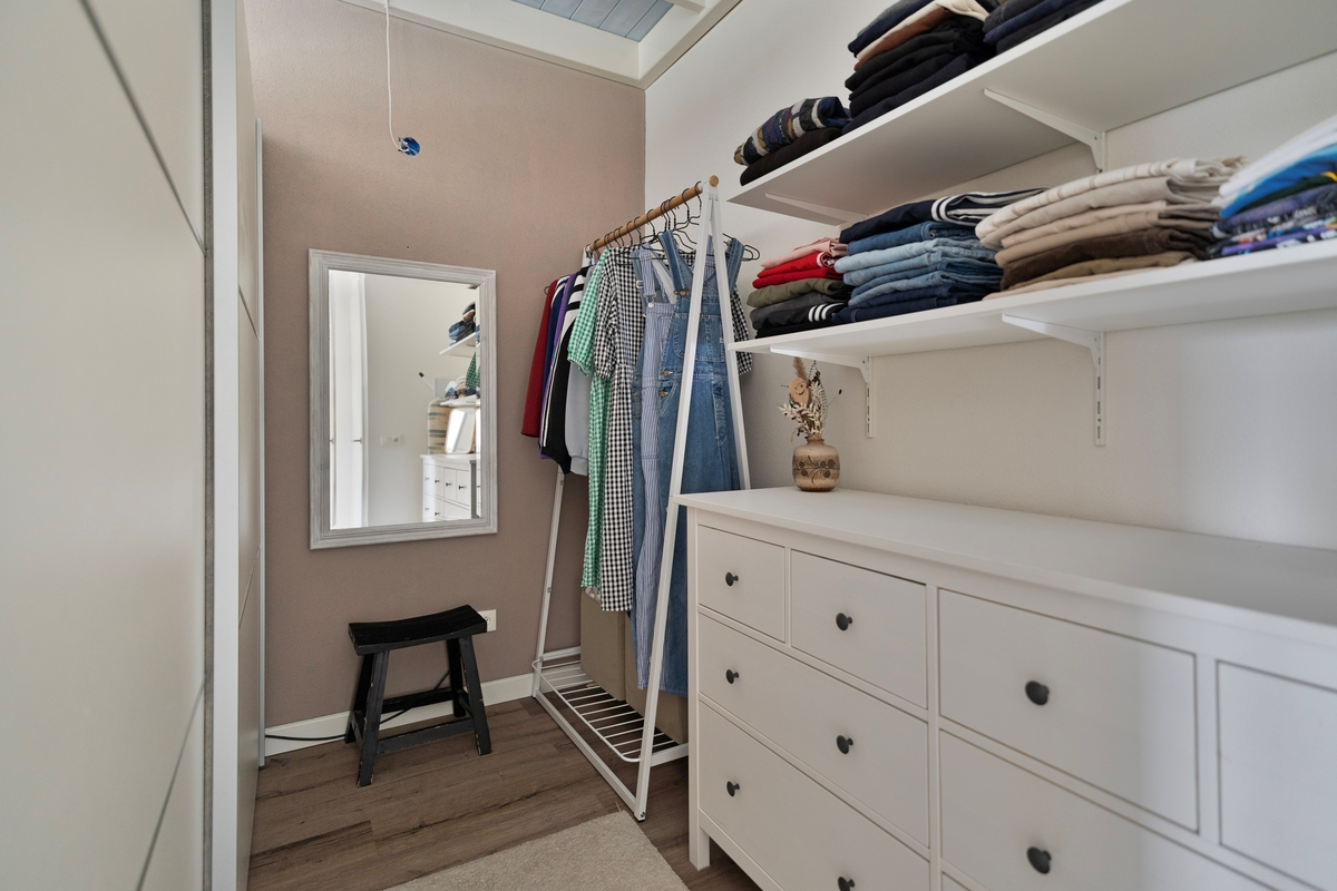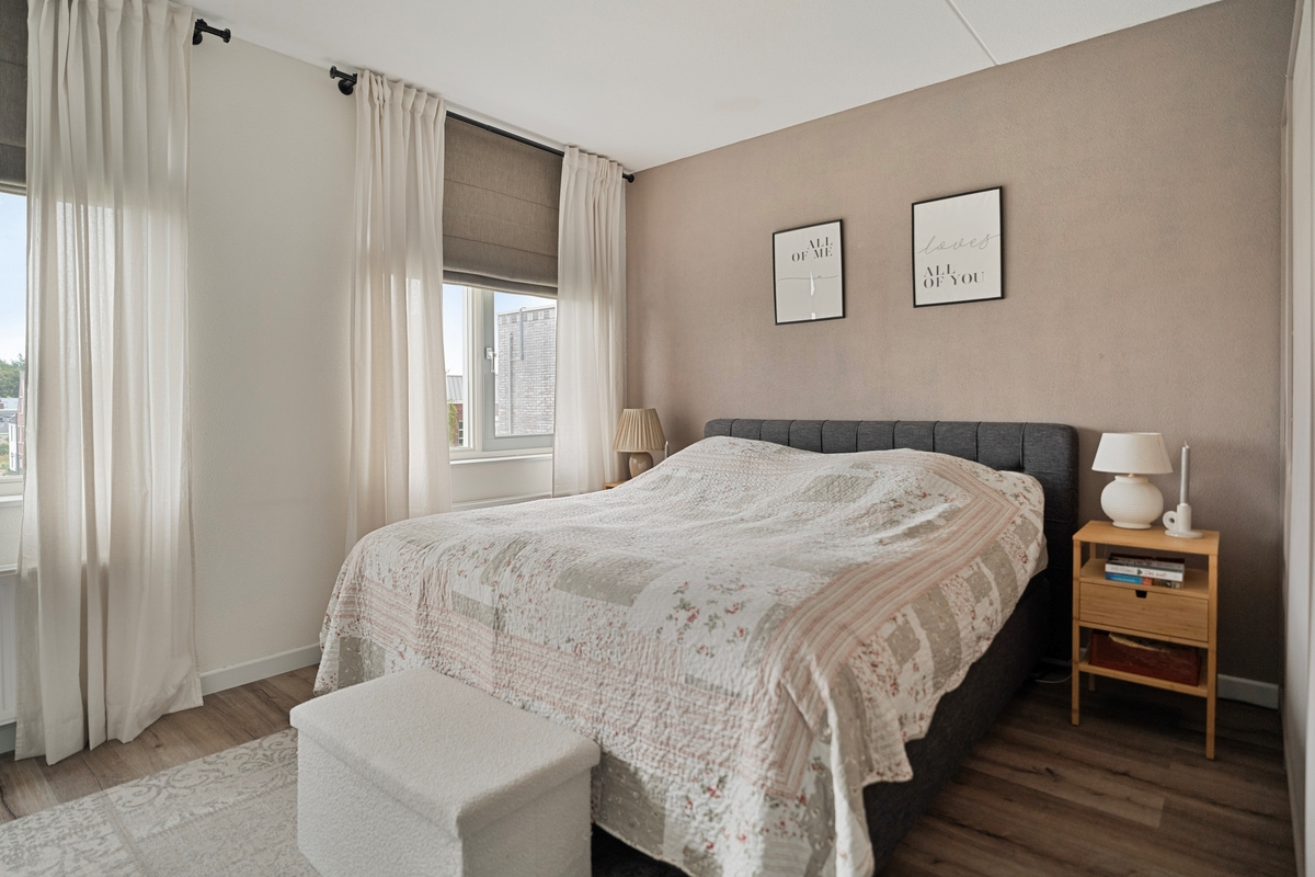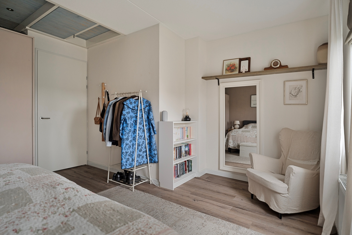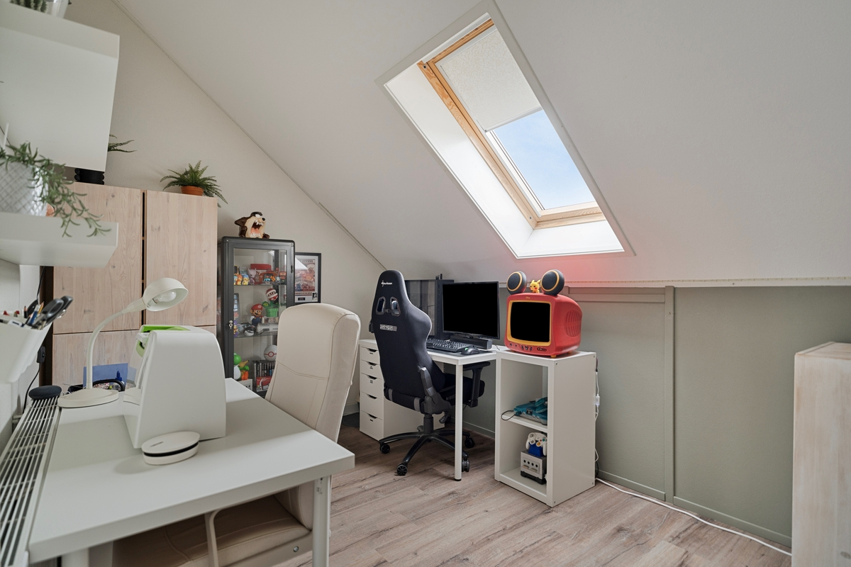 Overloop met toegang tot 2 slaapkamers, waarvan de grootste is voorzien van een inloopkast. De 2e slaapkamer is aan de achterzijde gelegen en voorzien van een groot Velux dakraam. Deze kamer is momenteel in gebruik als werkkamer. Beide slaapkamers hebben een mooie laminaatvloer.