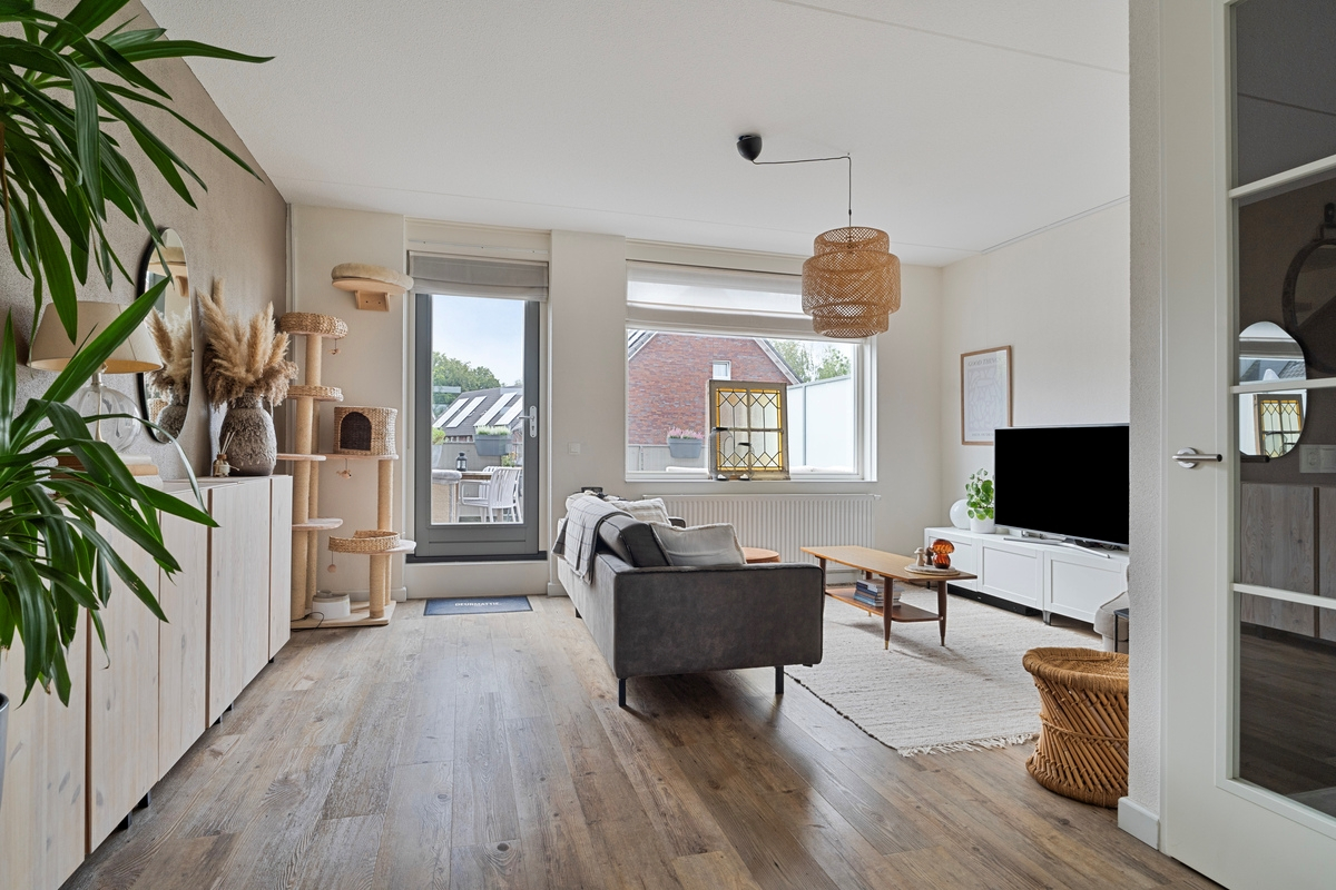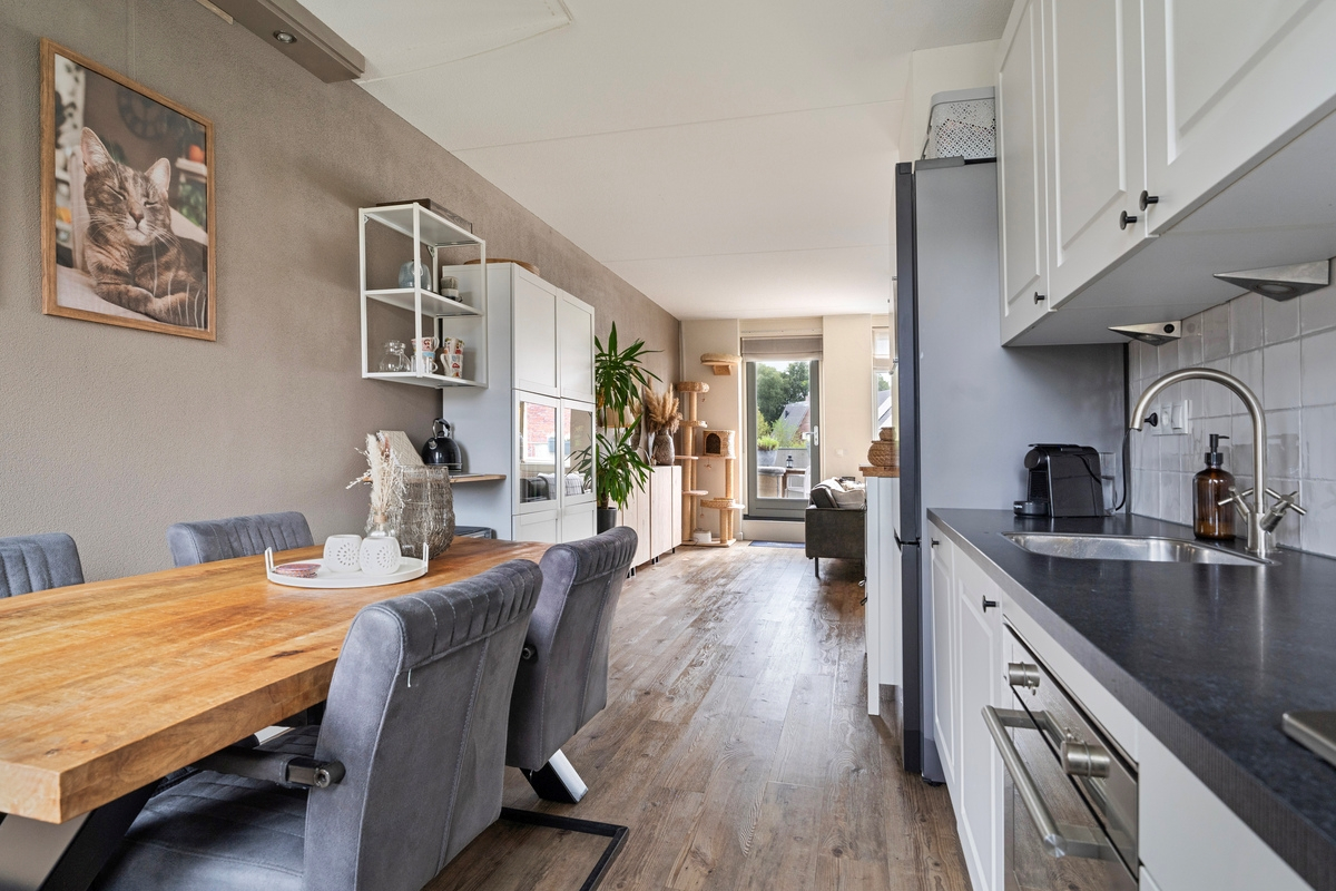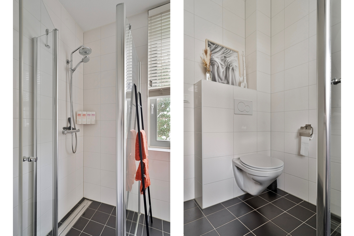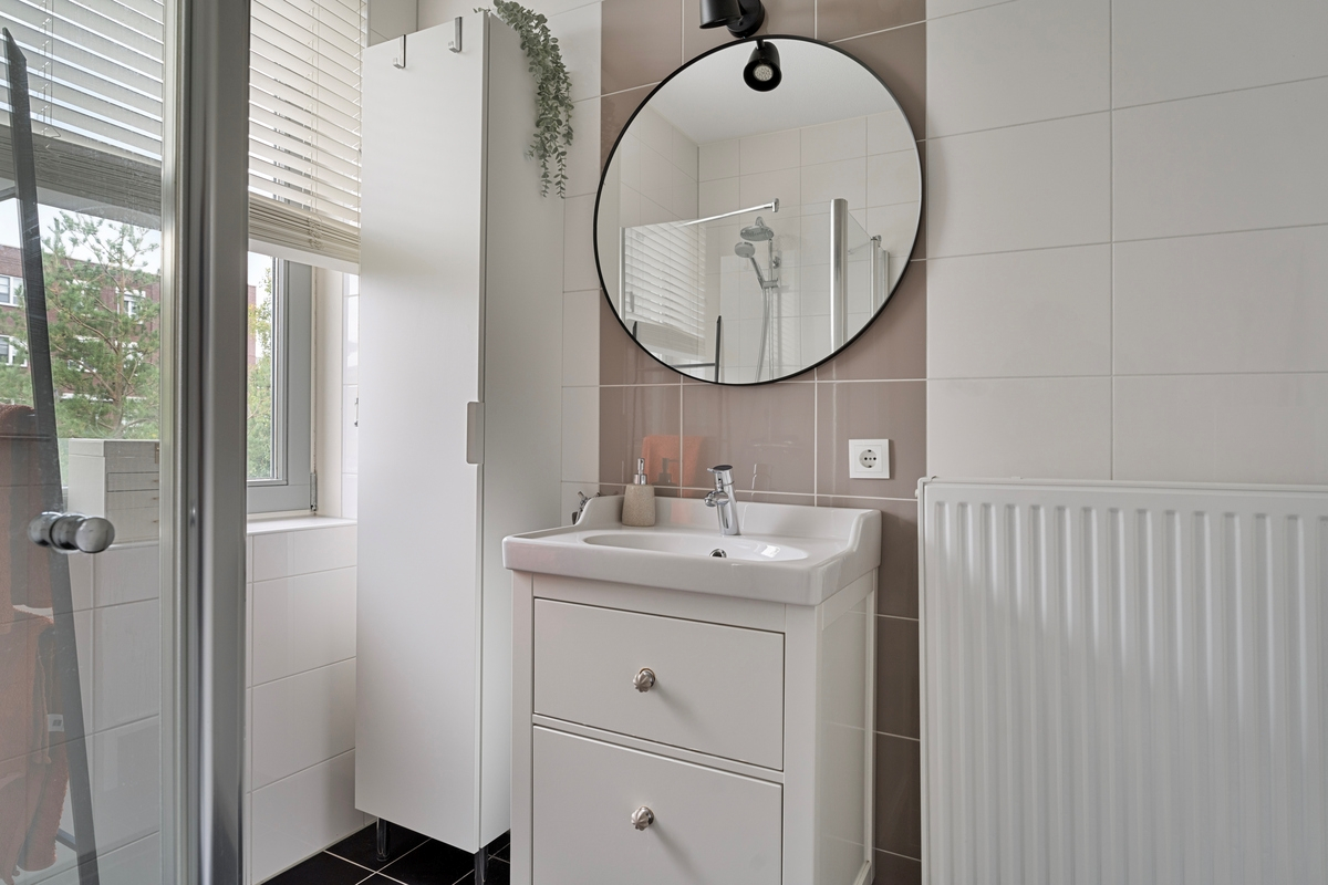 Overloop met laminaatvloer, moderne meterkast (6 groepen en dubbele aardlekschakelaar) en toegang tot de woonkamer en keuken. Deze beschikt over een lichte wandafwerking, PVC vloer en een deur naar het dakterras. Het dakterras is 20 m2 groot en op het zonnige zuiden gelegen. Aan de gevel is een breed zonnescherm aanwezig, zodat er op warme dagen ook heerlijk in de schaduw gezeten kan worden. De complete en open keuken in landelijke stijl is uitgerust met een vaatwasser, combi-oven met magnetron functie, 5-pits gaskookplaat, afzuigkap en ruimte om een koel/vriescombinatie te plaatsen. De badkamer bevindt zich eveneens op deze etage en is uitgerust met een glazen douchecabine met thermostaat kraan, wastafelmeubel, zwevend toilet en radiator. Daarnaast is de badkamer volledig betegeld.
