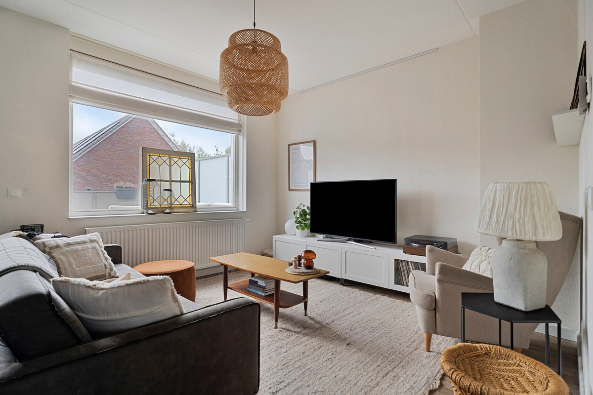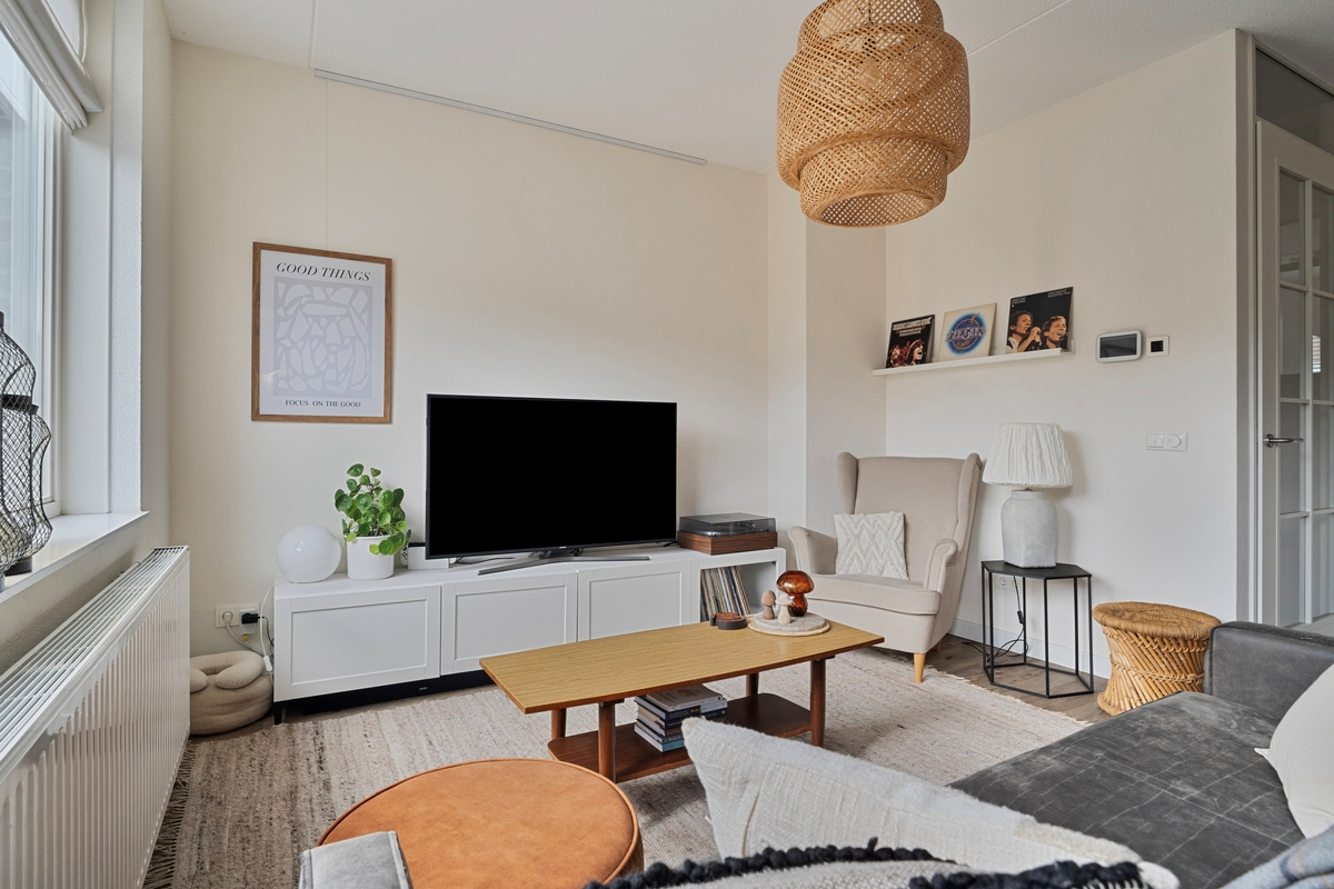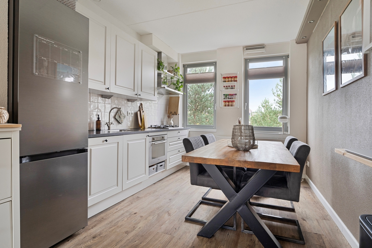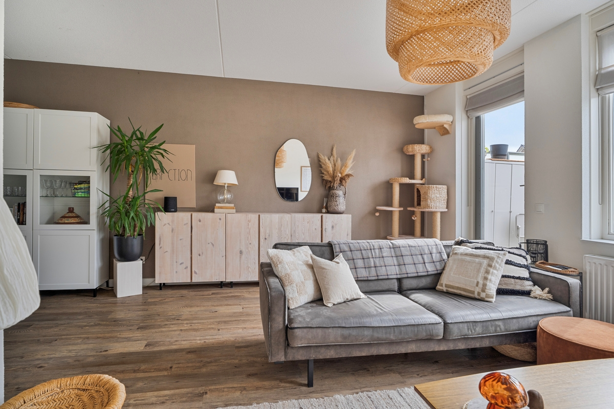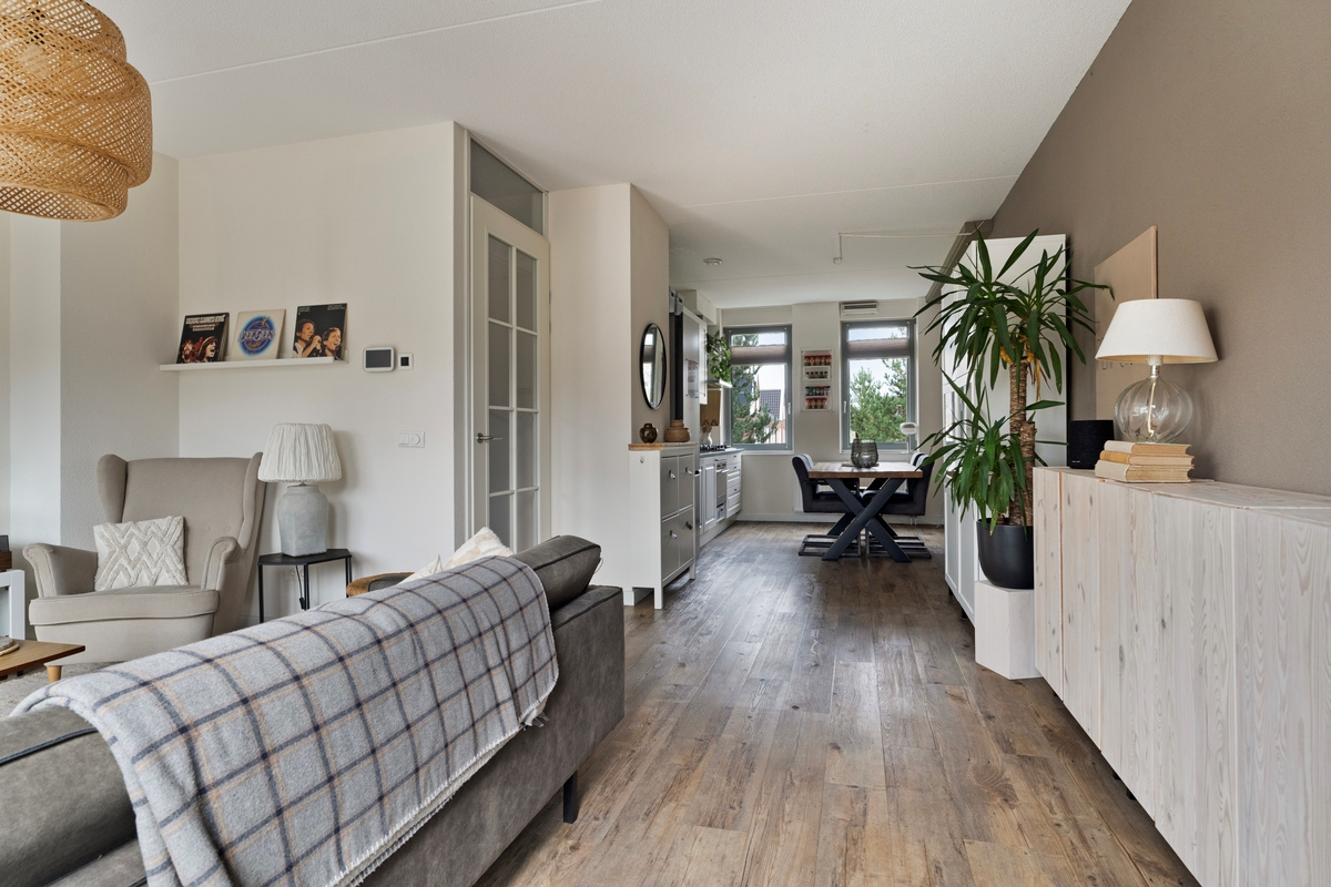 Overloop met laminaatvloer, moderne meterkast (6 groepen en dubbele aardlekschakelaar) en toegang tot de woonkamer en keuken. Deze beschikt over een lichte wandafwerking, PVC vloer en een deur naar het dakterras. Het dakterras is 20 m2 groot en op het zonnige zuiden gelegen. Aan de gevel is een breed zonnescherm aanwezig, zodat er op warme dagen ook heerlijk in de schaduw gezeten kan worden. De complete en open keuken in landelijke stijl is uitgerust met een vaatwasser, combi-oven met magnetron functie, 5-pits gaskookplaat, afzuigkap en ruimte om een koel/vriescombinatie te plaatsen. De badkamer bevindt zich eveneens op deze etage en is uitgerust met een glazen douchecabine met thermostaat kraan, wastafelmeubel, zwevend toilet en radiator. Daarnaast is de badkamer volledig betegeld.