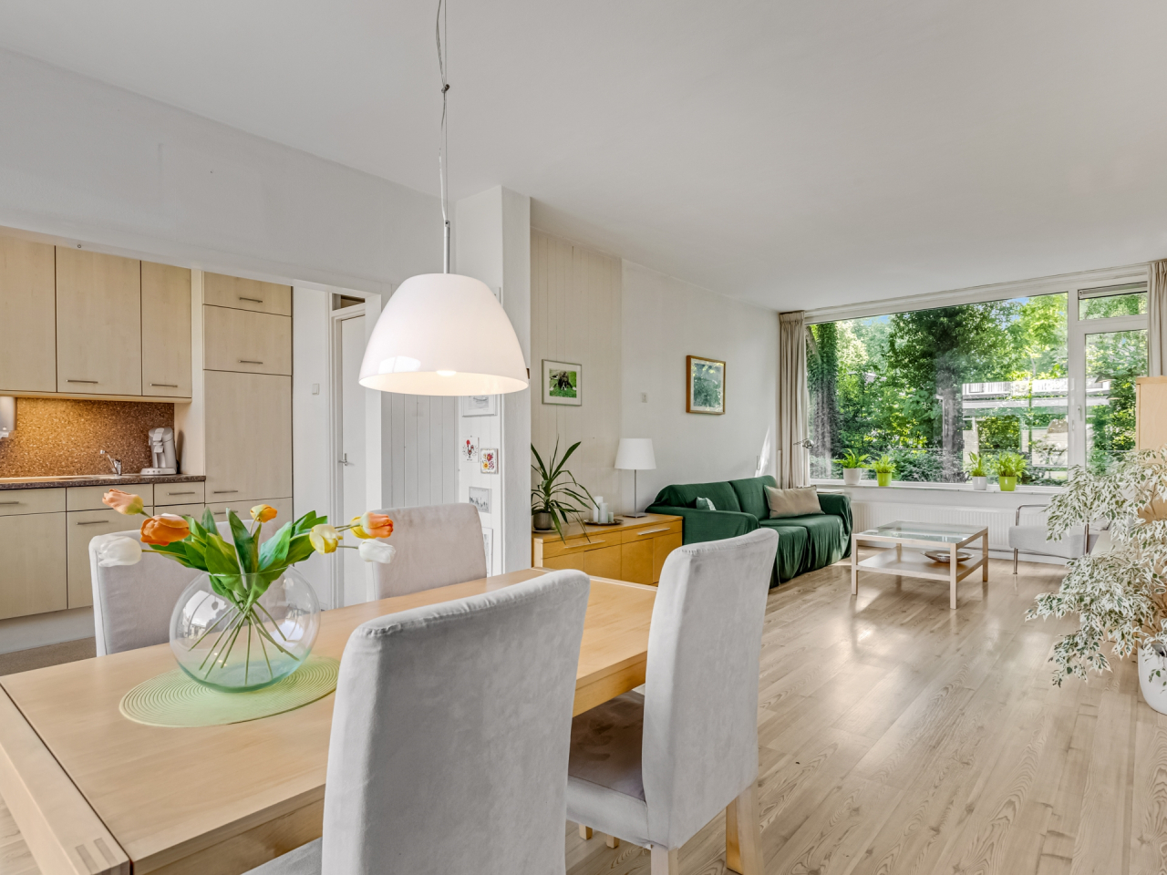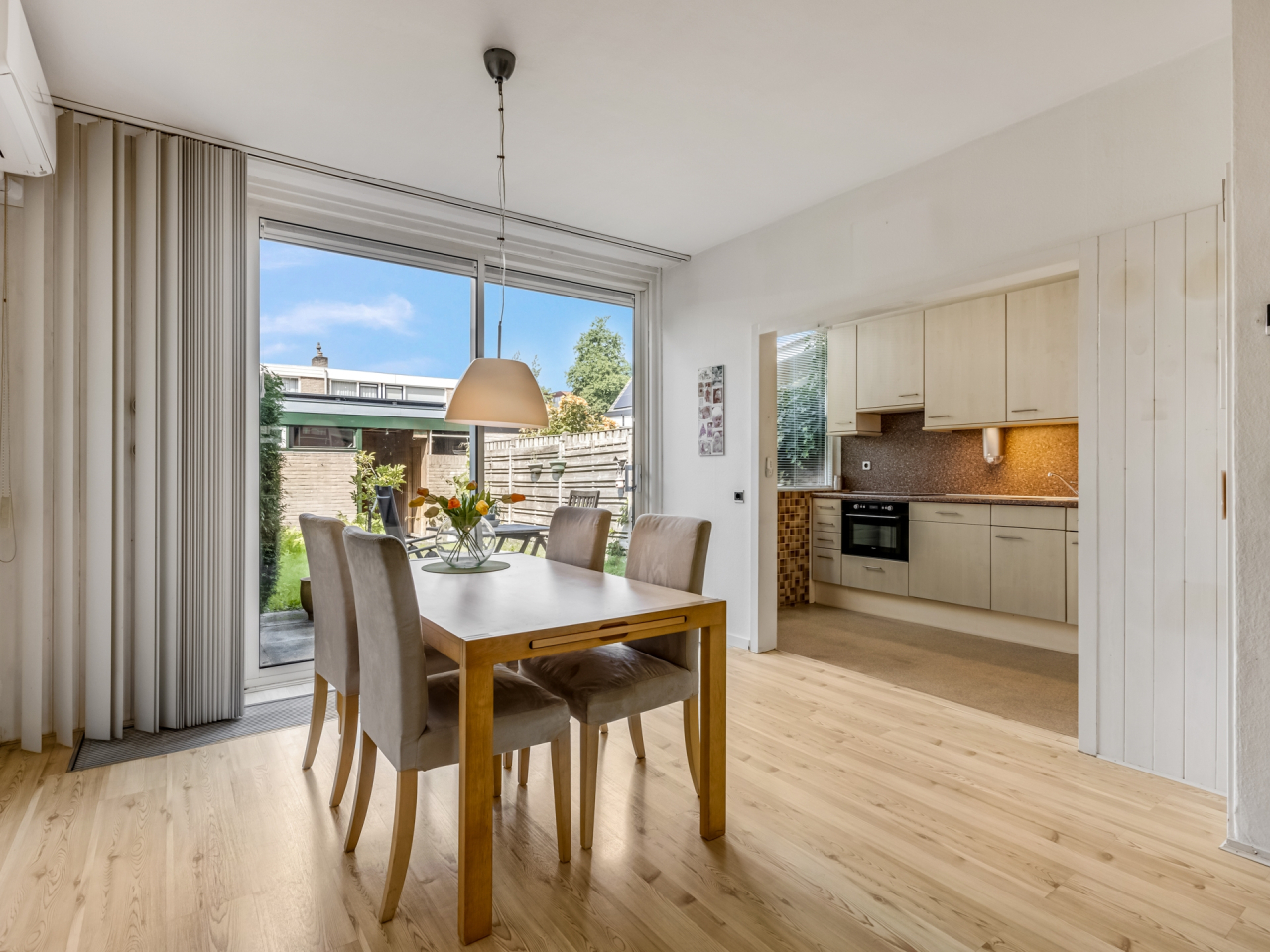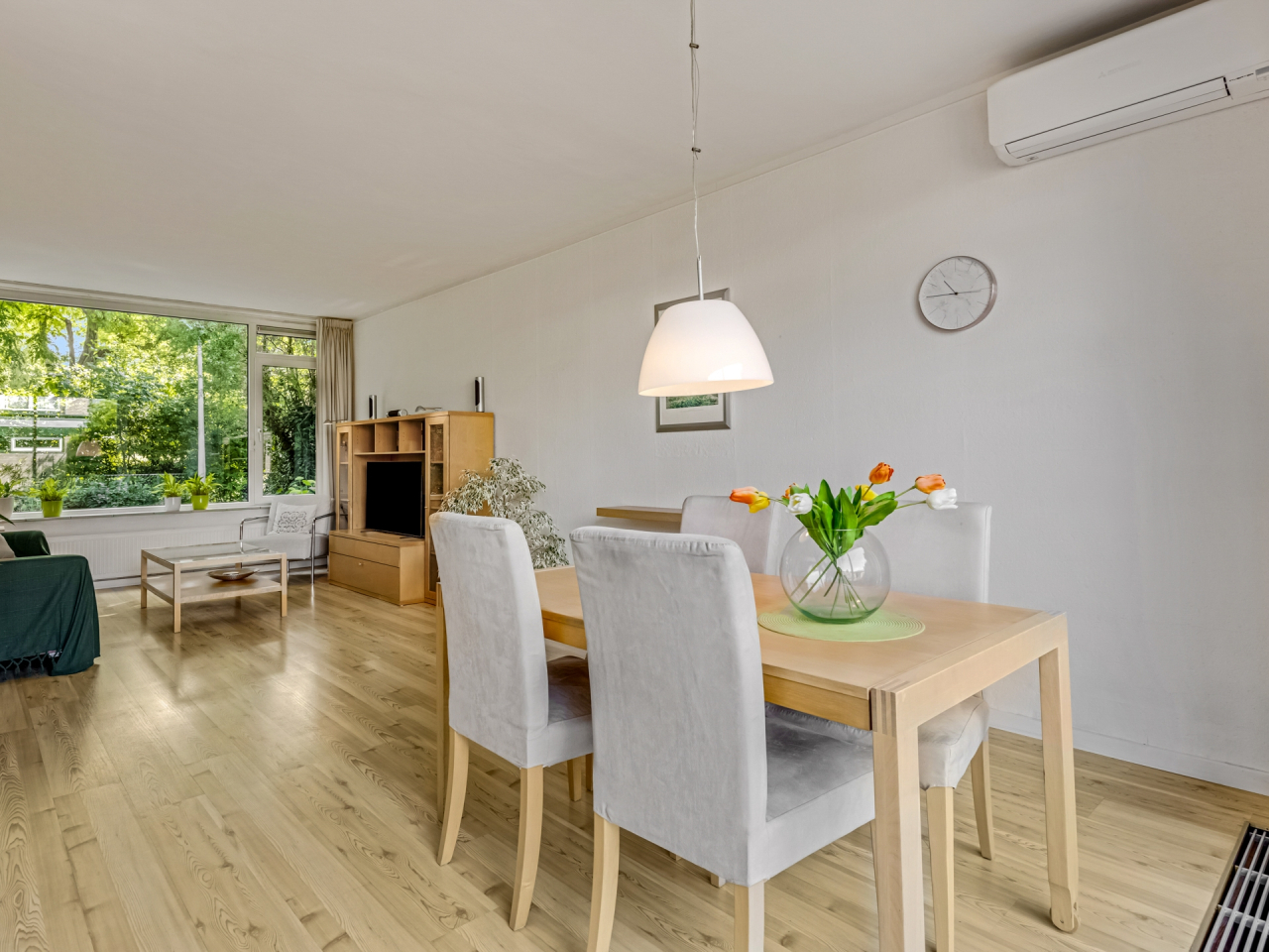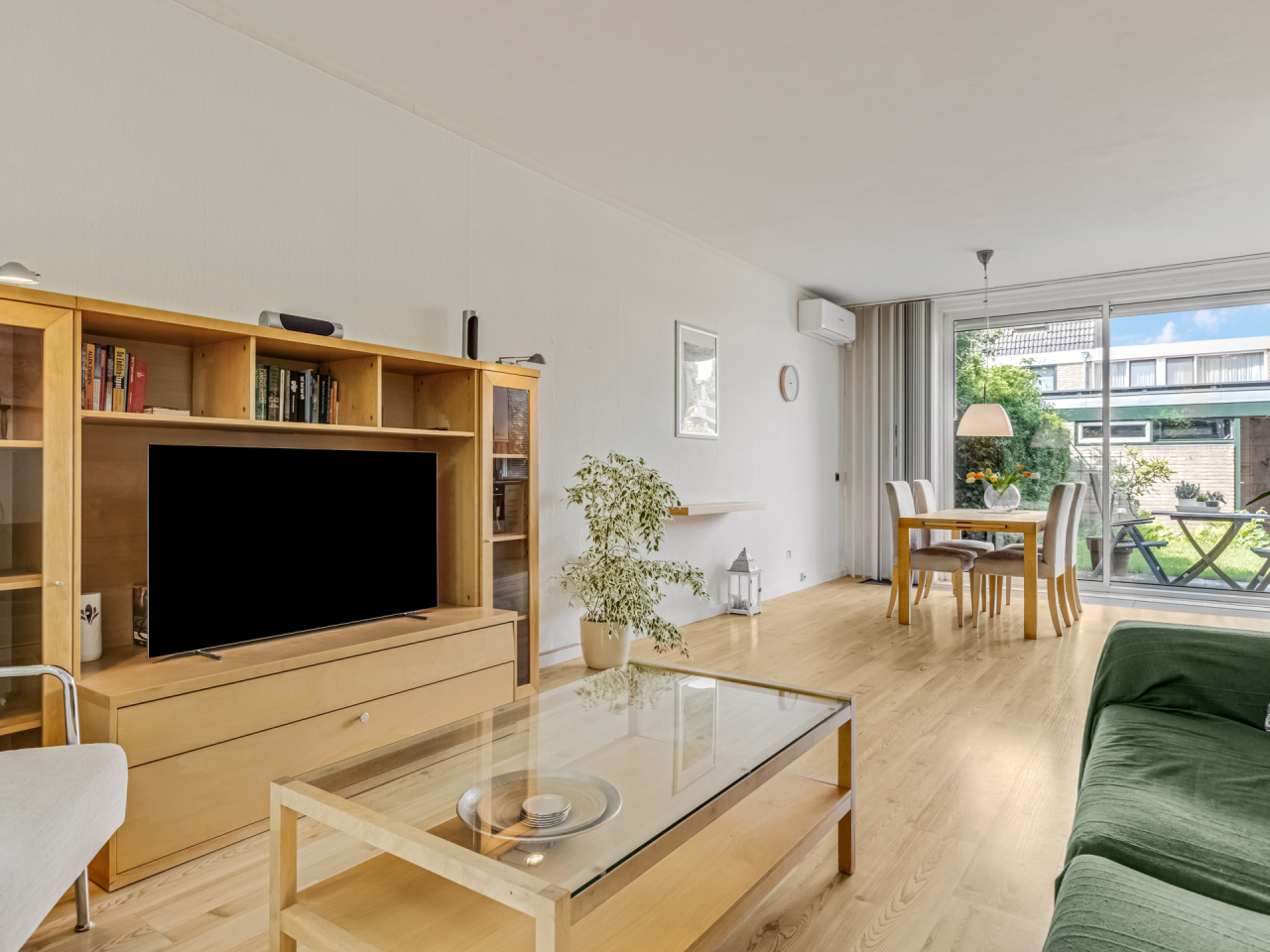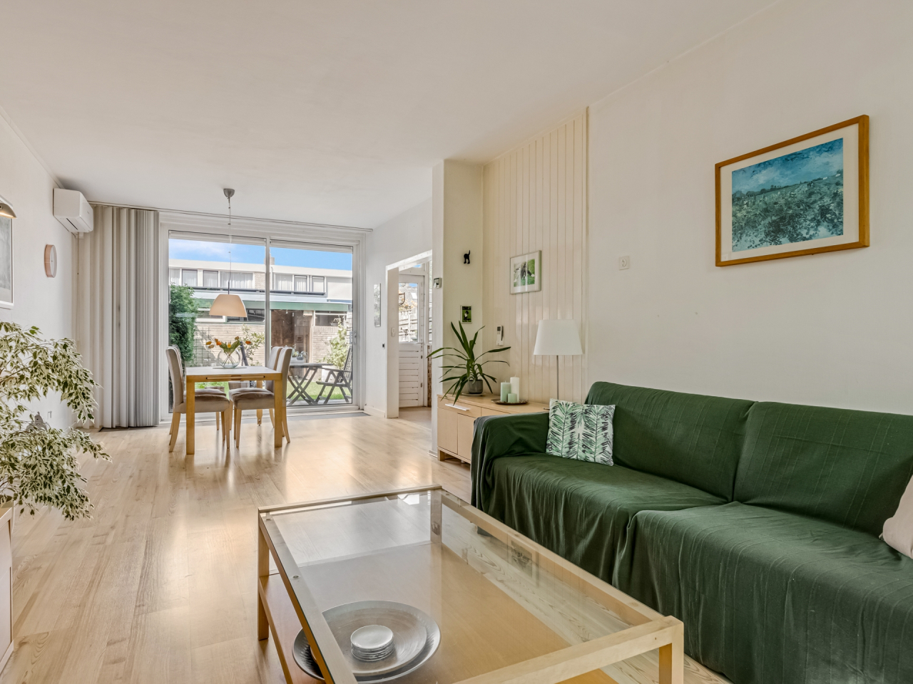 Voorportaal met meterkast, hal met toilet en fonteintje, trapkast en trapopgang. Halfopen keuken met diverse inbouwapparatuur en een ruime lichte woonkamer. De woonkamer is voorzien van een lichte laminaatvloer en airconditioning. Via de achterdeur of de schuifpui is de zonnige achtertuin op het zuidwesten bereikbaar.