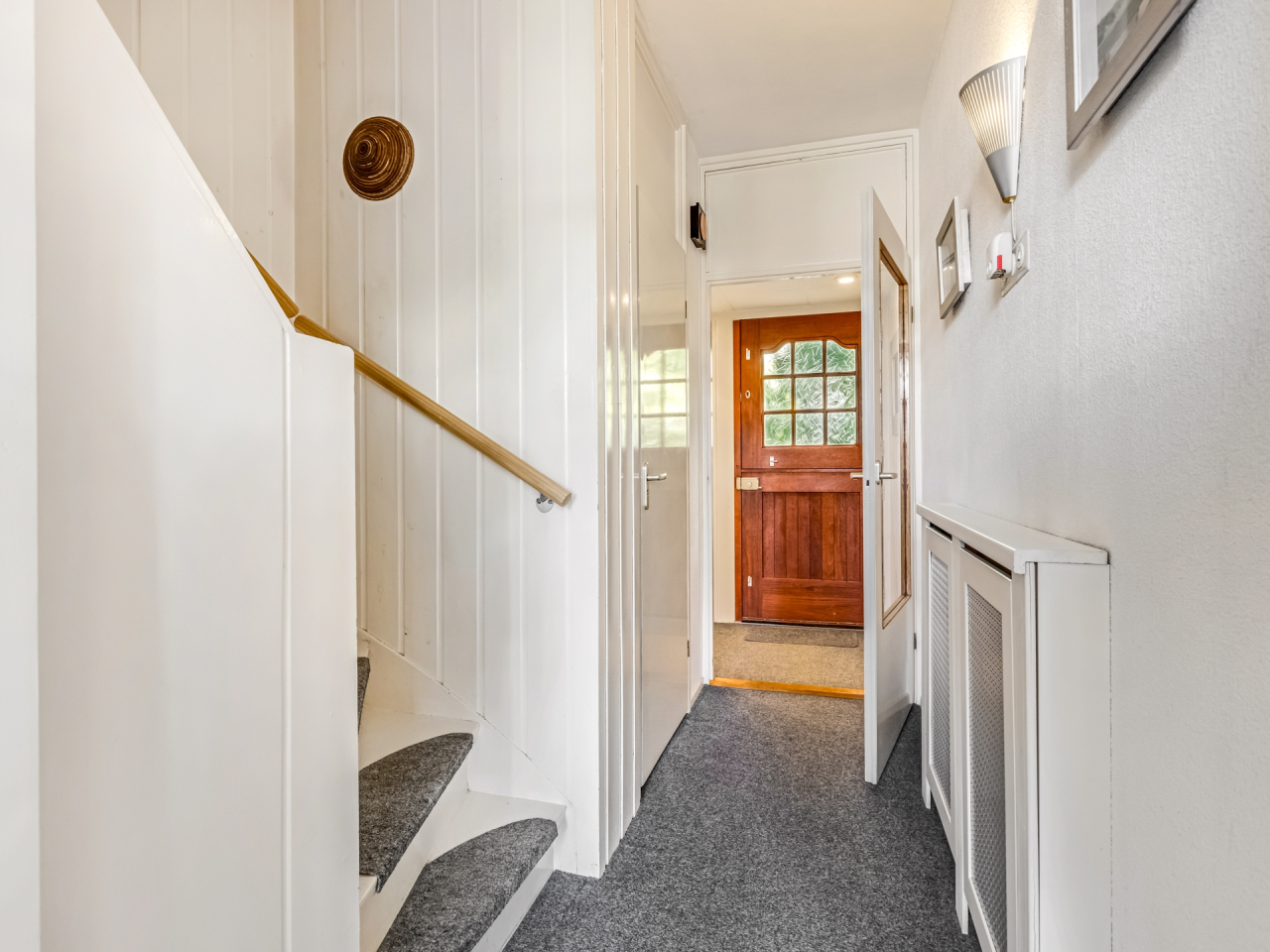 Overloop met toegang tot drie slaapkamers van een goed formaat. De master bedroom aan de voorzijde is ruim en licht door de grote raampartij. De 2e kamer aan de voorzijde is wat kleiner en heeft een inbouwkast. Aan de achterzijde is nu 1 grote slaapkamer, die makkelijk terug te brengen is naar 2 slaapkamers. De nette badkamer is voorzien van een douchecabine, wastafelmeubel en handdoekradiator.