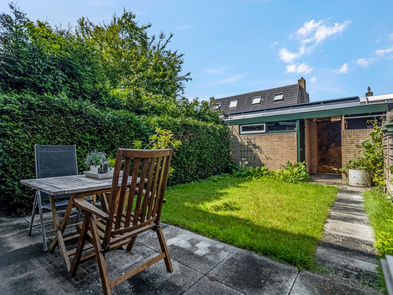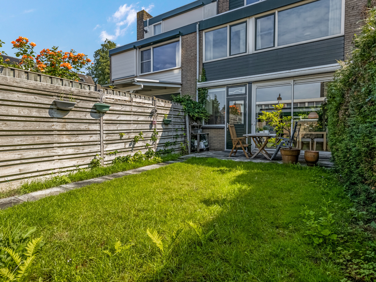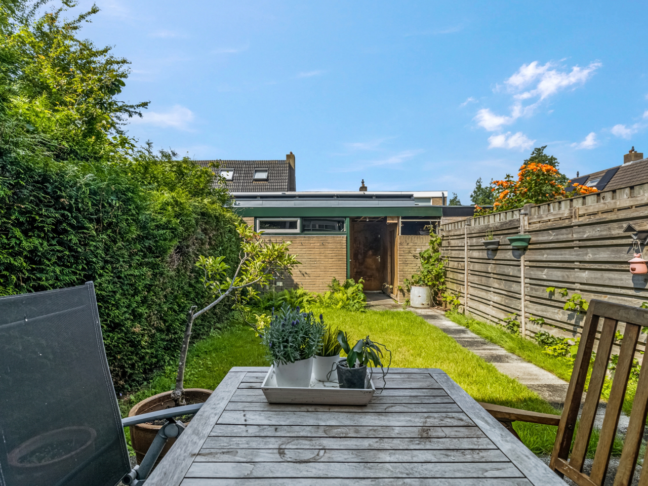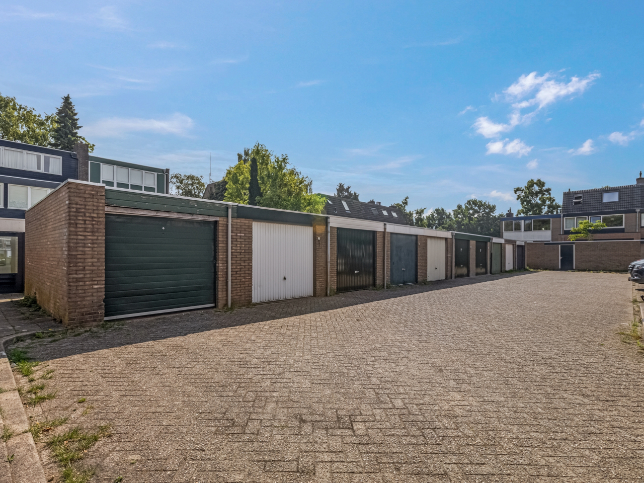 De voortuin kijkt uit op een groenstrook en de groene achtertuin ligt op het zuidwesten. Hier is het heerlijk genieten van de middag- en avondzon. Achter in de tuin is er een vrijstaande stenen berging en een achterom van waaruit u ook naar de garagebox kunt lopen. De garagebox ligt op de linkerhoek van een rij garageboxen.