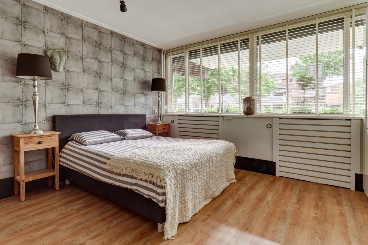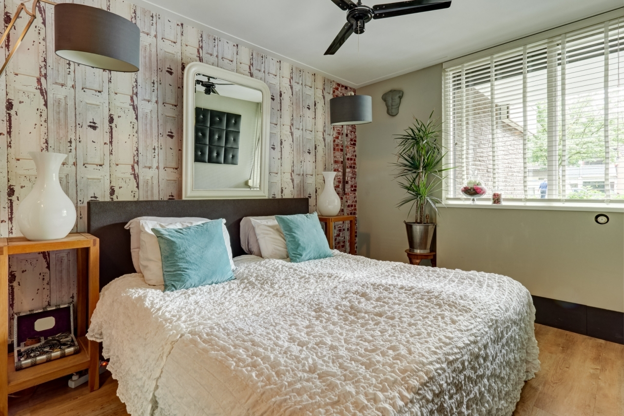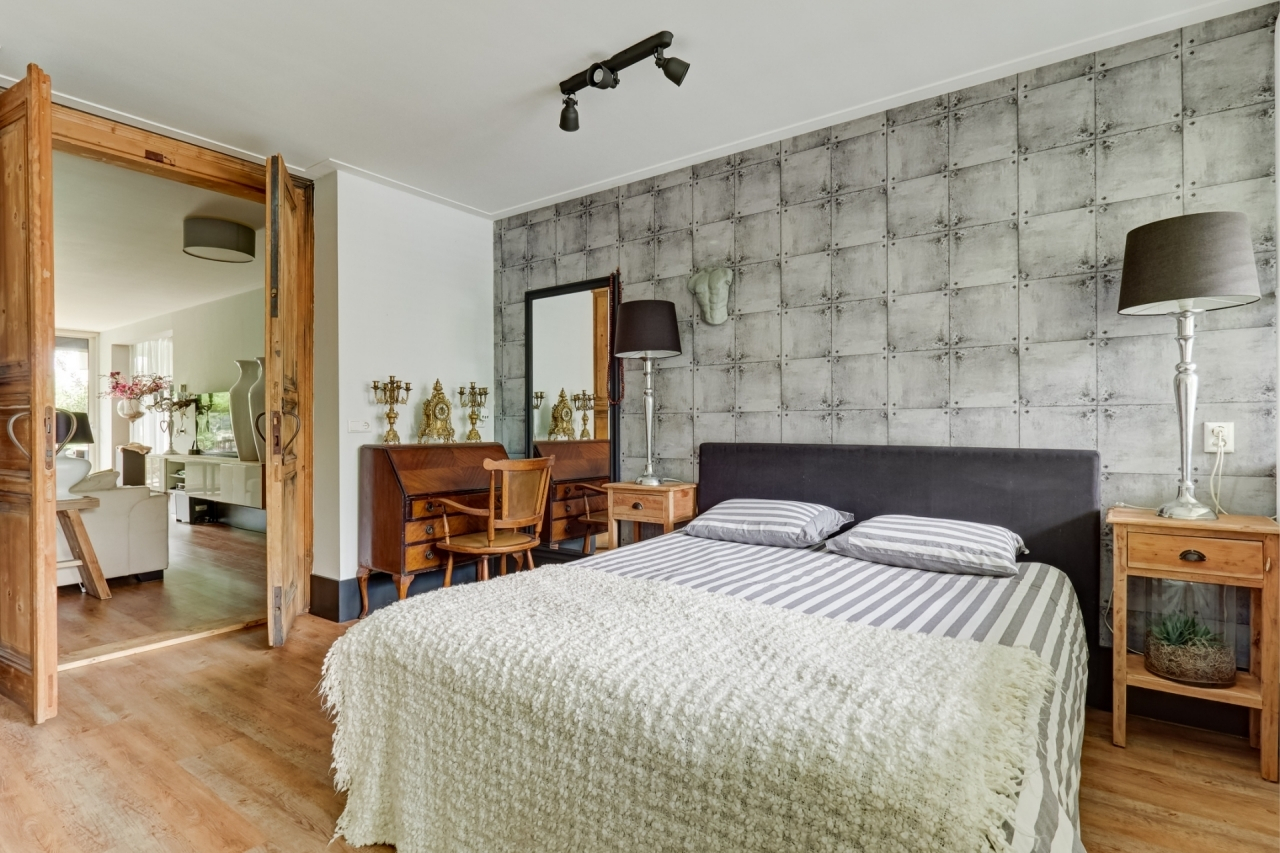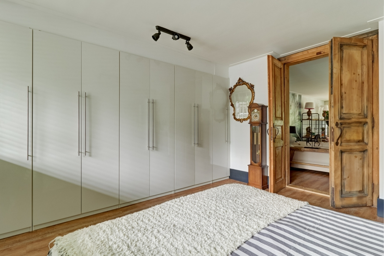 Royale woonkamer met mooie PVC vloer in gedekte tint, elektrisch bedienbare zonneschermen en schuifpui naar de ruime en fraai aangelegde achtertuin op het westen. Vanuit de woonkamer is via twee prachtige antieke openslaande deuren, welke rechtstreekse afkomstig zijn uit een Frans “maison de maître” (herenhuis), de tweede ruime slaapkamer met kastenwand bereikbaar. Een echte eyecatcher!