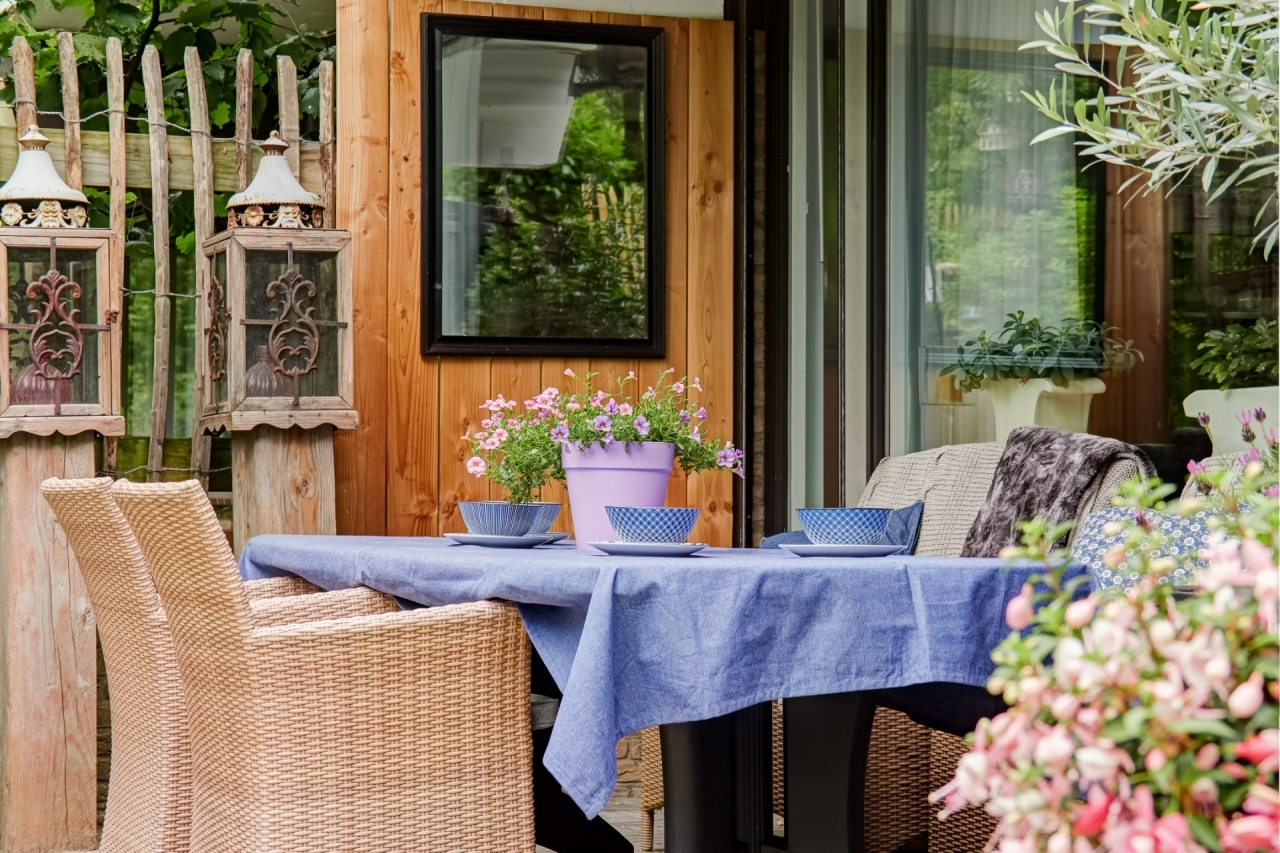 - Fraai aangelegde achtertuin op het westen en voorzien van elektra, zonneschermen en twee