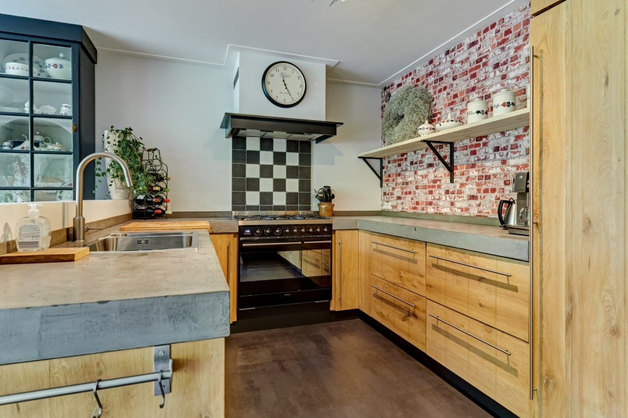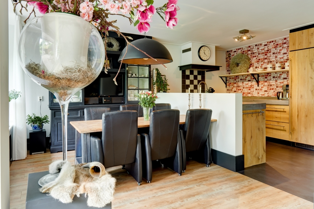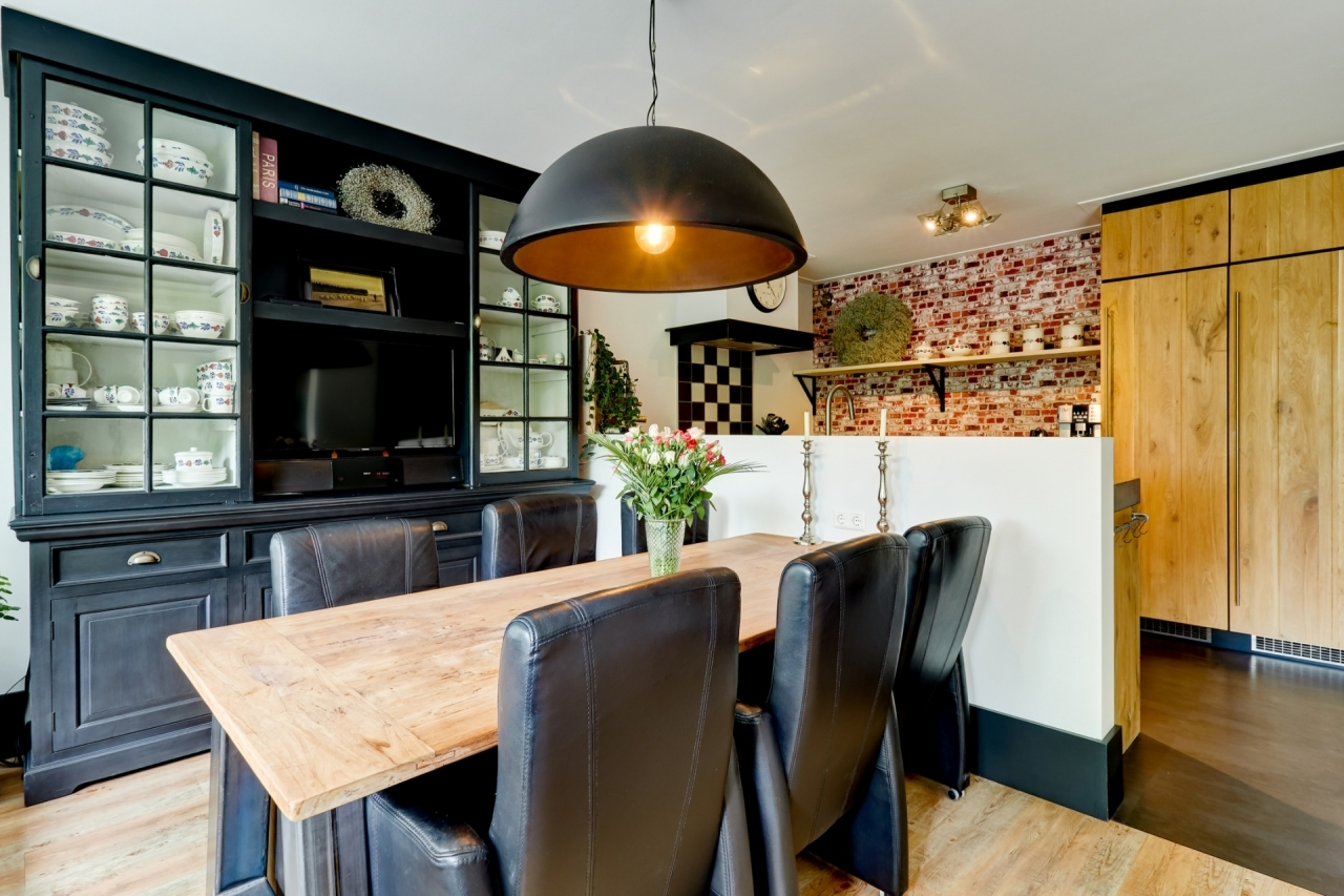 In de verlenging van de woonkamer bevindt zich een half open keuken welke is voorzien van alle gemakken waaronder een beton look blad, 6 pits gasfornuis met wok brander, schouw met afzuigkap, twee ovens, grote koelkast en separate vriezer (7 laden). Aansluitend aan de keuken is een ruim eetgedeelte te vinden waar het lekker Bourgondisch genieten is met vrienden of familie.