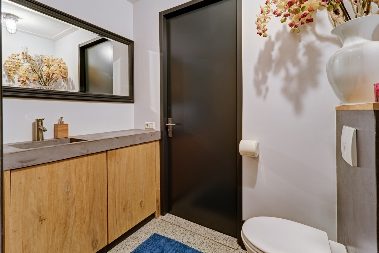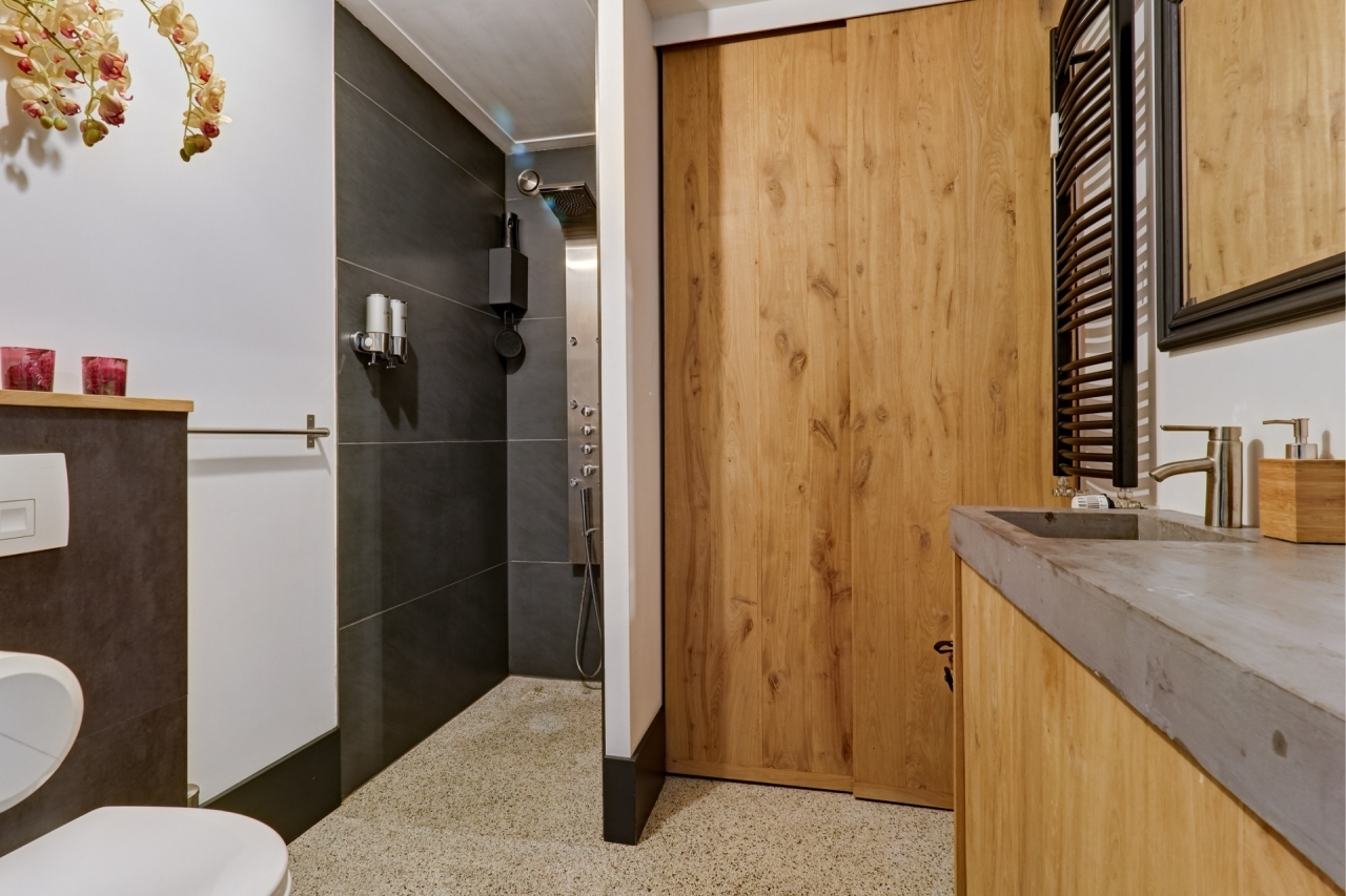 Eigen entree met videofoon installatie, hal met garderobe die toegang biedt tot een toilet met fonteintje, een luxe badkamer met granito vloer, wastafel, inloopdouche met stort/handdouche en bodyjets. Eerste ruime slaapkamer met kastenwand.